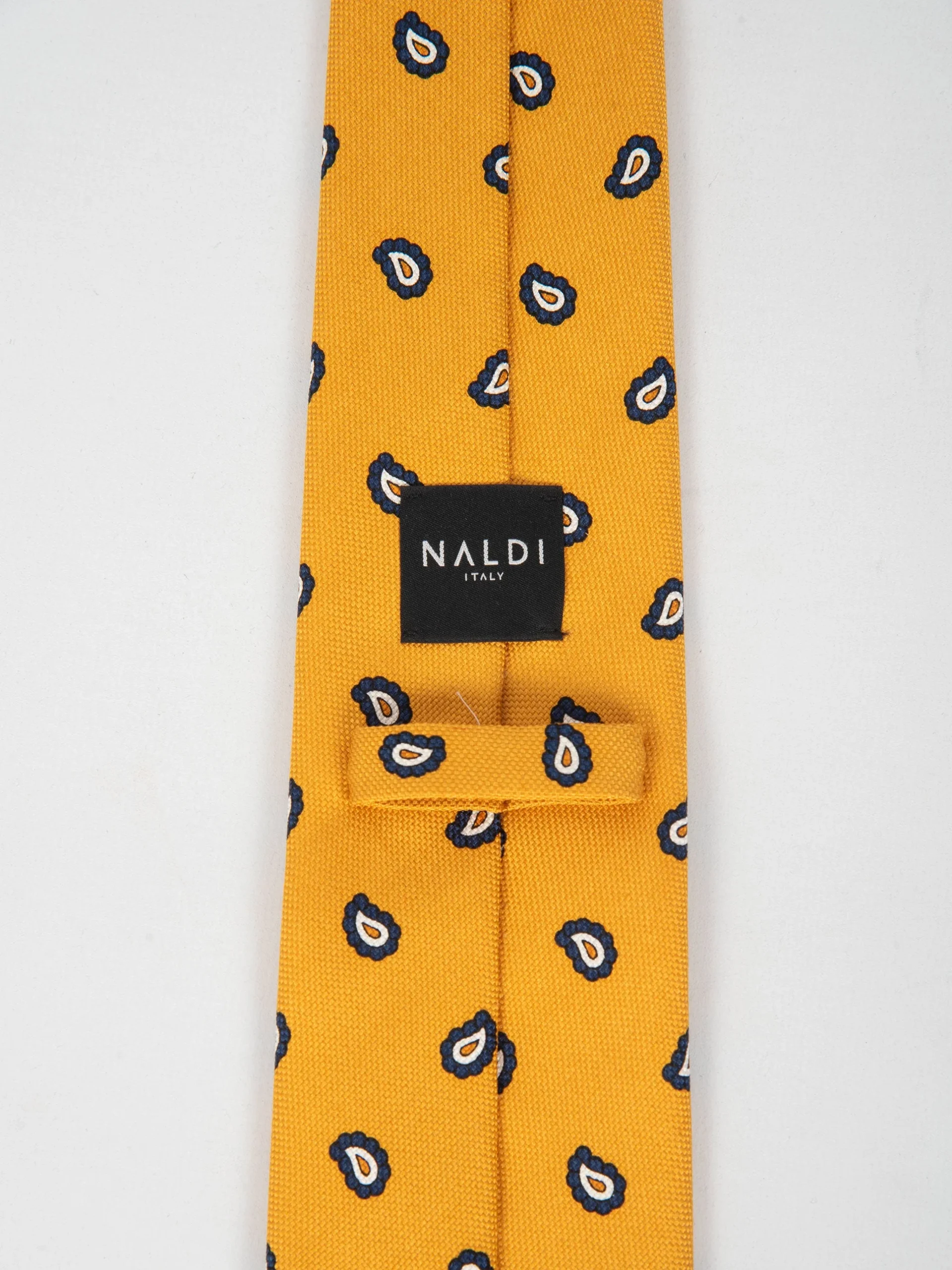 Mod: Naldi foderata 8 cm giallo motivo paisley blu Cravatta 8 cm artigianale foderata. Tessuto 100% seta. Base gialla e motivo paisley blu. Caratteristiche artigianato Napoletano.