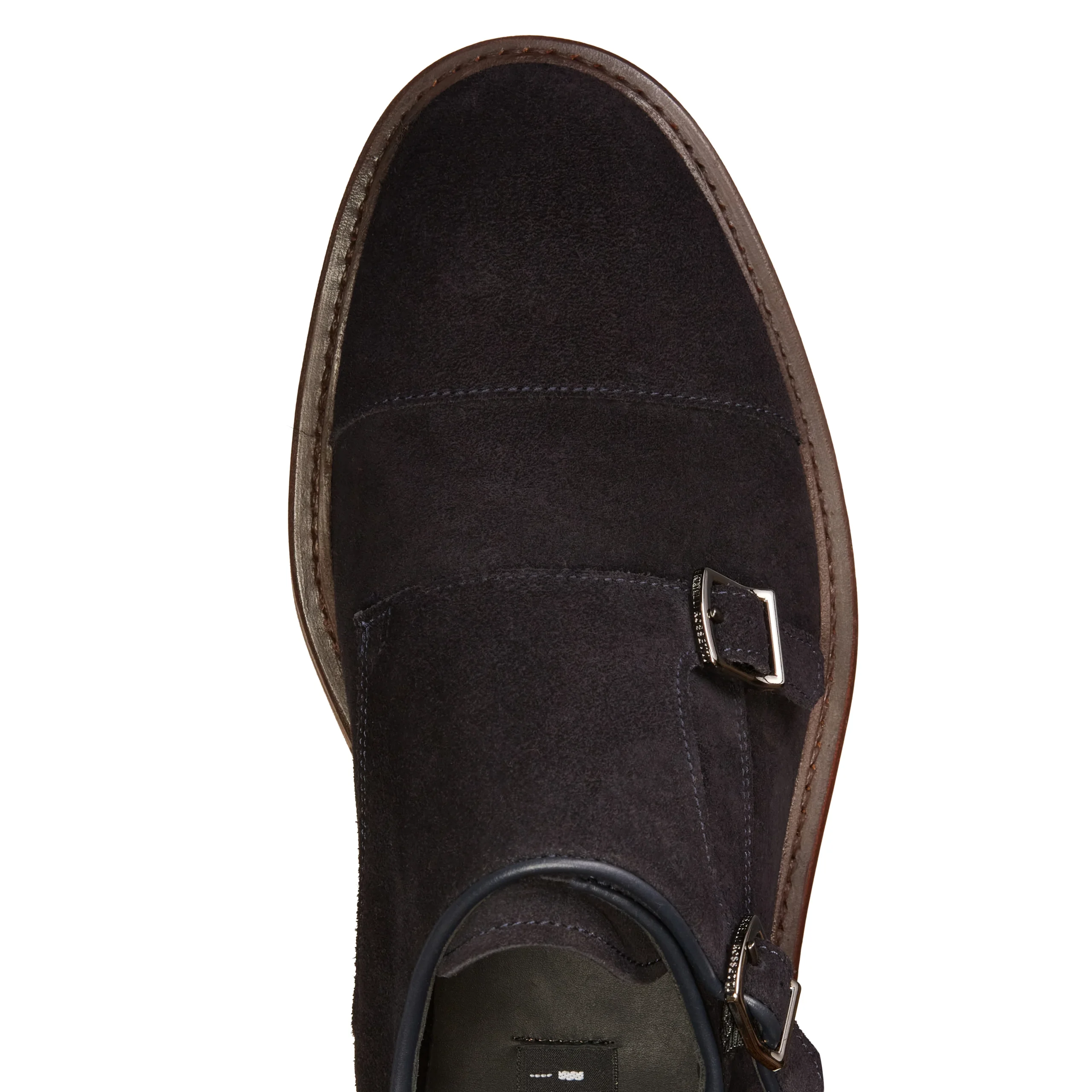 Derby doppia fibbia con puntale dal look ricercato. Linee classiche si fondono con un look contemporaneo. Realizzato in pelle scamosciata color blu marine con trattamento idrorepellente, fondo in gomma texturizzato di colore beige con intersuola in cuoio.