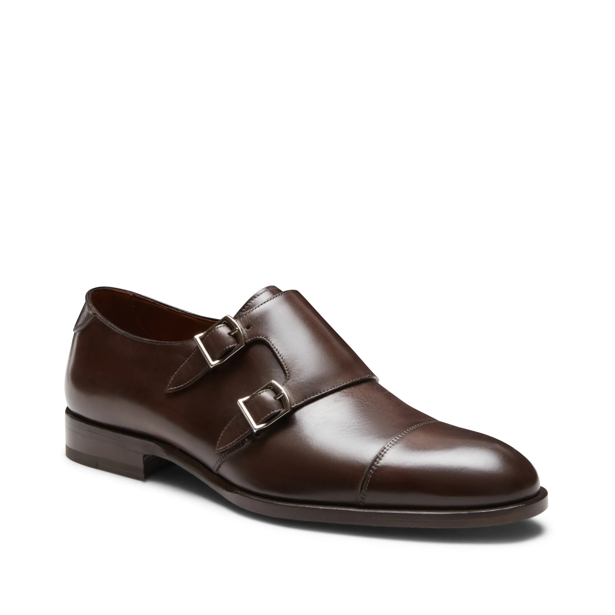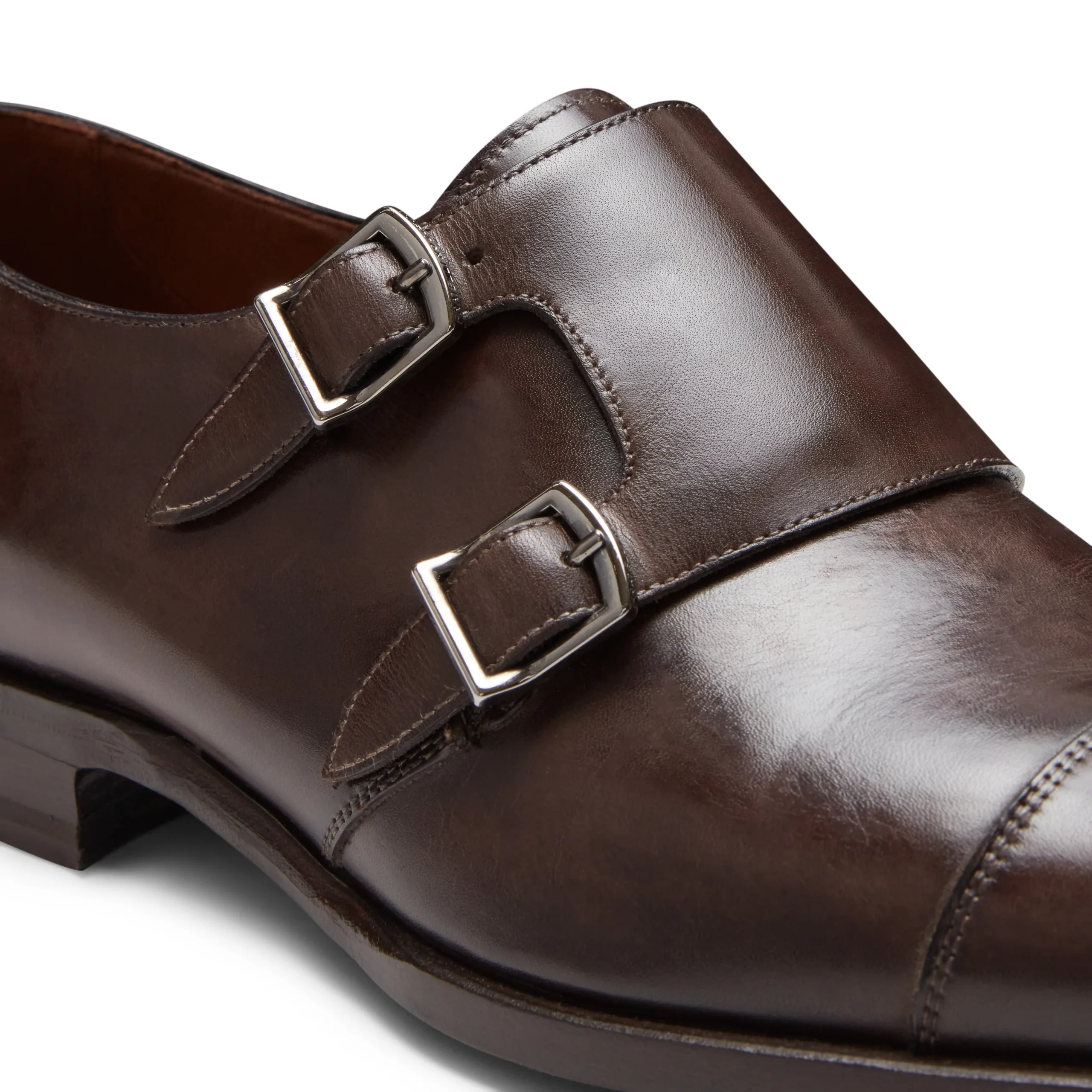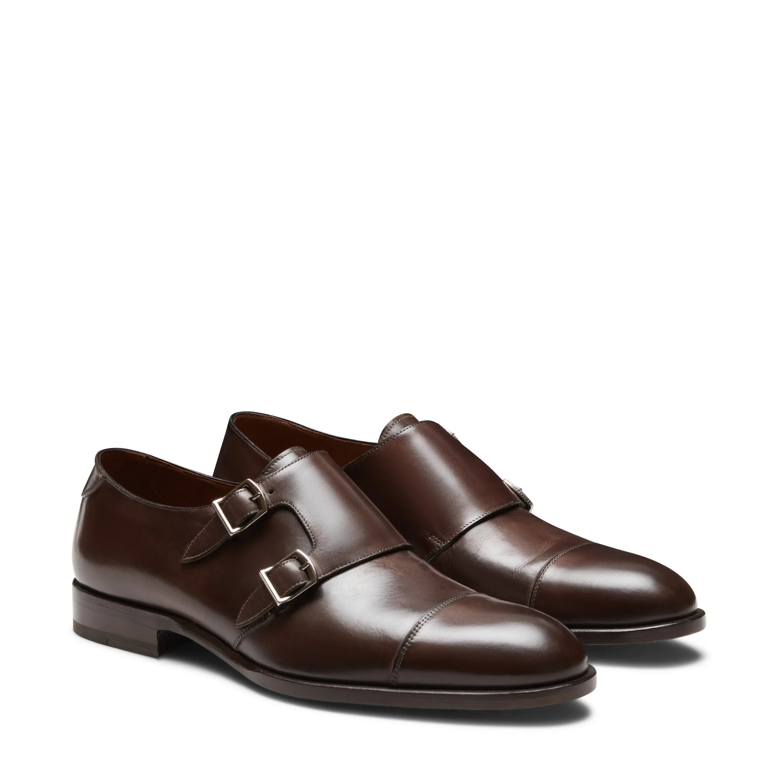 Derby doppia fibbia con puntale dal look ricercato. La calzatura dalla linea versatile e contemporanea è realizzata in morbida pelle che viene tinta di color marrone ebano tramite tamponatura a mano. Il sapiente lavoro artigianale crea un particolare effetto con sfumature di colore più profonde. Suola in cuoio dipinta a mano.
