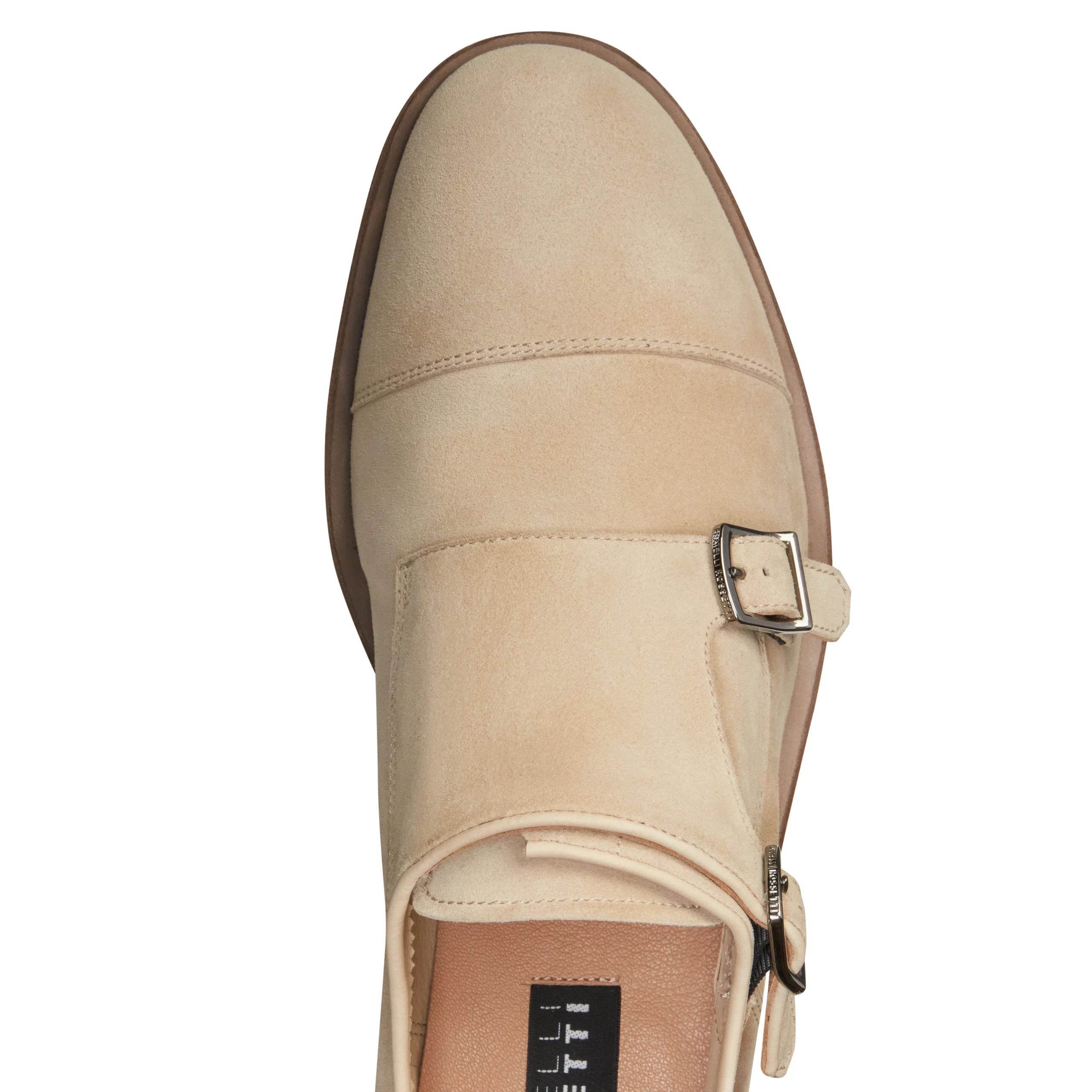 Raffinato derby doppia fibbia dalla forma semi tonda, realizzata in morbida pelle scamosciata color latte. Questa calzatura richiama uno stile urban e si caratterizza per la suola in cuoio con effetto lavato. Art. 15210