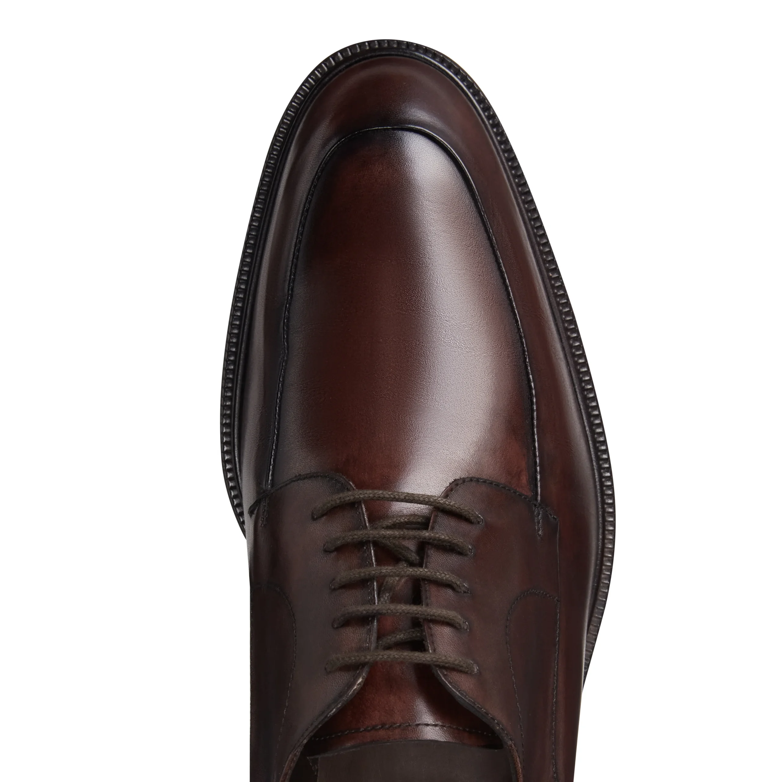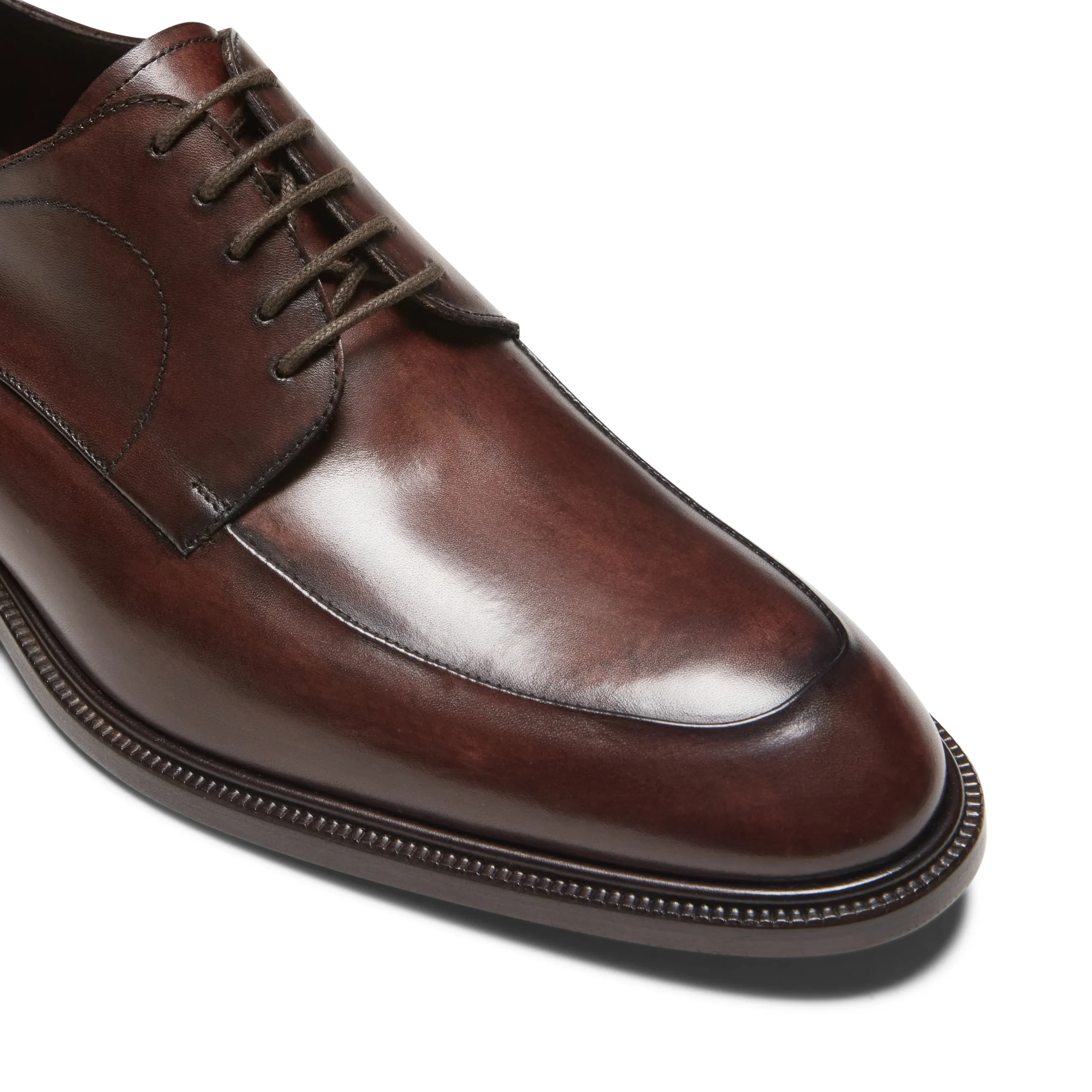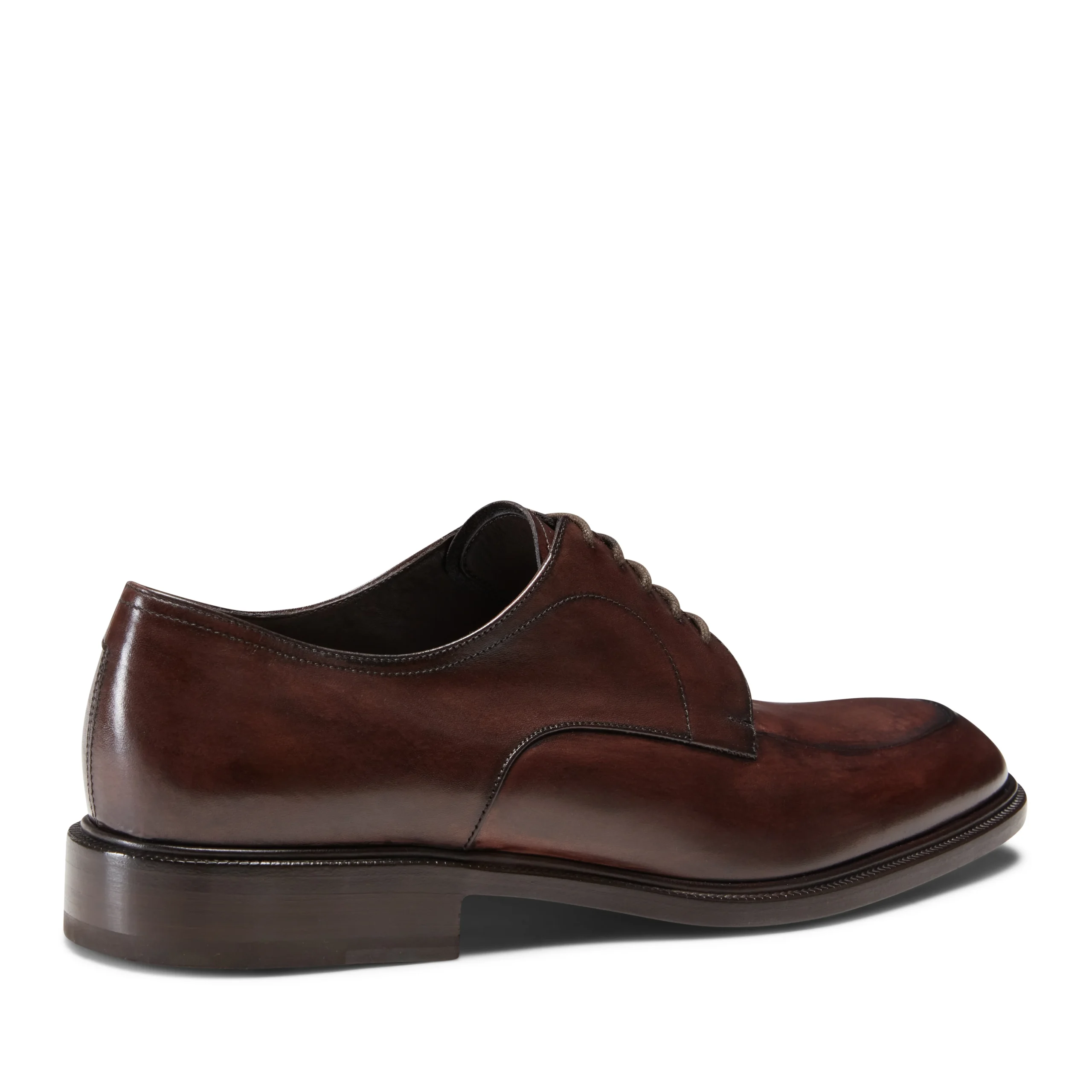 Raffinata Derby a forma sfilata caratterizzata dall’esclusiva cucitura rivoltata. Il pellame viene colorato a mano, donando alla calzatura un effetto sfumato artigianale. Suola in cuoio.
