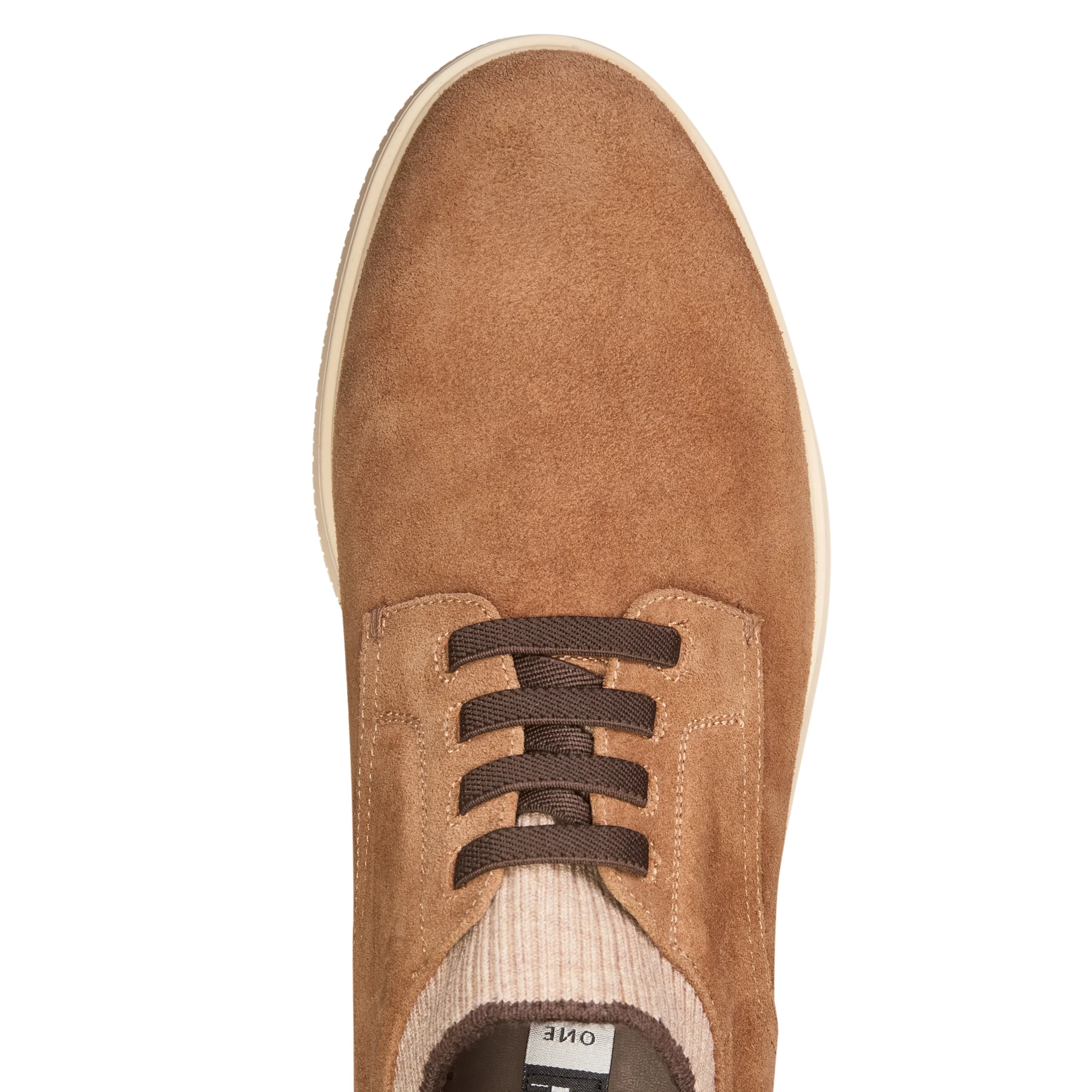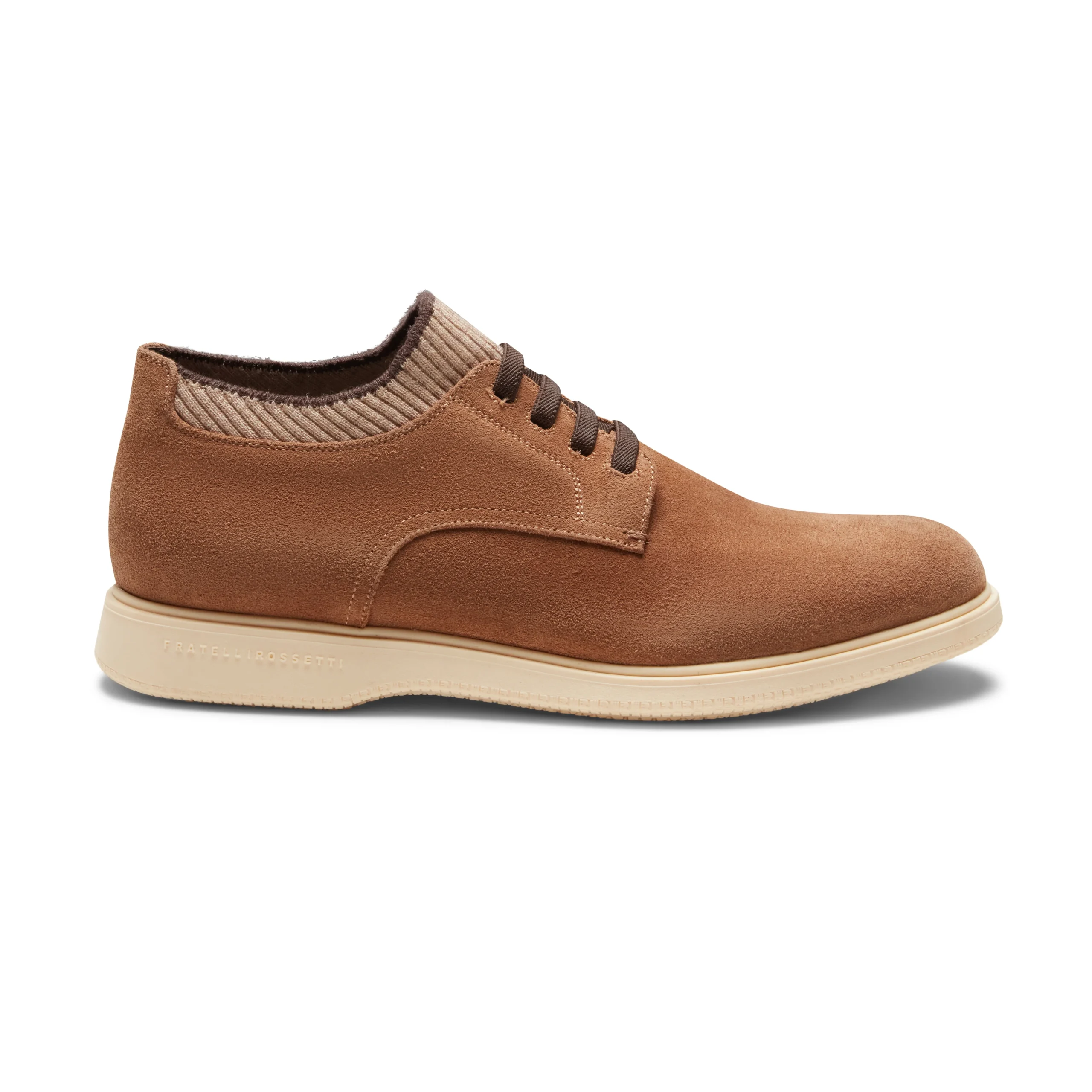 Derby a quattro fori a forma arrotondata. Questa calzatura si caratterizza per lo scollo ‘a calzino’ in tessuto a coste elasticizzato per una calzata confortevole. Realizzata in morbida pelle scamosciata color castoro. Suola in mescola di gomma leggera, flessibile e resistente.