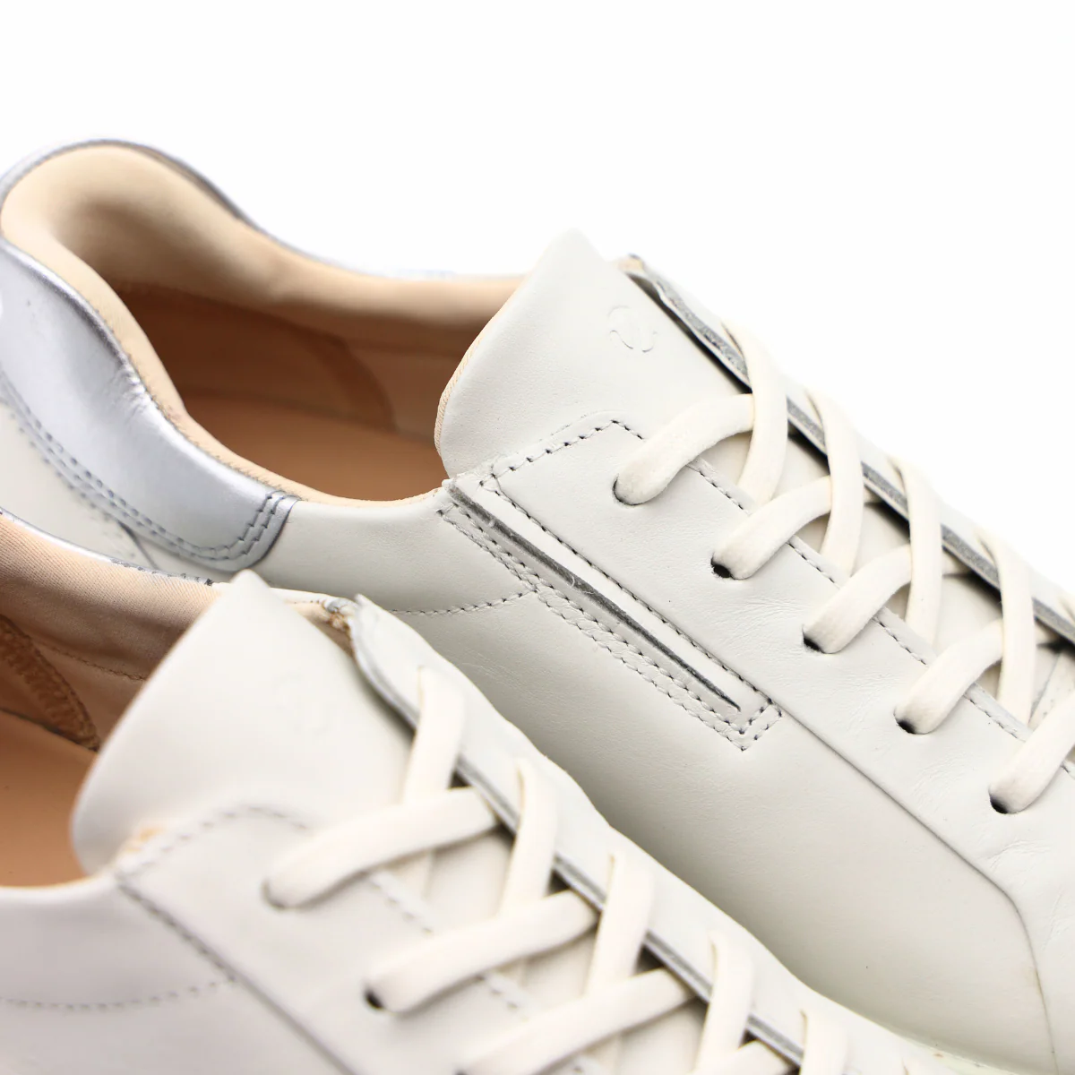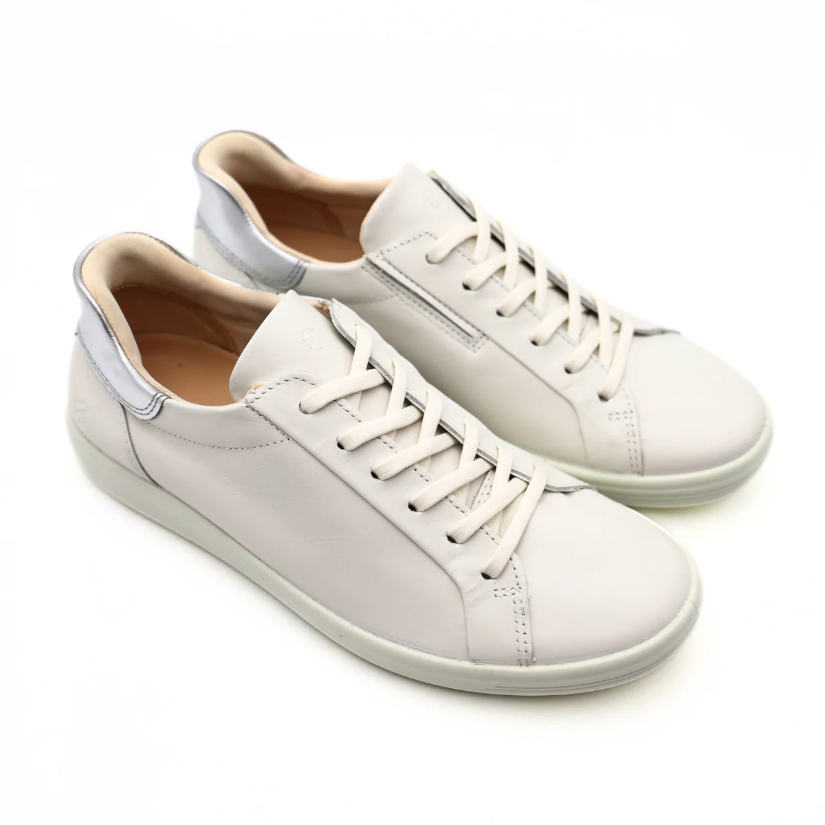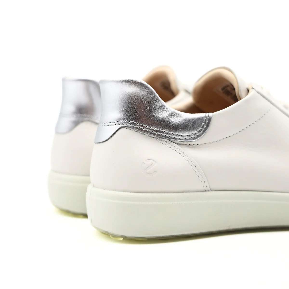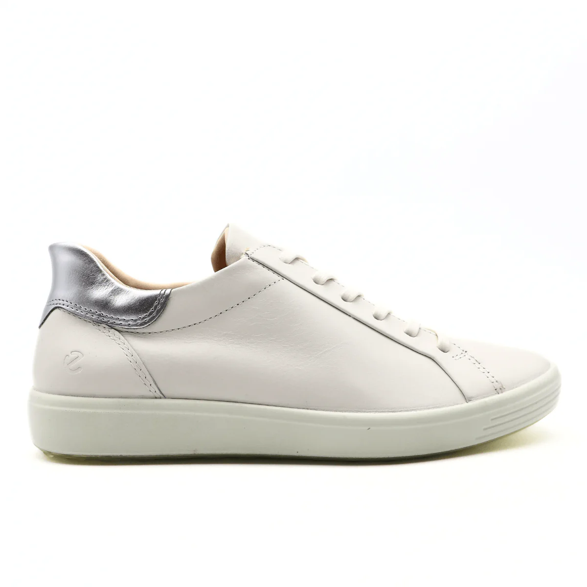 Sneaker di ECCO modello SOFT 7. Realizzata in pelle bianca con tallone in pelle laminata argento, chiusura con laccio. Interno e sottopiede, estraibile, foderati in pelle e tessuto. Suola in gomma.