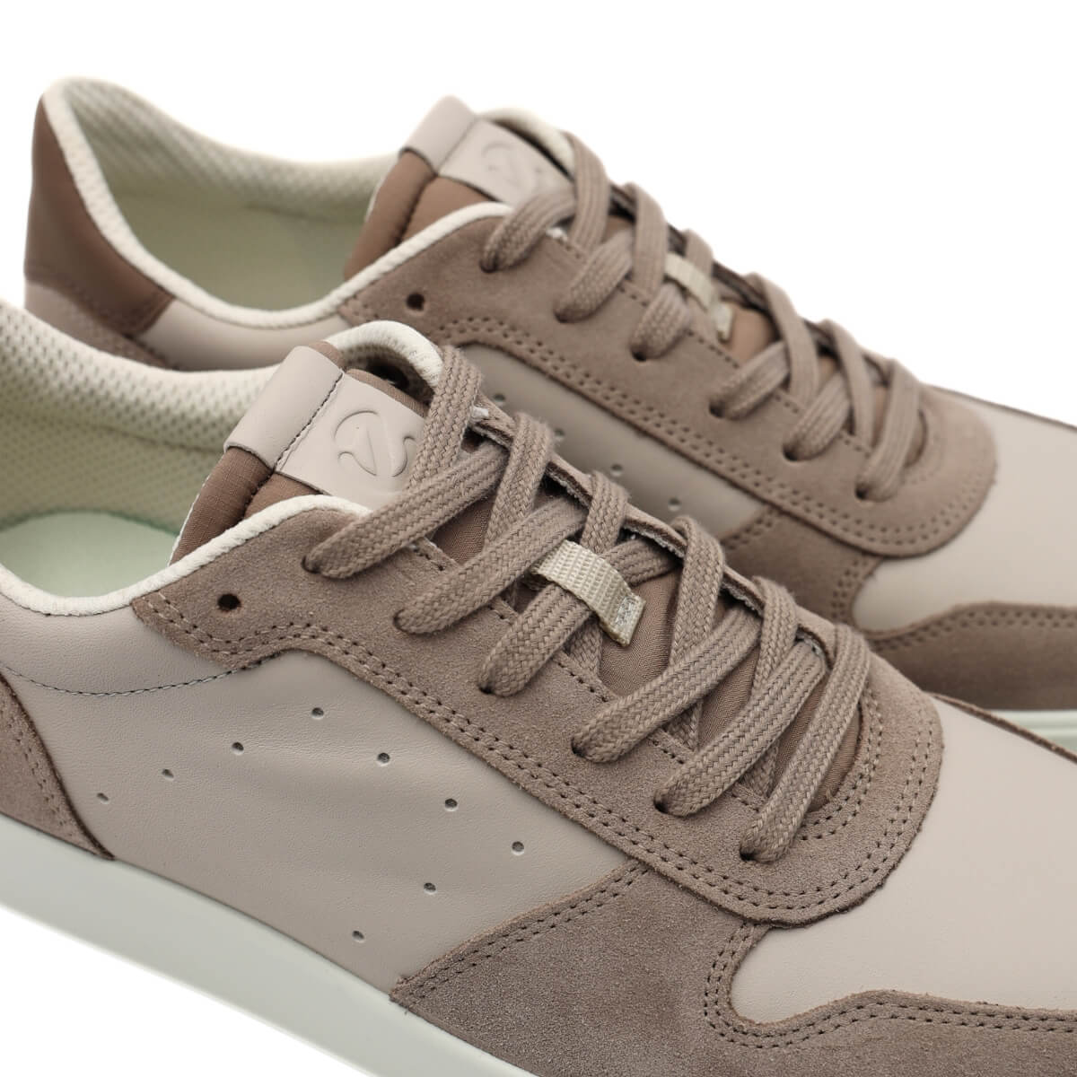 La tomaia è realizzata con pelle beige con inserti in camoscio color taupe, scelta per la sua morbidezza e resistenza al tempo e all’uso quotidiano. Internamente è realizzata in tessuto con sottopiede estraibile e suola in gomma a cassetta.