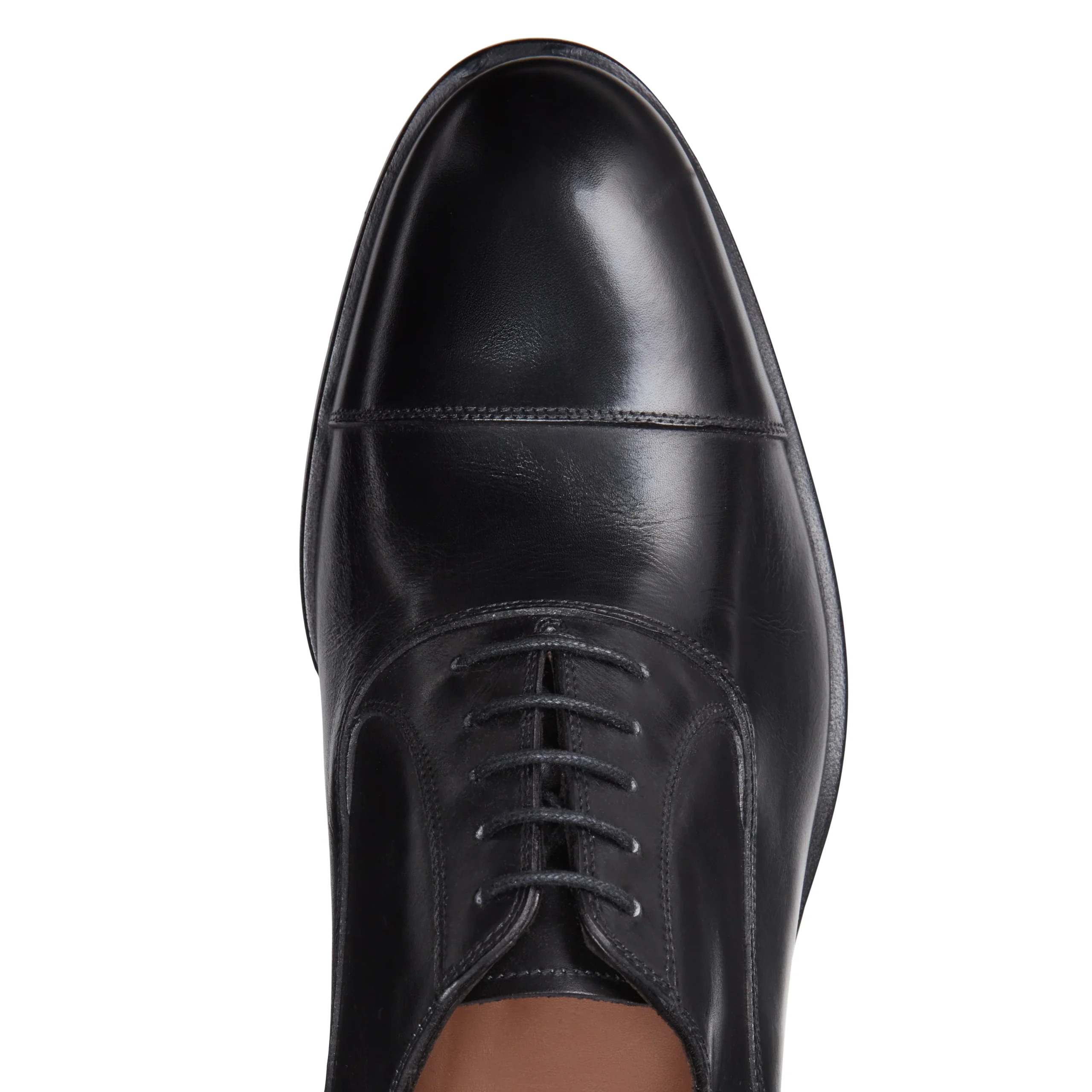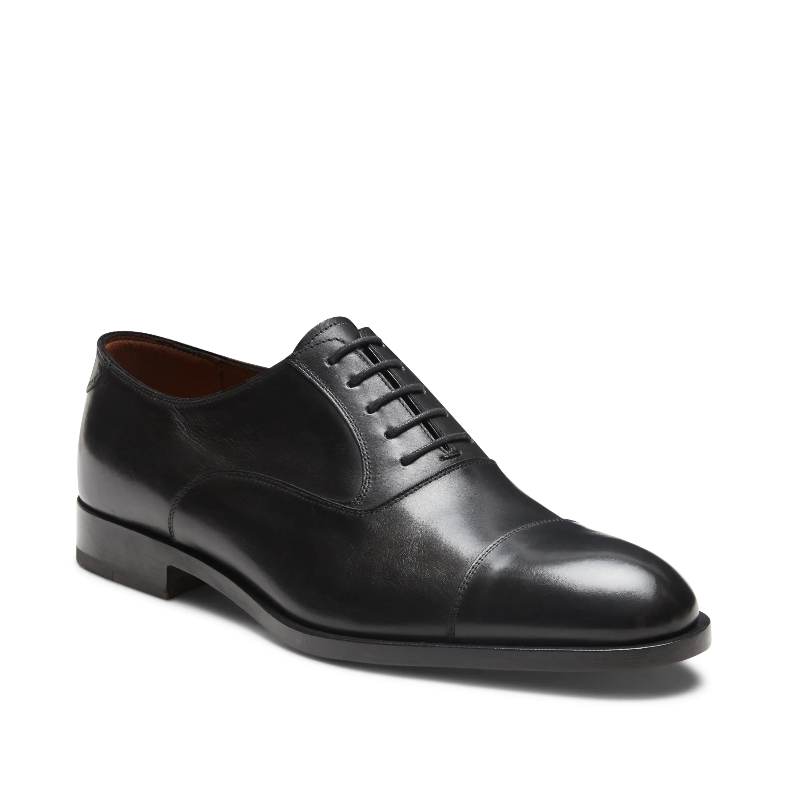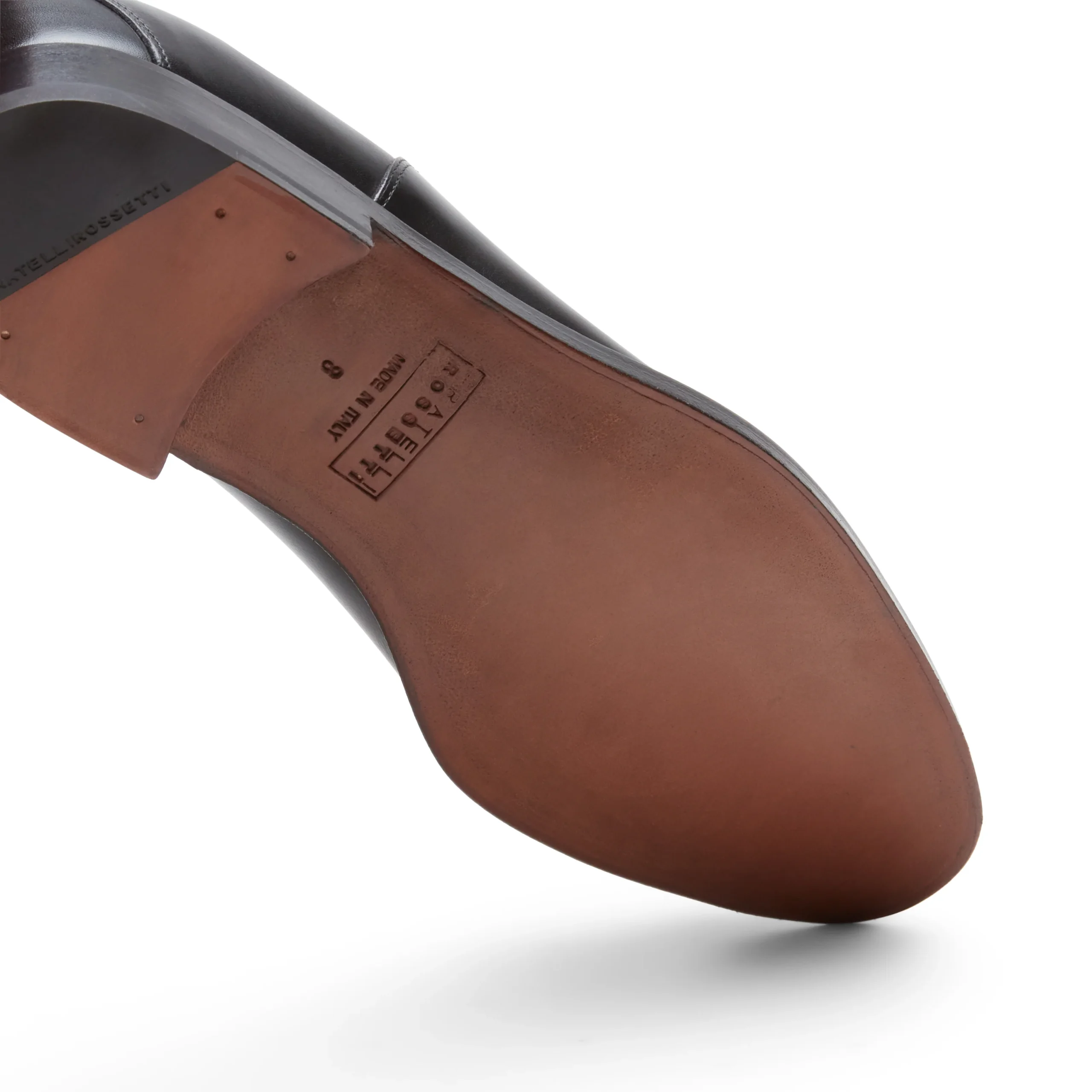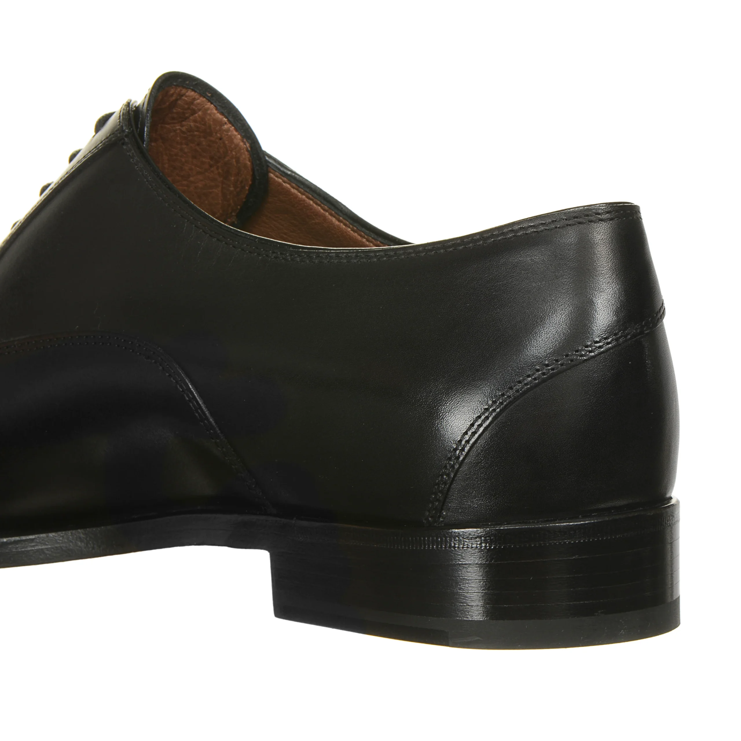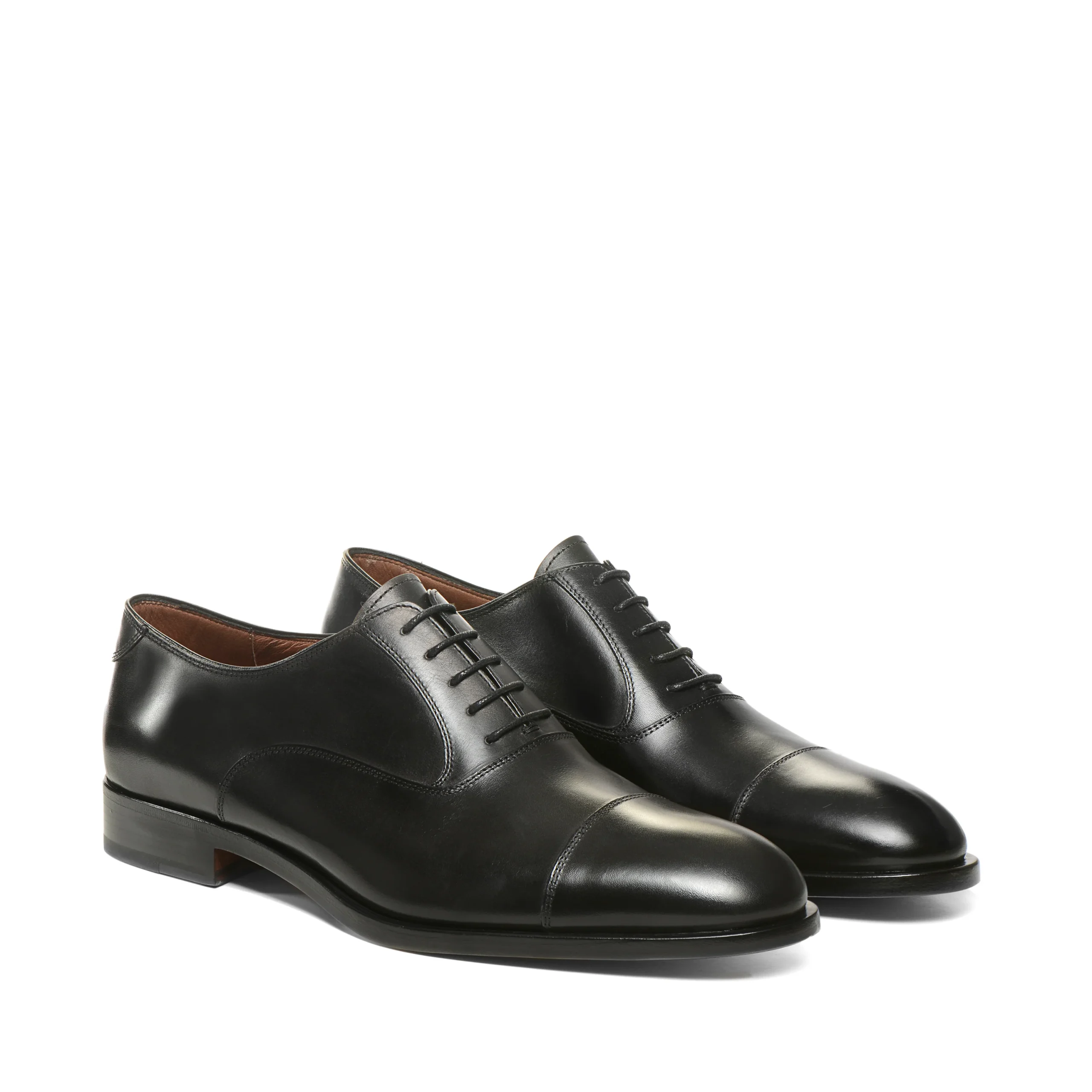 Francesina con puntale dal look classico ed essenziale realizzata in morbida pelle di colore nero. Spazzolata artigianalmente. Questo processo artigianale dona alla calzatura un aspetto semilucido. Suola in cuoio con mezzo tacco in gomma.
