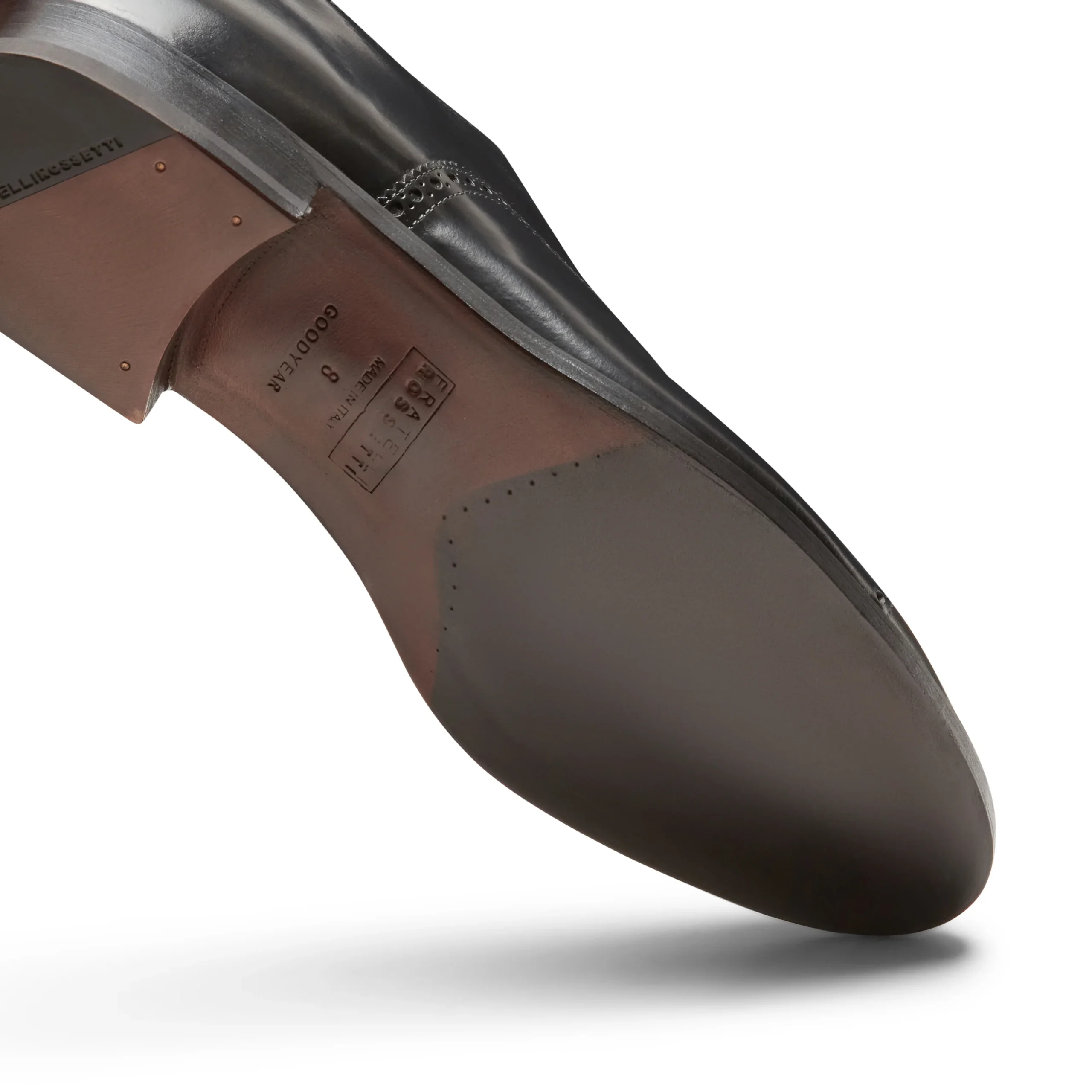Francesina con puntale che richiama i canoni delle calzature anglosassoni con frastagli e bucature. Realizzata in pelle con finitura abrasivata che conferisce lucentezza e una maggiore intensità di colore su punta e tallone. Caratterizzata dalla pregevole lavorazione Goodyear che garantisce comfort e durata nel tempo.