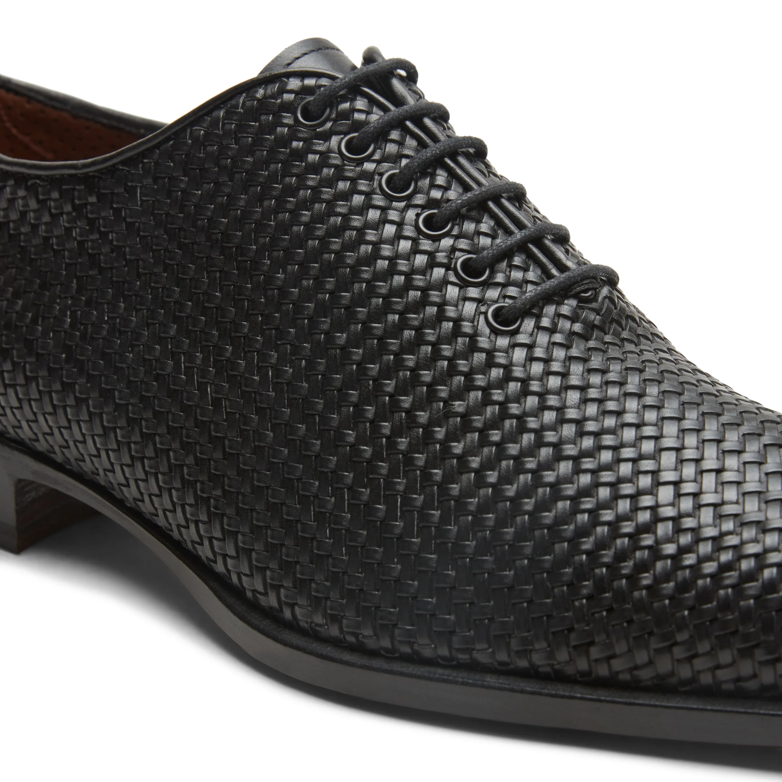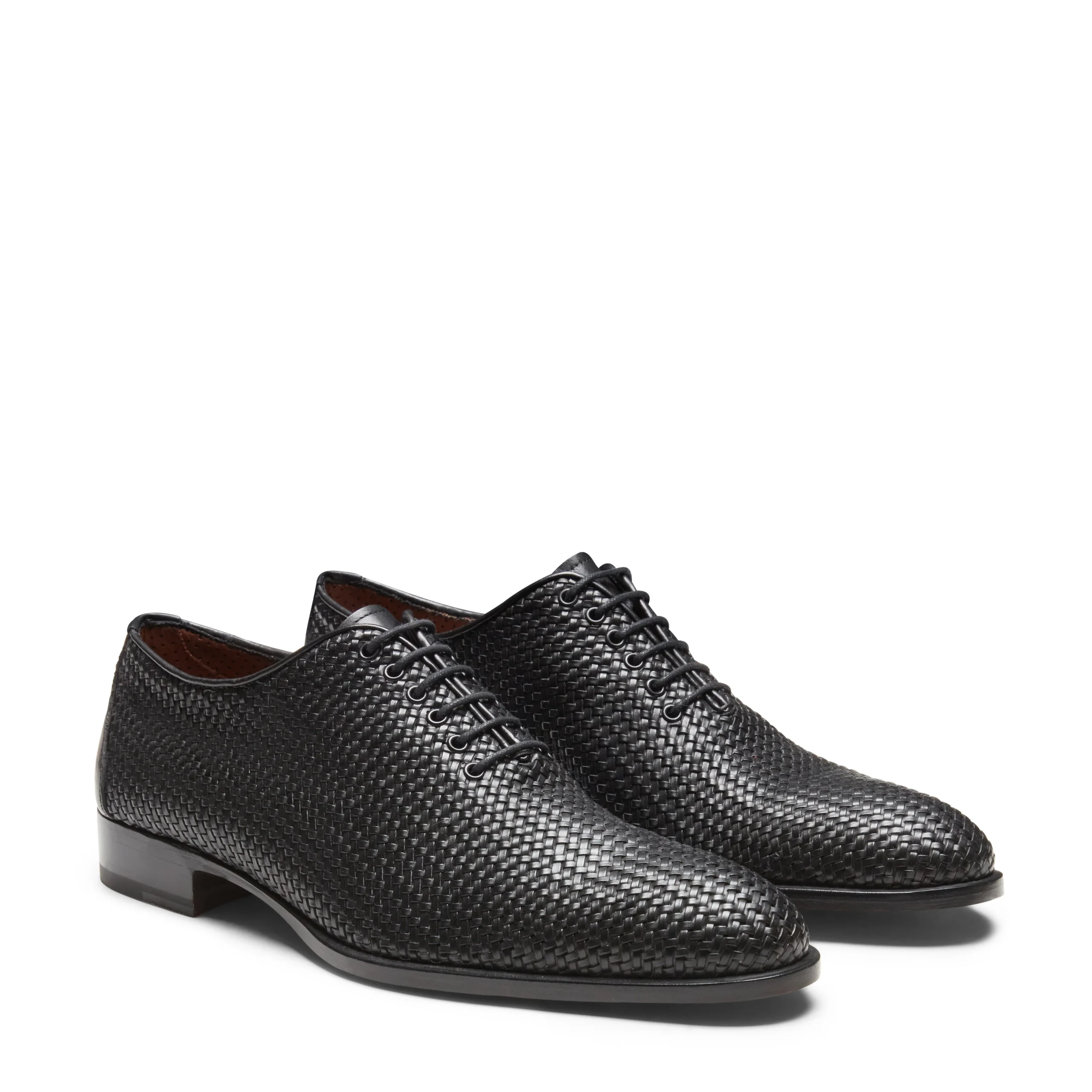 Raffinata francesina Richelieu realizzata in morbida pelle di colore nero. La tomaia è finemente intrecciata ed è caratterizzata da un’esclusiva lavorazione artigianale che dona al pellame un leggero effetto anticato e una maggiore lucentezza. Art.