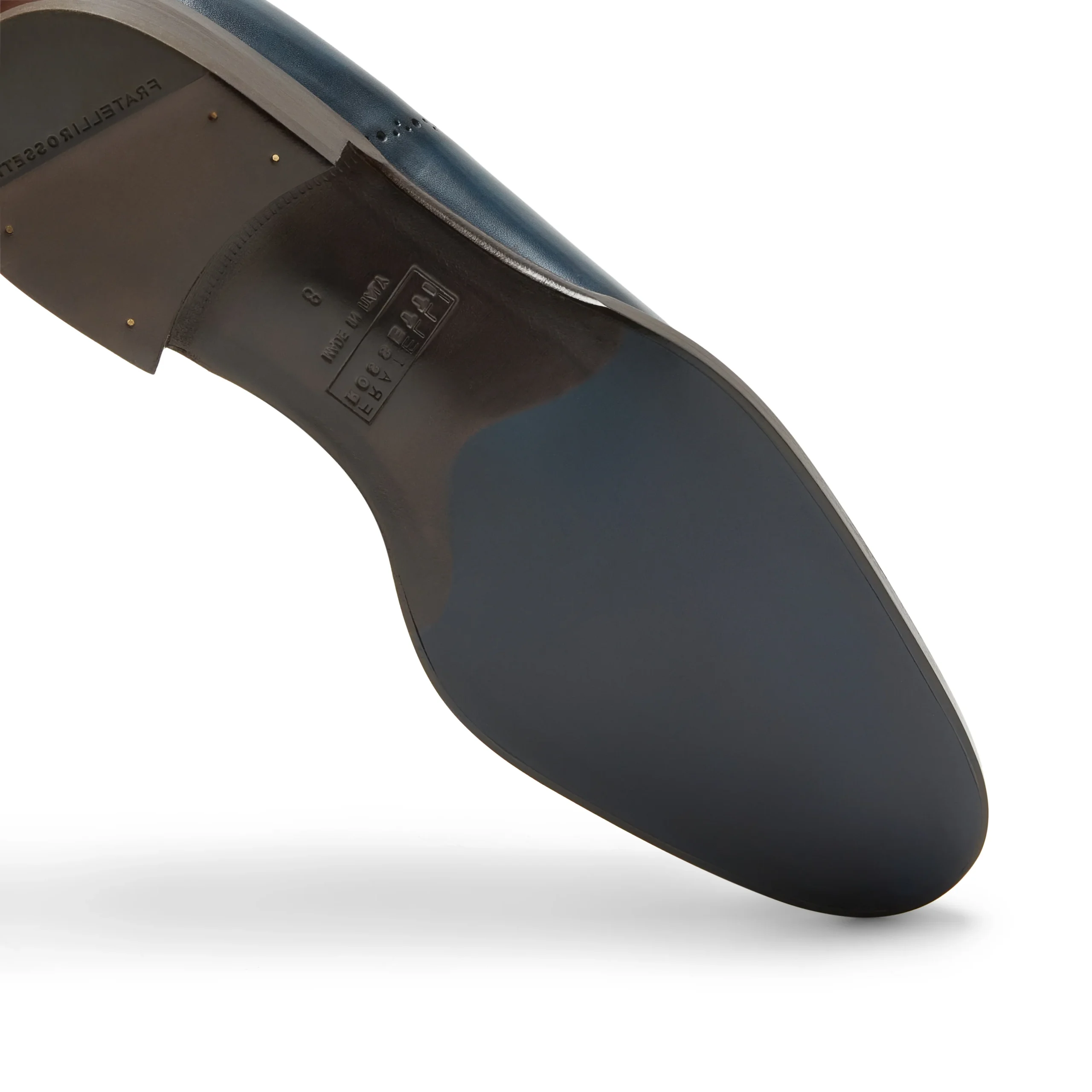 Eleganza senza tempo per la francesina dalla forma affusolata. Realizzata in pelle blu marine con un’esclusiva lavorazione artigianale che dona alla calzatura un leggero effetto anticato e una maggiore lucentezza. Le bucature disegnano il puntale e i profili sulla tomaia. Suola in cuoio dipinta a mano.