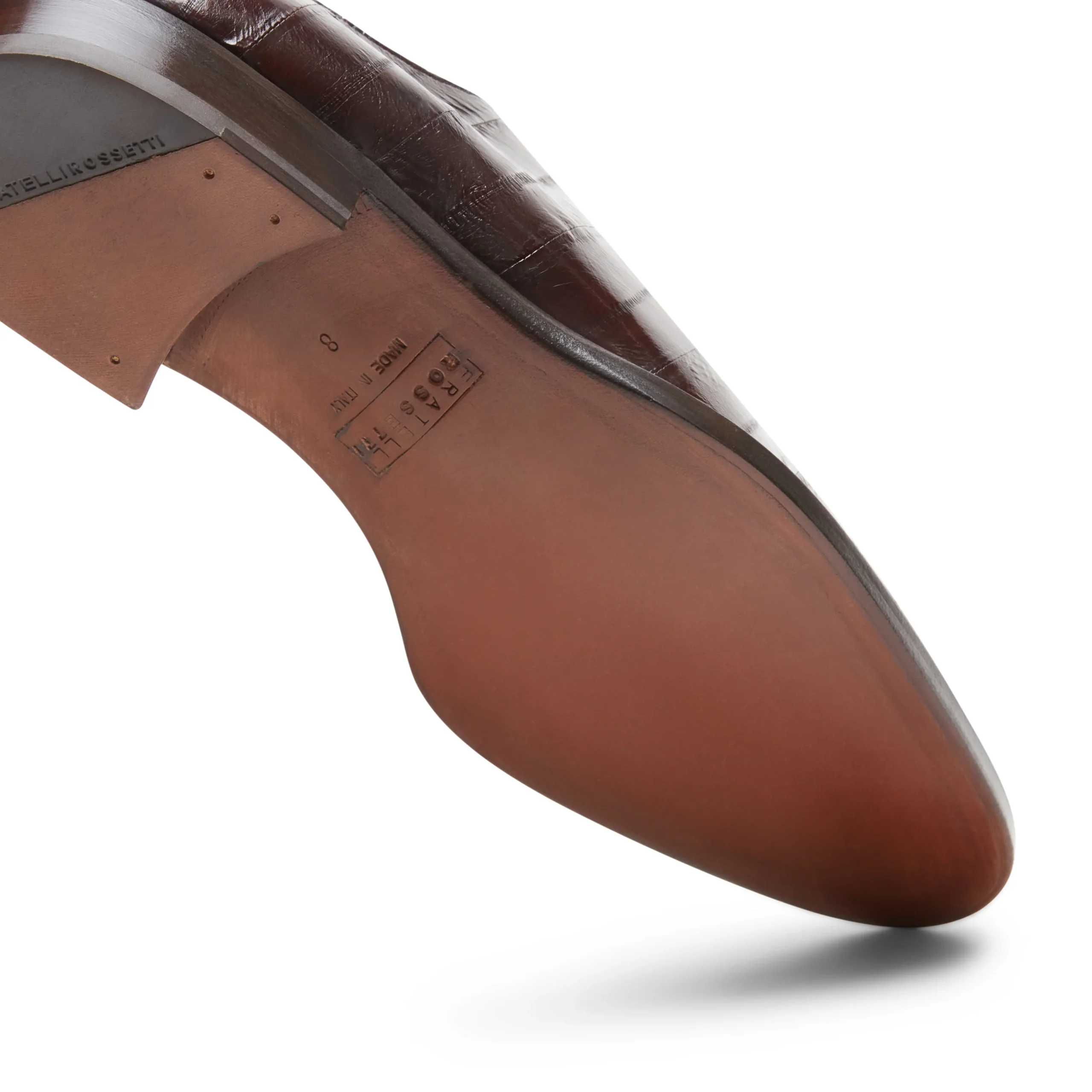 Raffinata francesina Richelieu realizzata in pregiata pelle di anguilla marrone che si caratterizza per la sua naturale lucentezza. Le striature del pellame donano profondità e movimento, rendendo ogni paio unico ed esclusivo.