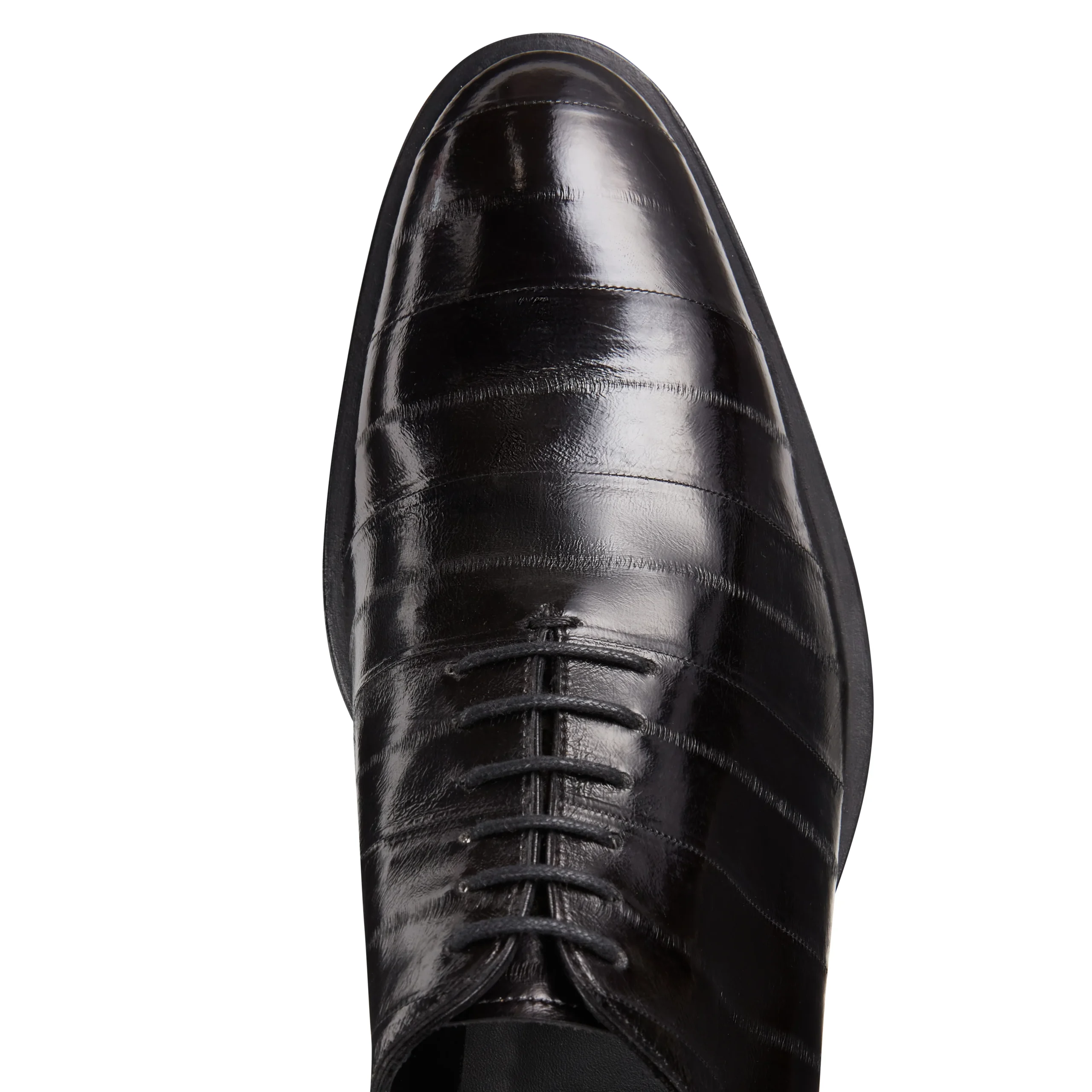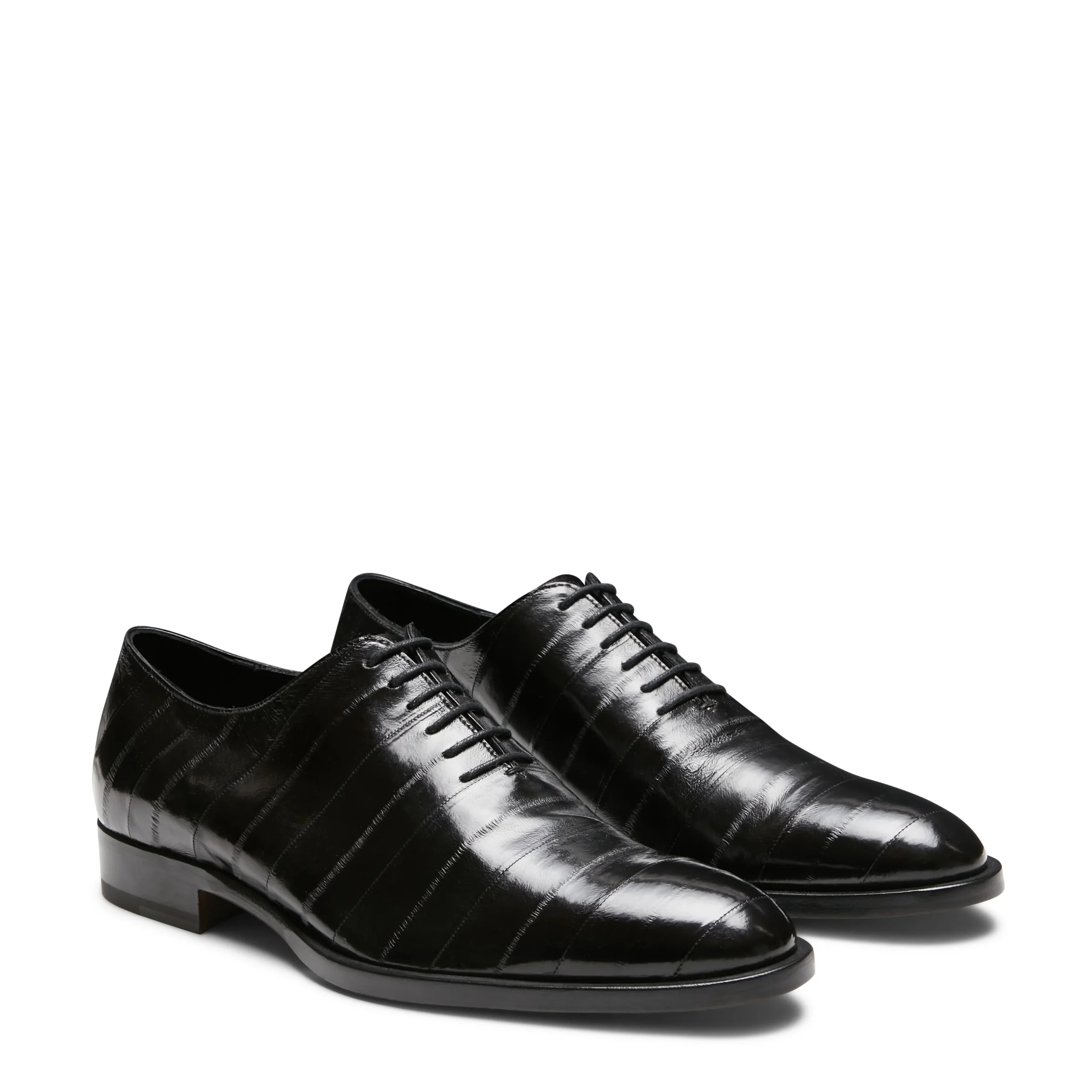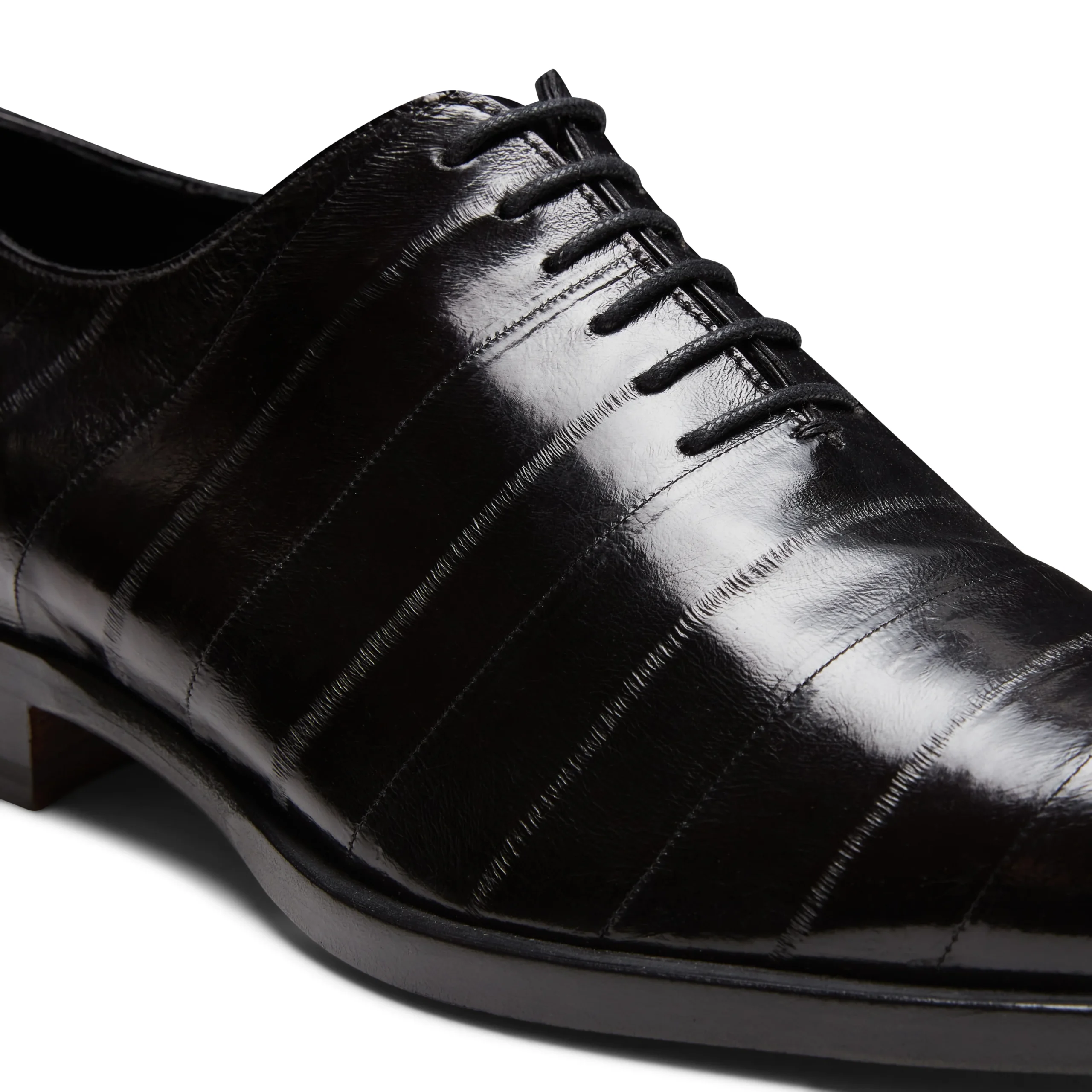 Raffinata francesina Richelieu realizzata in pregiata pelle di anguilla nera che si caratterizza per la sua naturale lucentezza. Le striature del pellame donano profondità e movimento, rendendo ogni paio unico ed esclusivo.