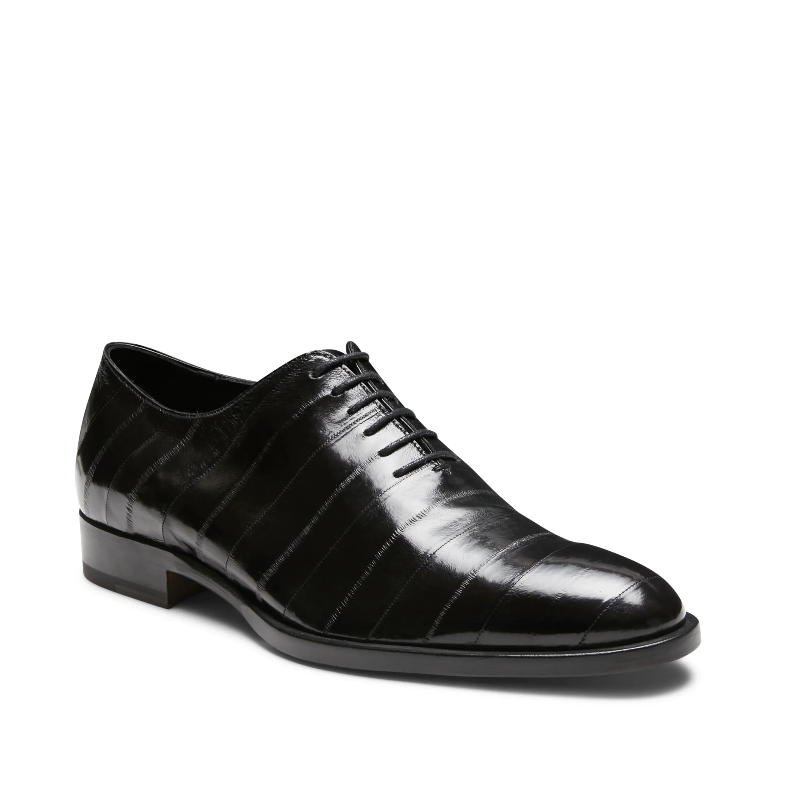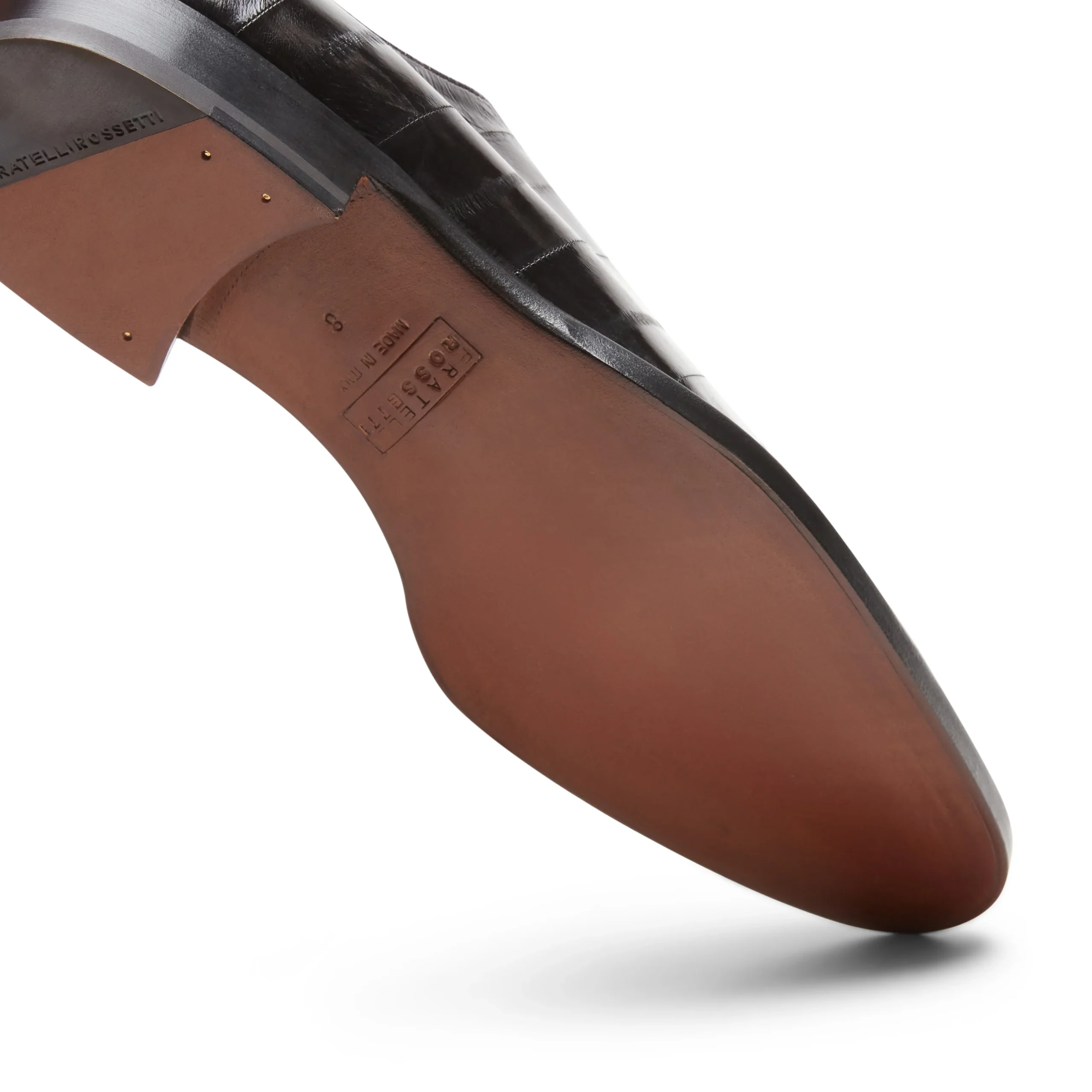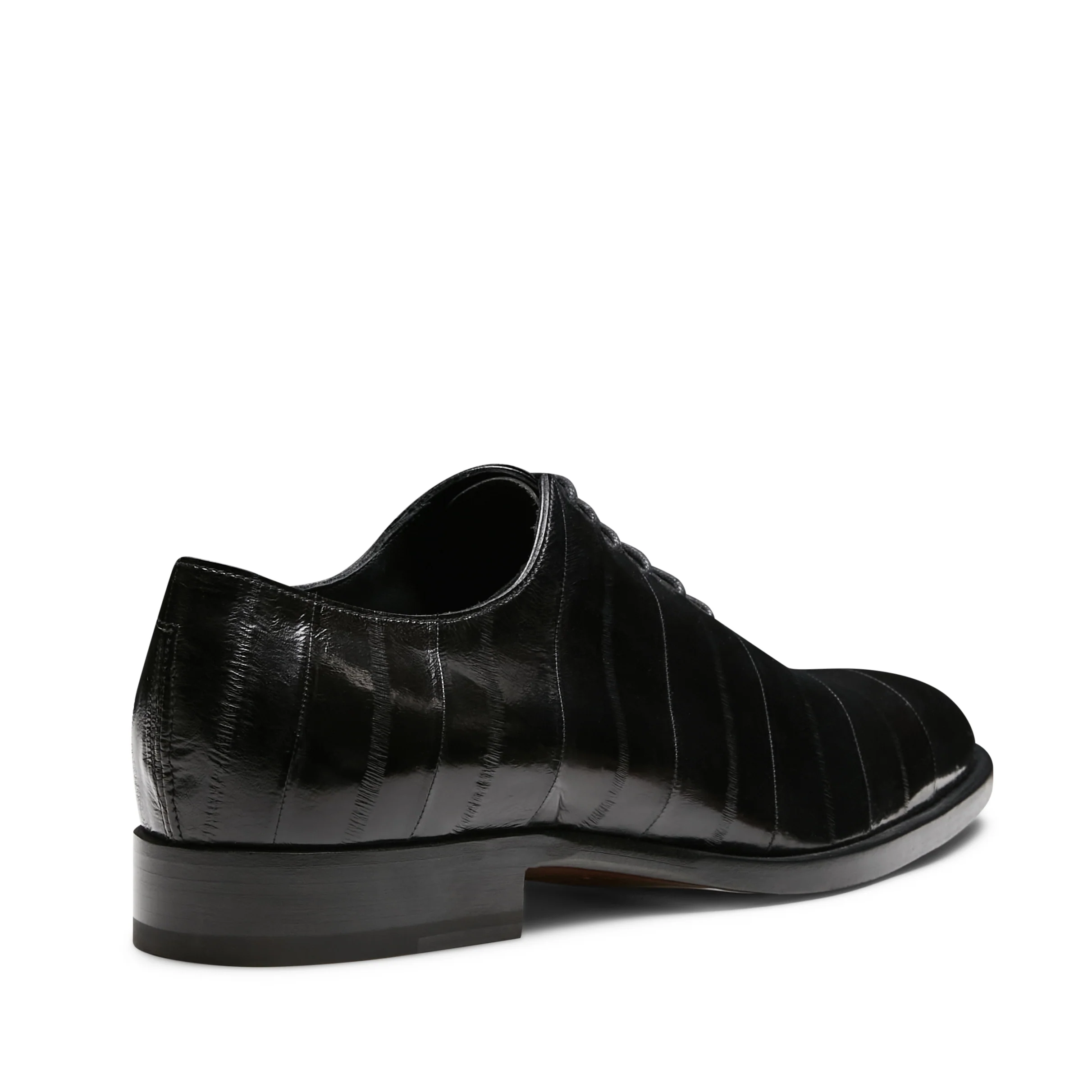 Raffinata francesina Richelieu realizzata in pregiata pelle di anguilla nera che si caratterizza per la sua naturale lucentezza. Le striature del pellame donano profondità e movimento, rendendo ogni paio unico ed esclusivo.