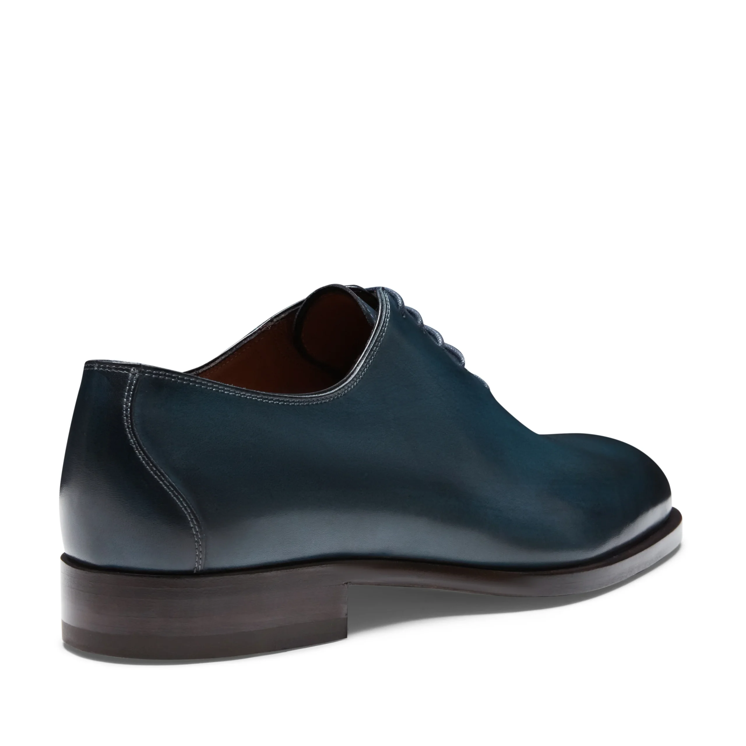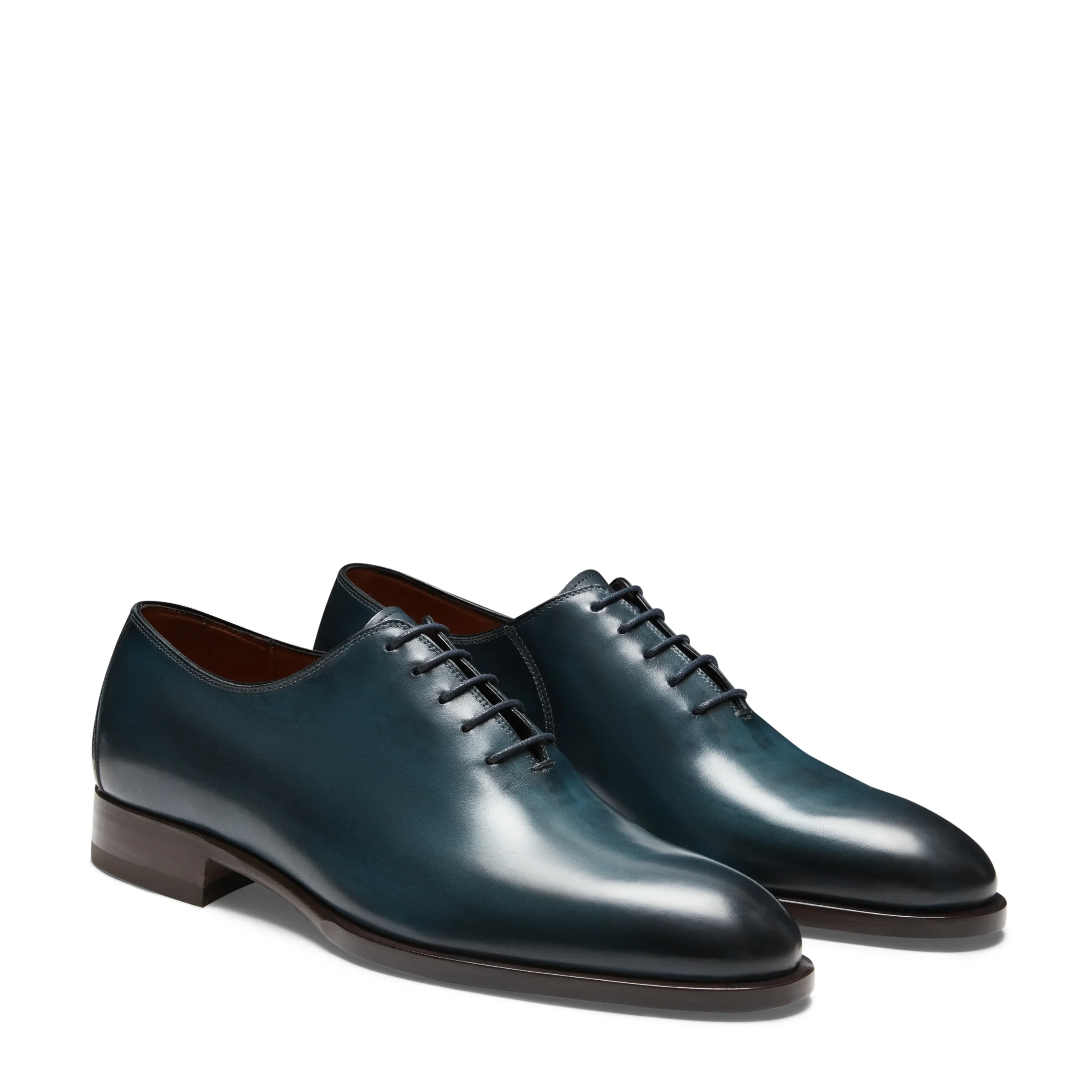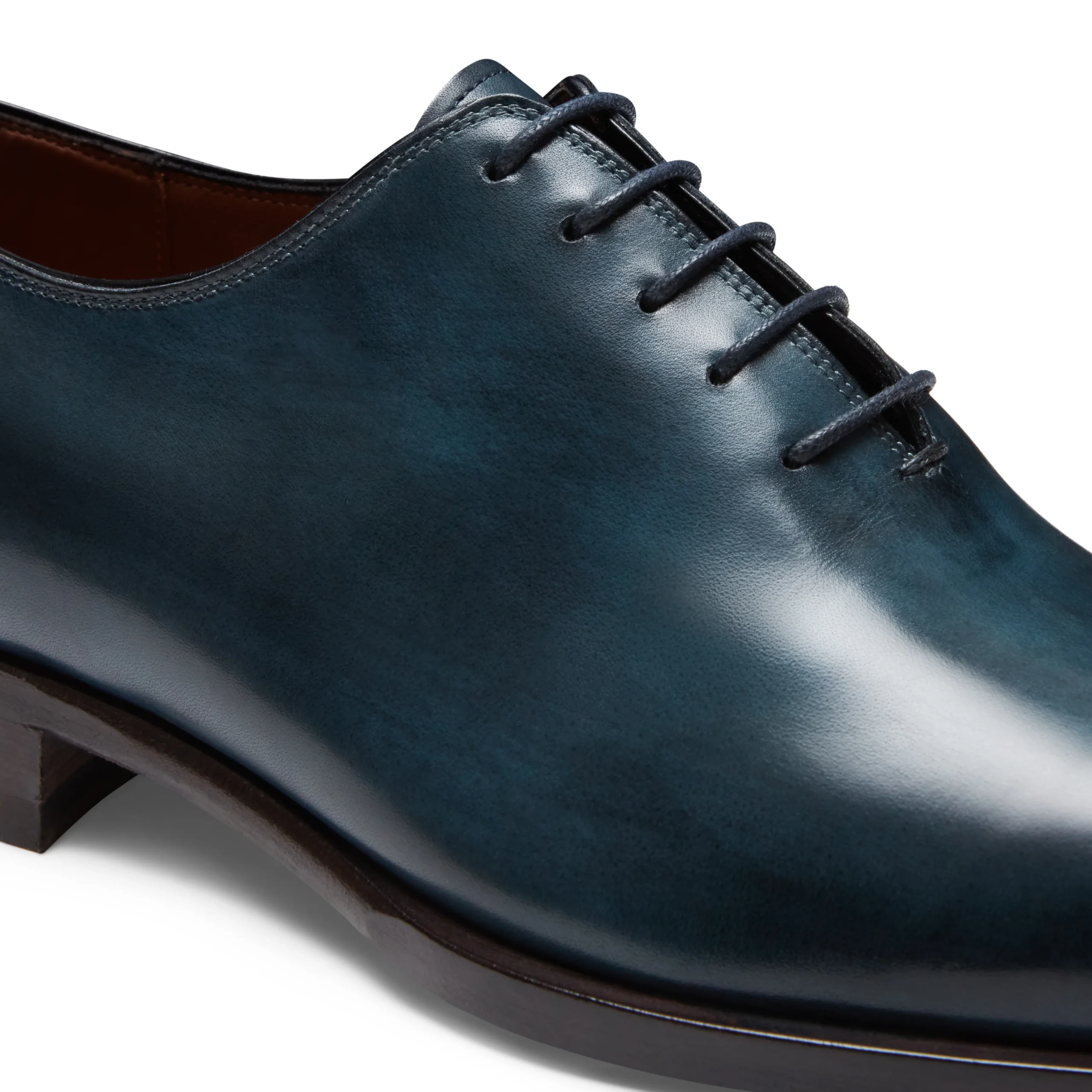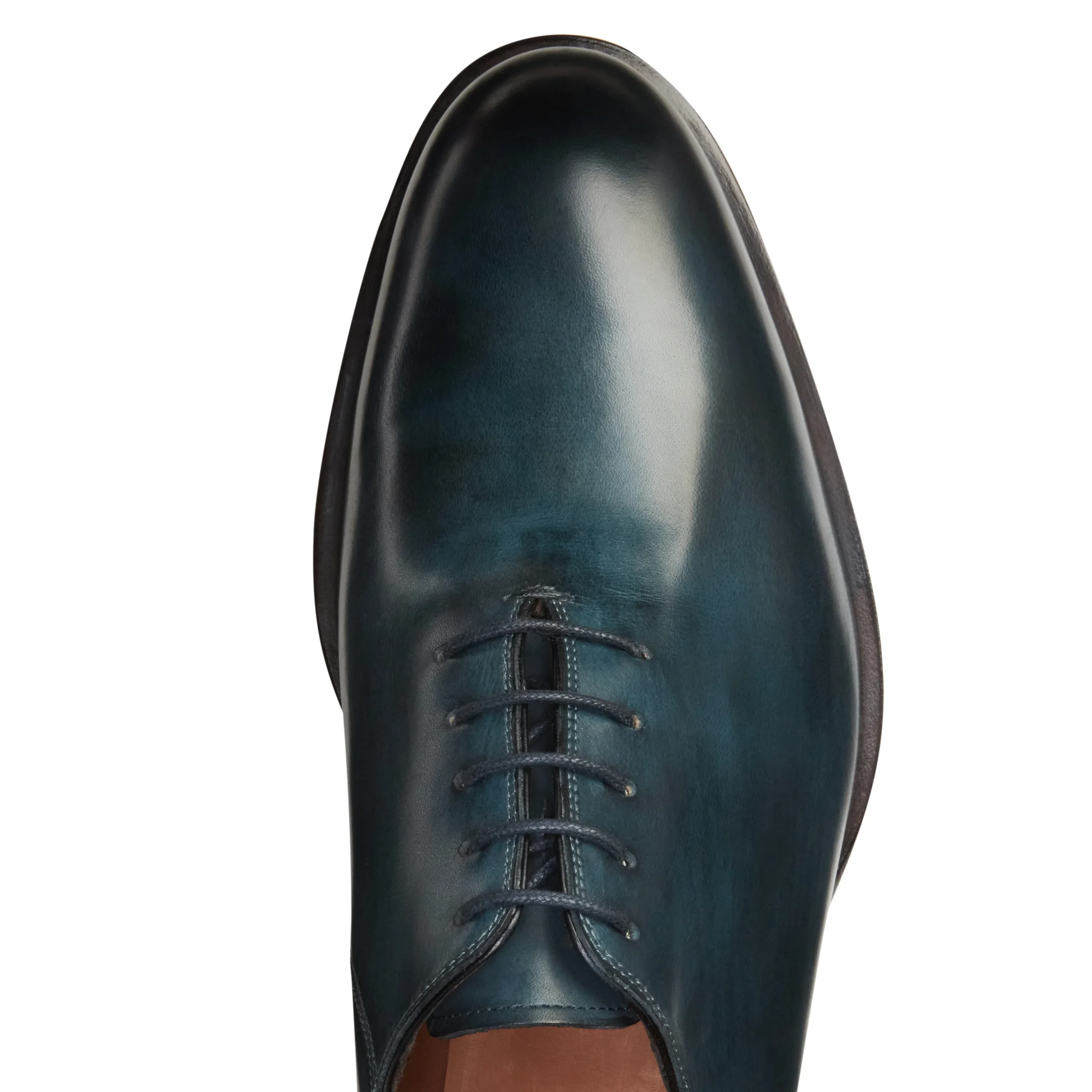Raffinata francesina Richelieu dalla forma leggermente arrotondata, realizzata in pelle liscia color blu ottanio. La tomaia è tinta a mano con sapiente maestria artigianale tramite tecnica di tamponatura su forma, per ottenere profonde e armoniose sfumature cromatiche. Suola in cuoio dipinta a mano.