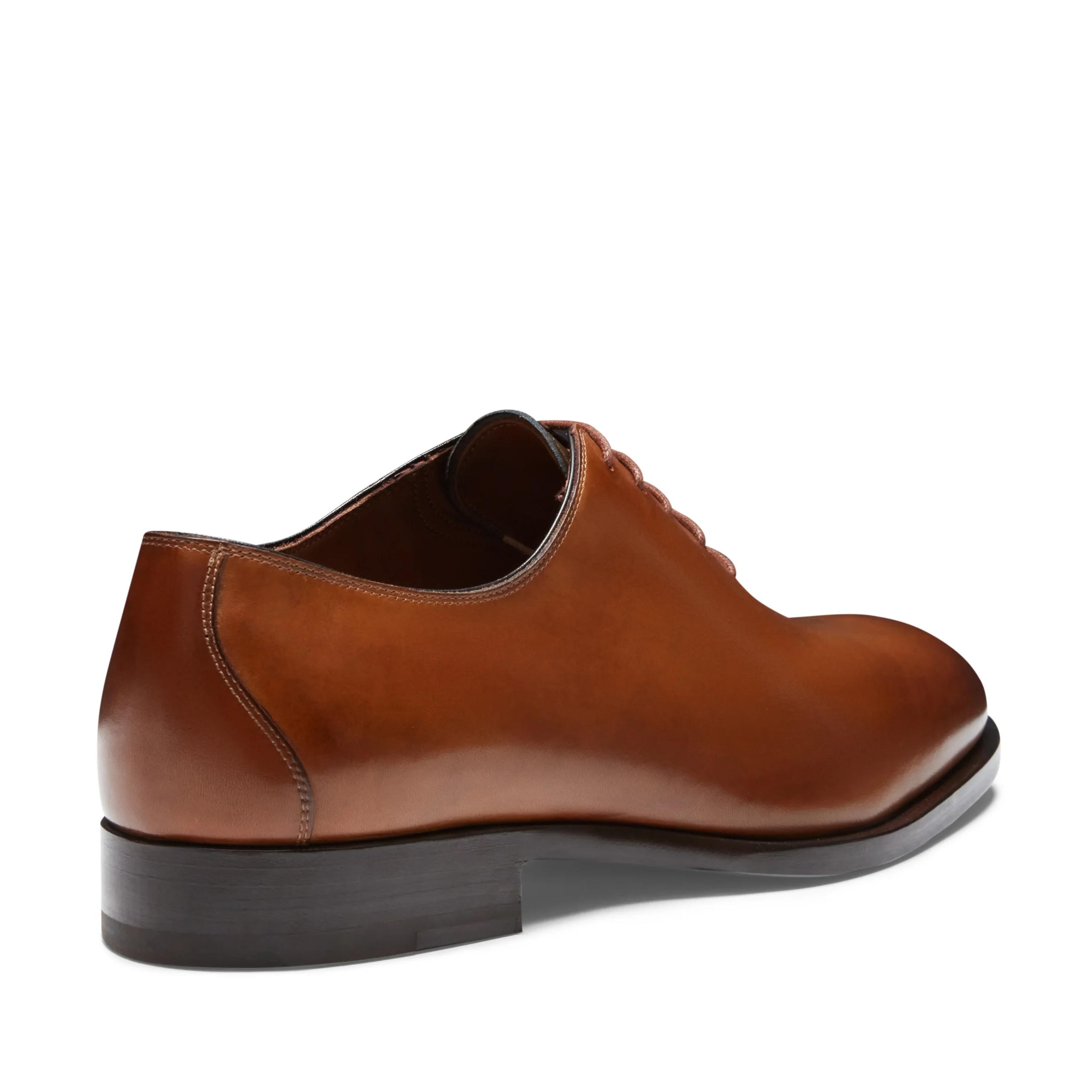 Raffinata francesina Richelieu dalla forma leggermente arrotondata, realizzata in pelle liscia color marrone castagna. La tomaia è tinta a mano con sapiente maestria artigianale tramite tecnica di tamponatura su forma, per ottenere profonde e armoniose sfumature cromatiche. Suola in cuoio dipinta a mano.