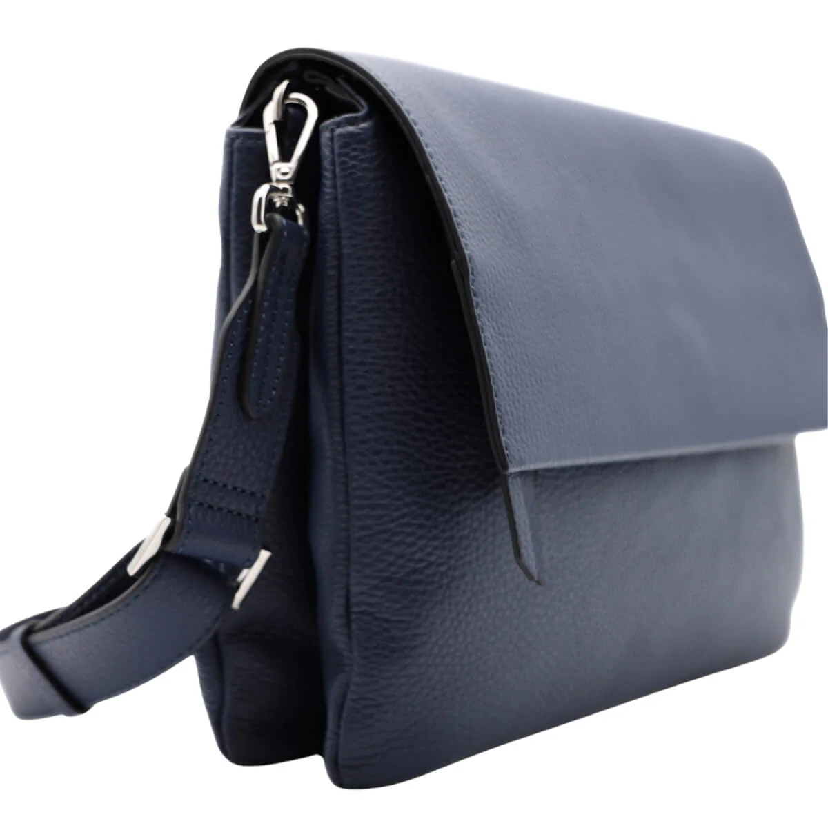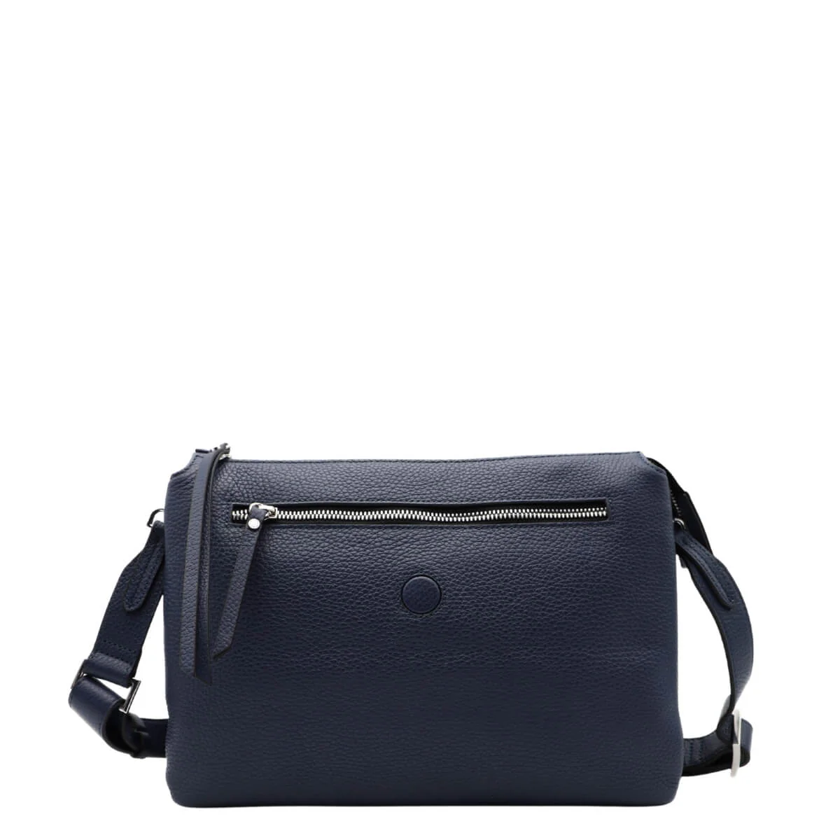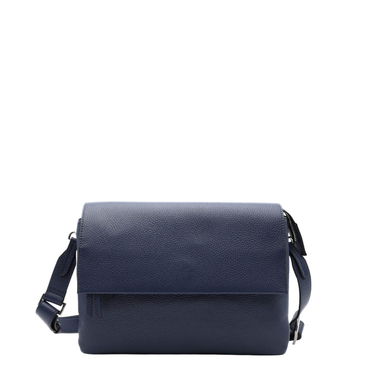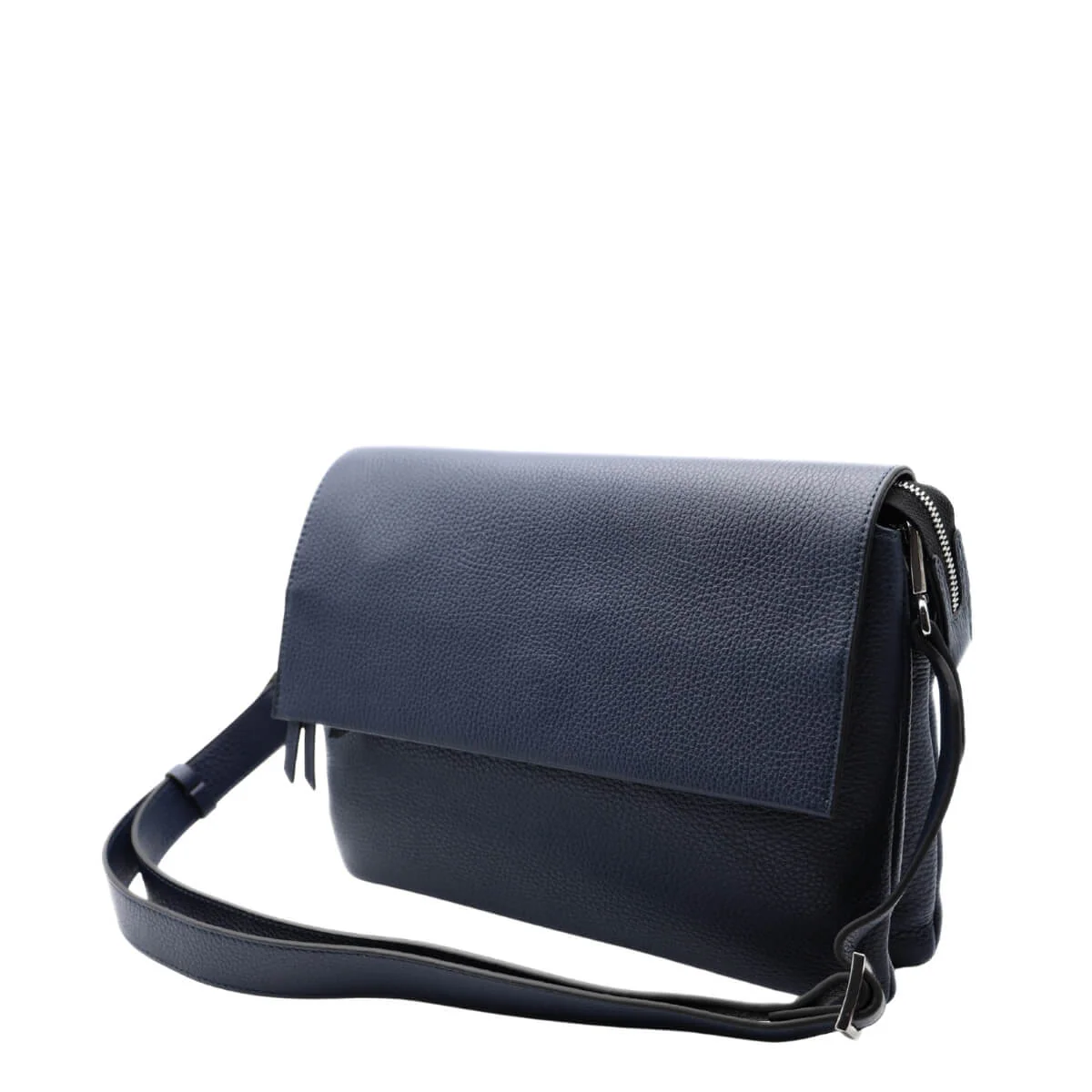La tonalità blu navy, elegante e intramontabile, rappresenta un’alternativa raffinata al nero, perfetta per completare look da ufficio, outfit casual o abbinamenti più ricercati. Può essere portata a mano oppure con la sottile tracolla in pelle, offrendo una portabilità pratica e confortevole. La chiusura con zip, patta e bottone magnetico nella parte superiore aggiunge funzionalità senza compromettere la pulizia del design.