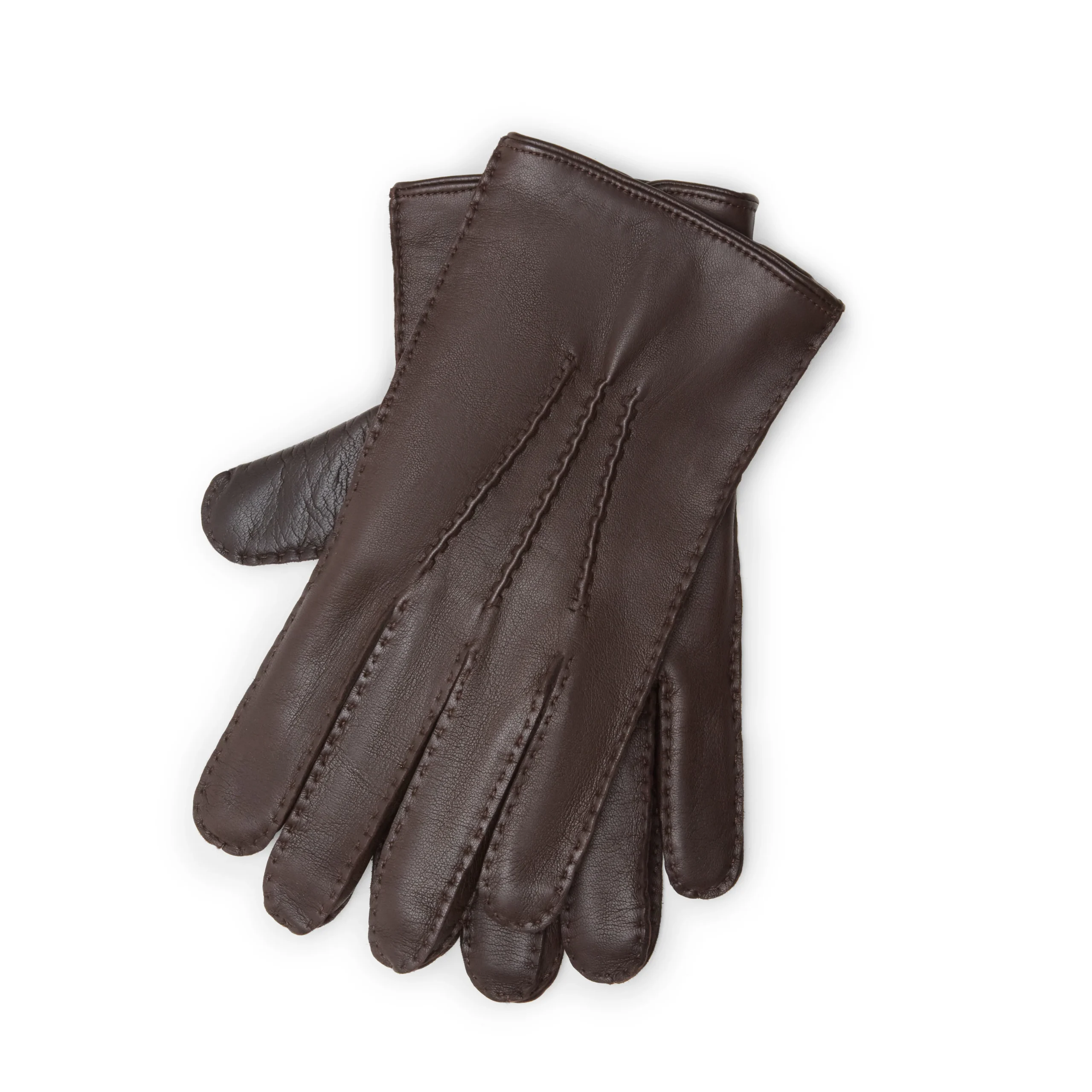 Guanto da uomo in morbida nappa color marrone. Caratterizzato da tre cordoni cuciti a mano sul dorso e spacco laterale. Il modello si caratterizza per i profili in pelle in tono.