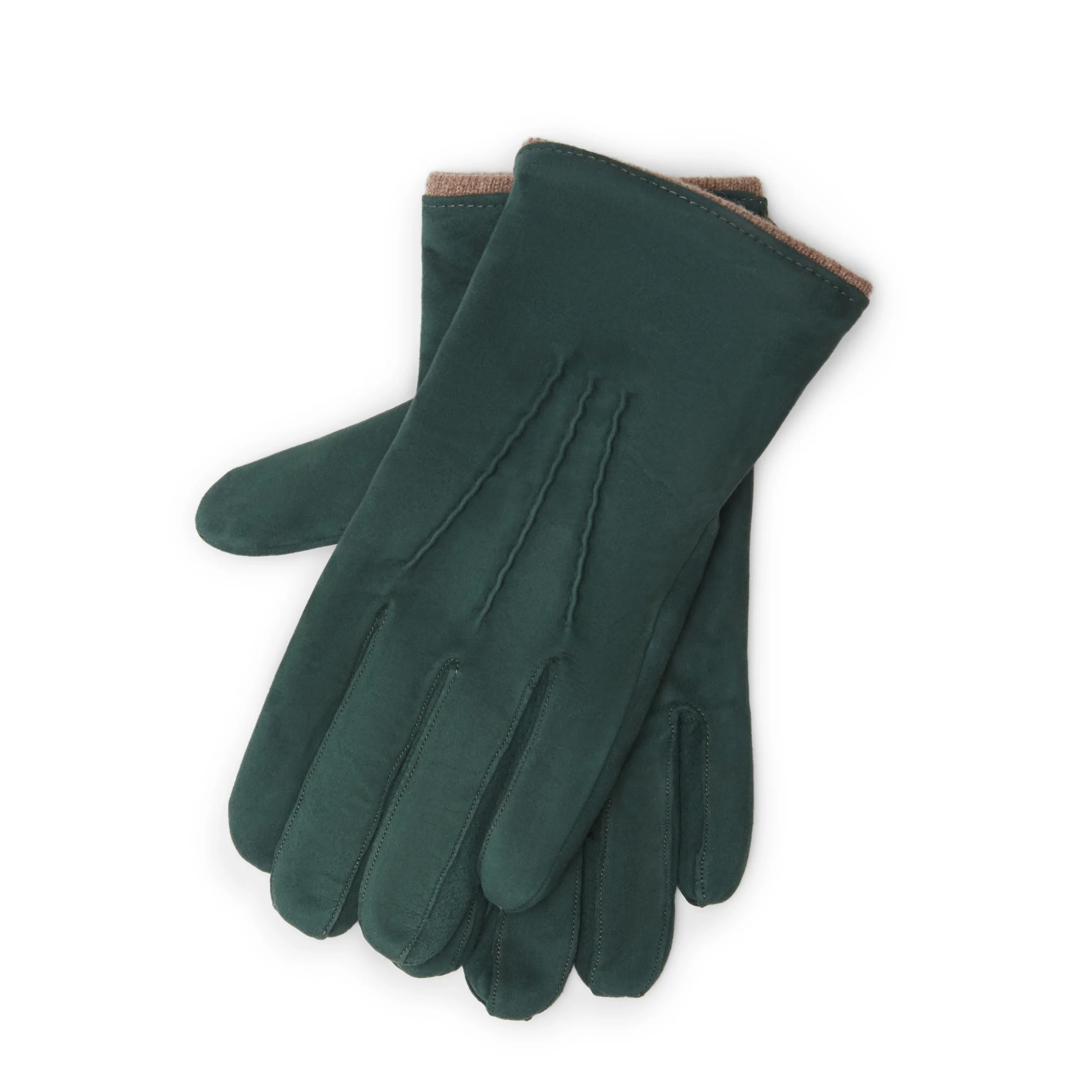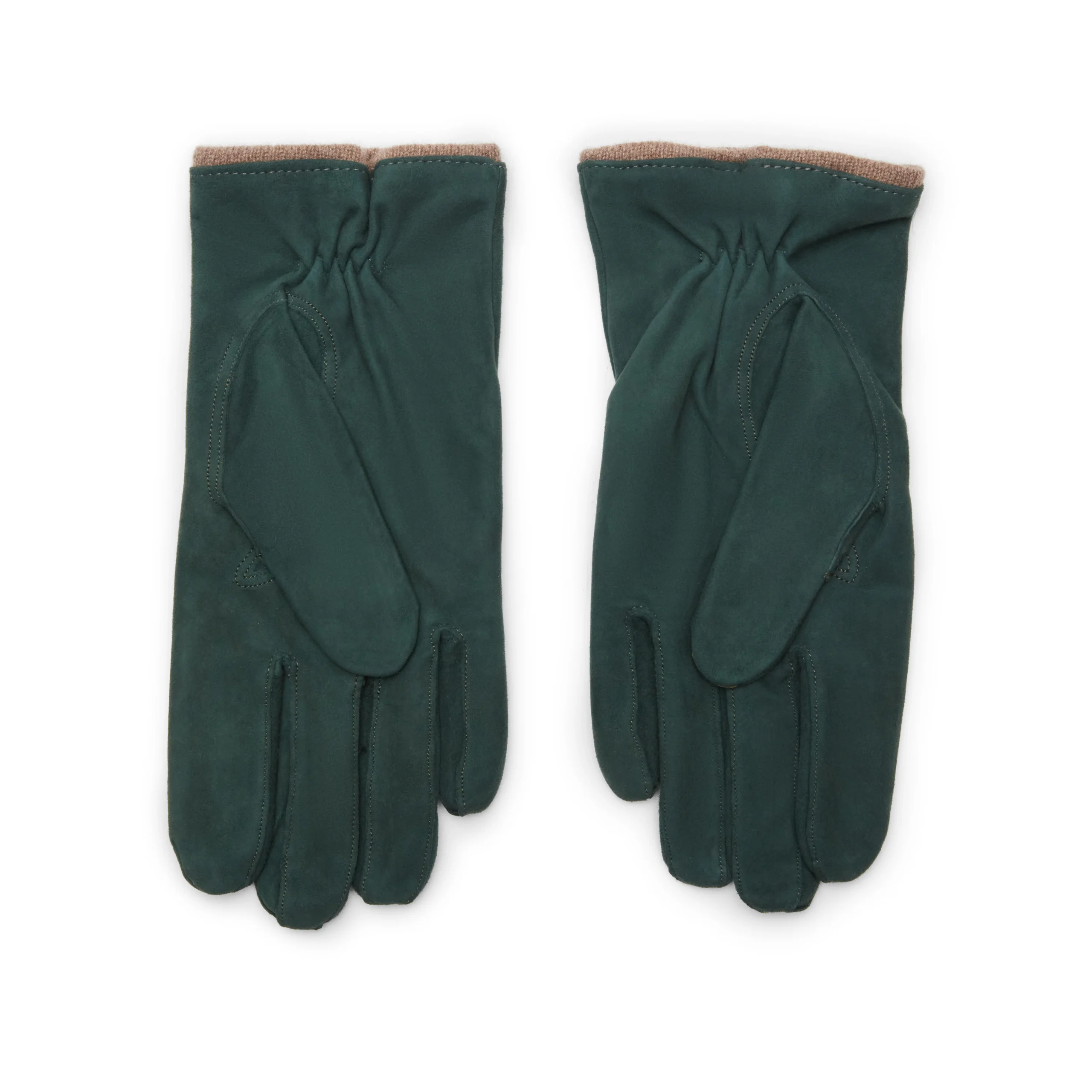 Raffinato guanto da uomo realizzato in morbida pelle scamosciata verde con tre cordoni sopramano cuciti a mano. Sottomano con elastico. Particolare dettaglio sul polso è messo in evidenza il profilo della fodera.