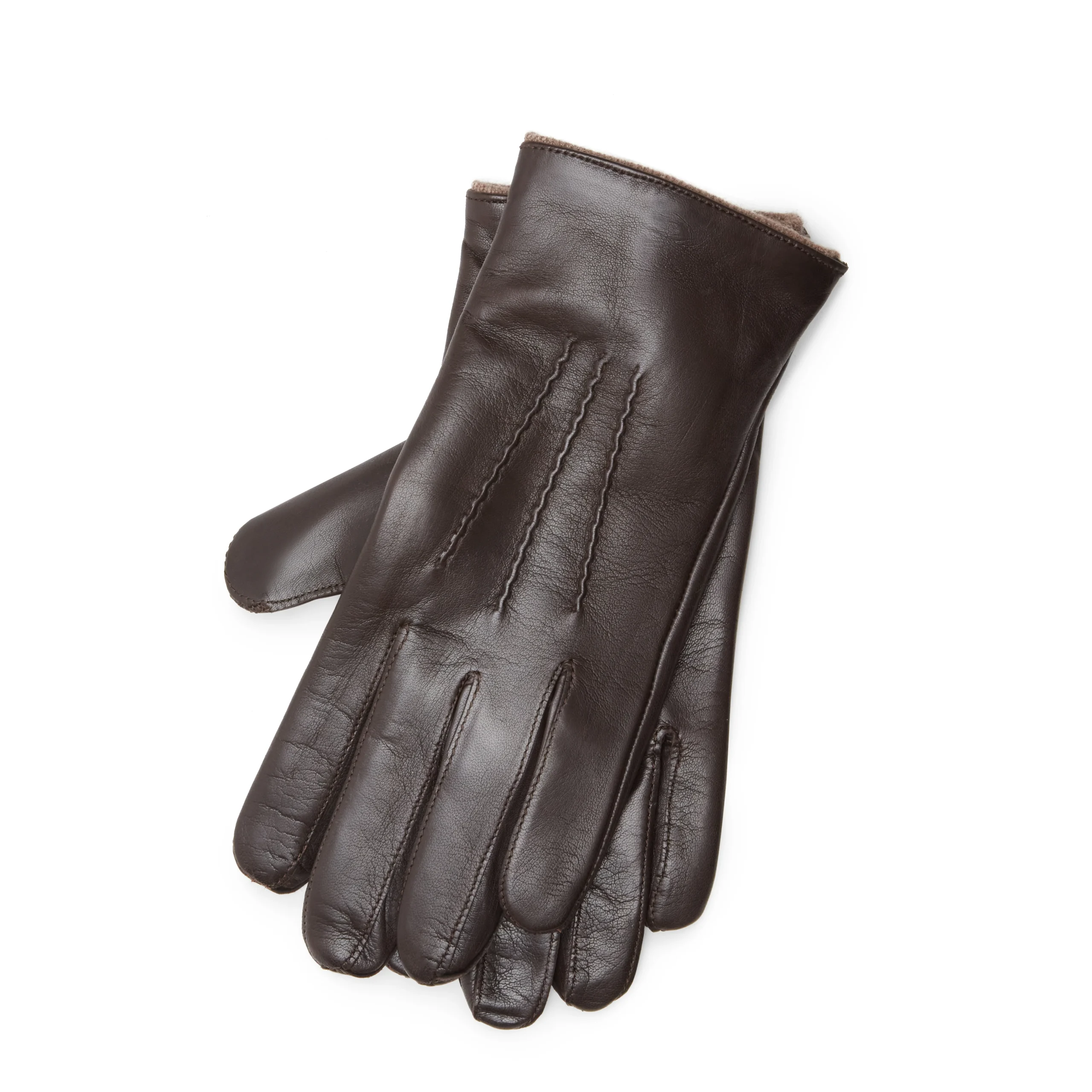 Raffinato guanto da uomo realizzato in morbida nappa marrone con tre cordoni sopramano cuciti a mano. Sottomano con elastico. Particolare dettaglio sul polso è messo in evidenza il profilo della fodera.