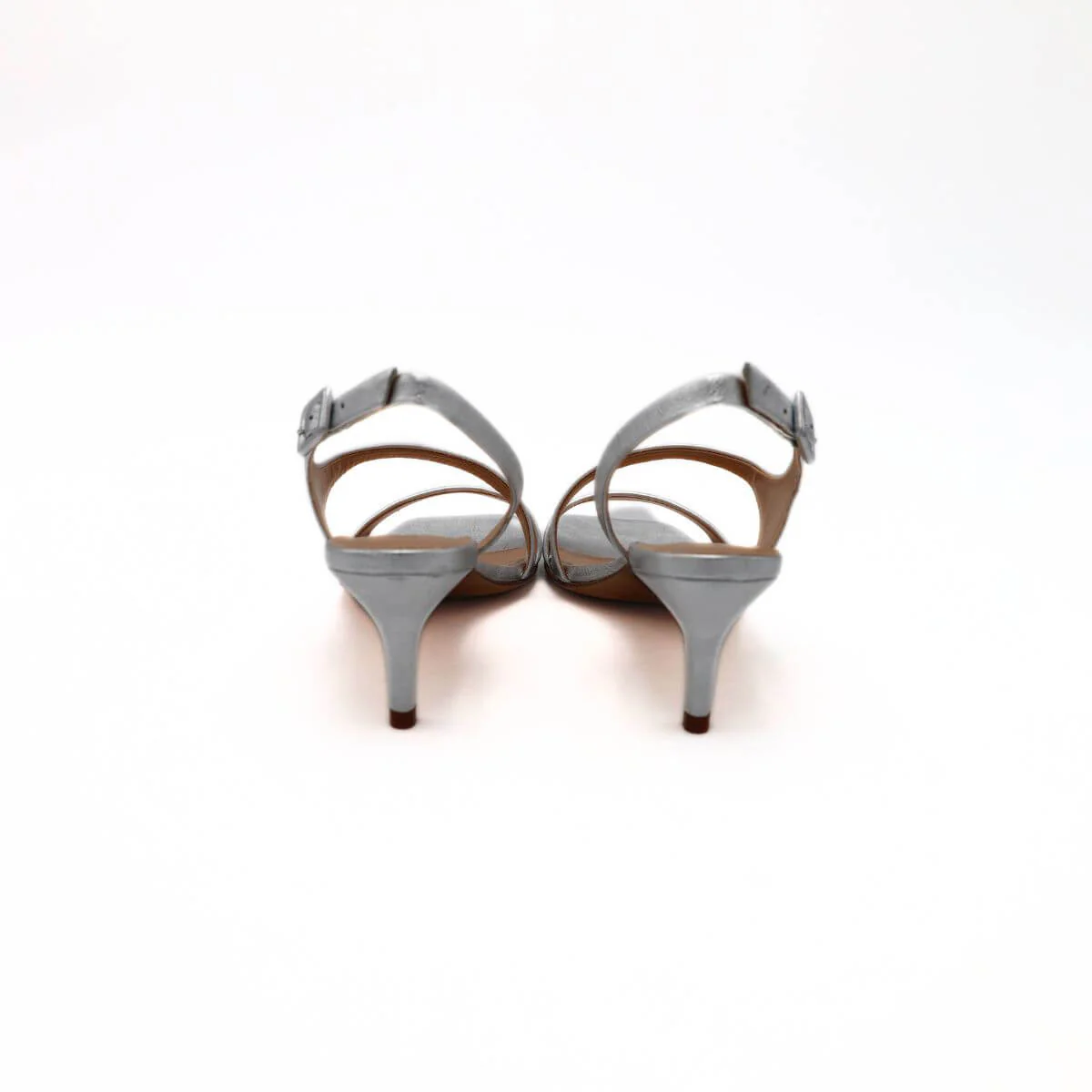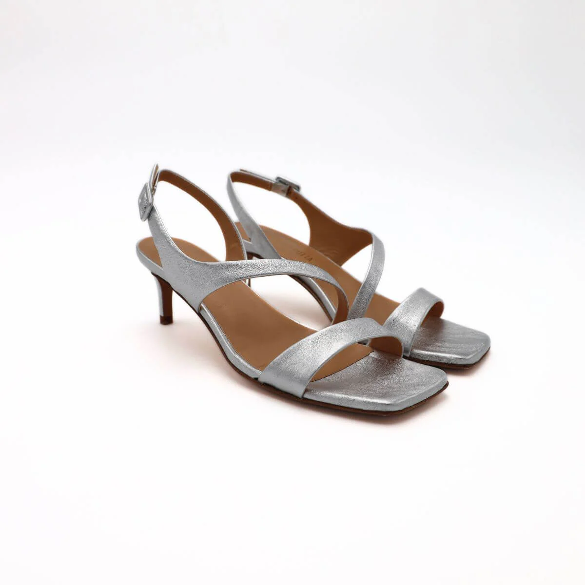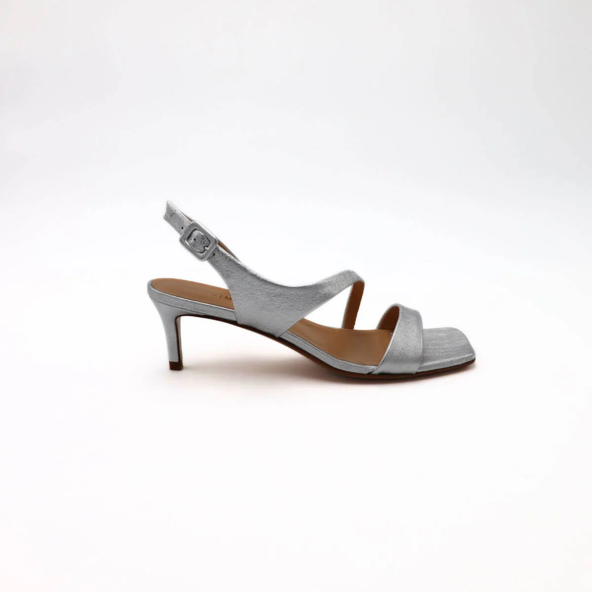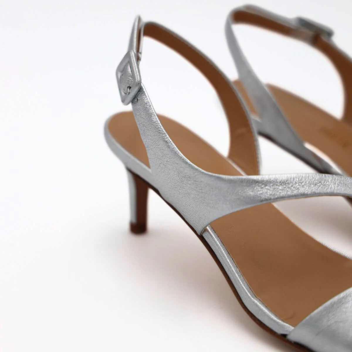 Sandalo elegante di GUGLIELMO ROTTA. Realizzato in pelle argentata, con cinturino regolabile alla caviglia. Internamente foderata in pelle, cuscinetto morbido nel sottopiede, rifinito in pelle. Suola in cuoio e tacco di 5,5 cm.