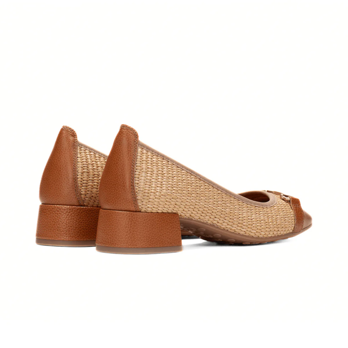 Ballerina da donna di HISPANITAS. Realizzato con una tomaia in tessuto rafia color beige, punta in pelle cuoio e decoro logo oro. Sottopiede in triflow con gel system che da comfort e assorbe gli urti e una suola in gomma per massima stabilità, tacco rivestito in pelle color cuoio (altezza: 3cm).