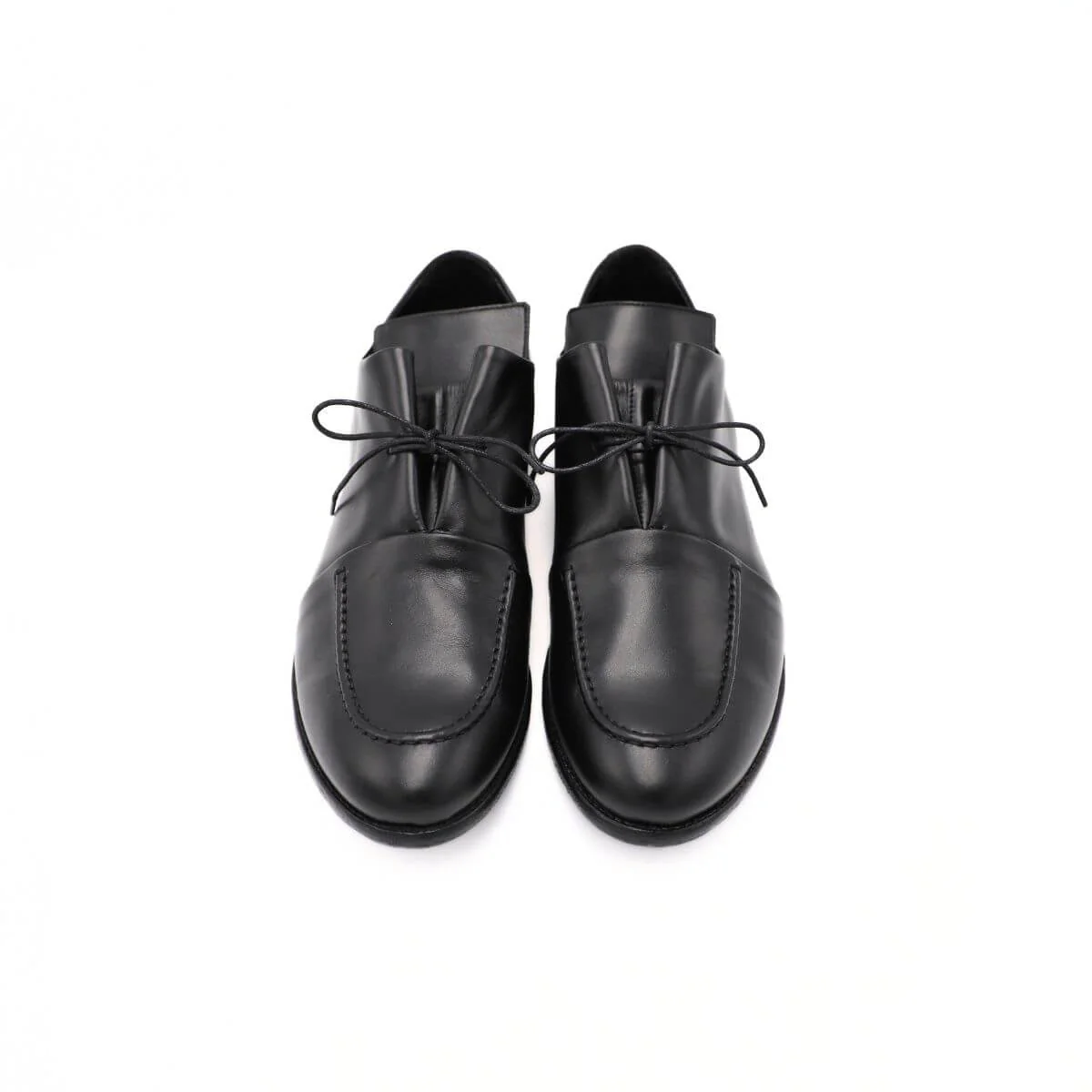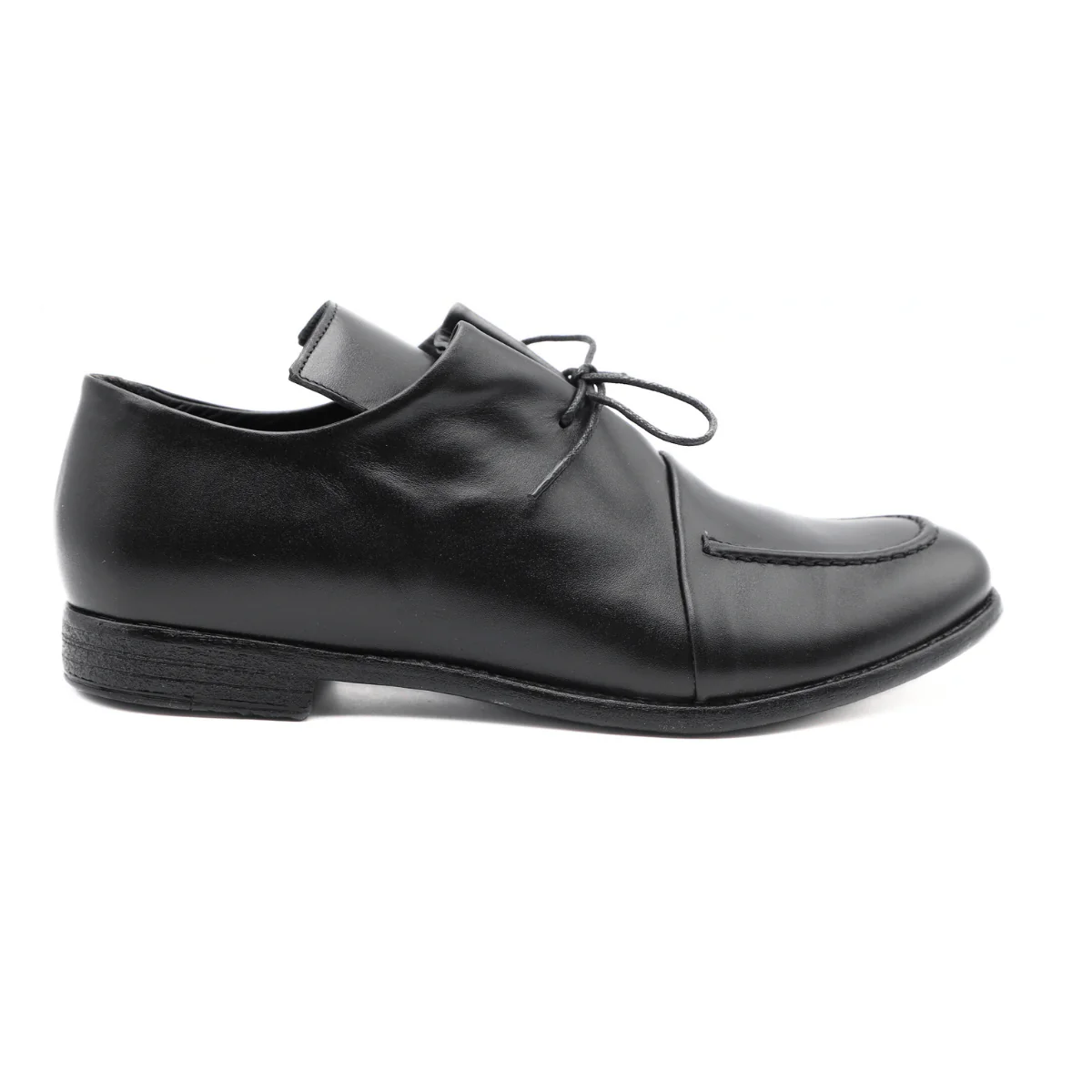 Scarpa, elegante, stringata da uomo di LE BOHÈMIEN. Tomaia realizzata in pelle nera, con cuciture a vista sul puntale. Interno foderato e sottopiede in pelle. Suola in cuoio. Chiusura con laccio fino.