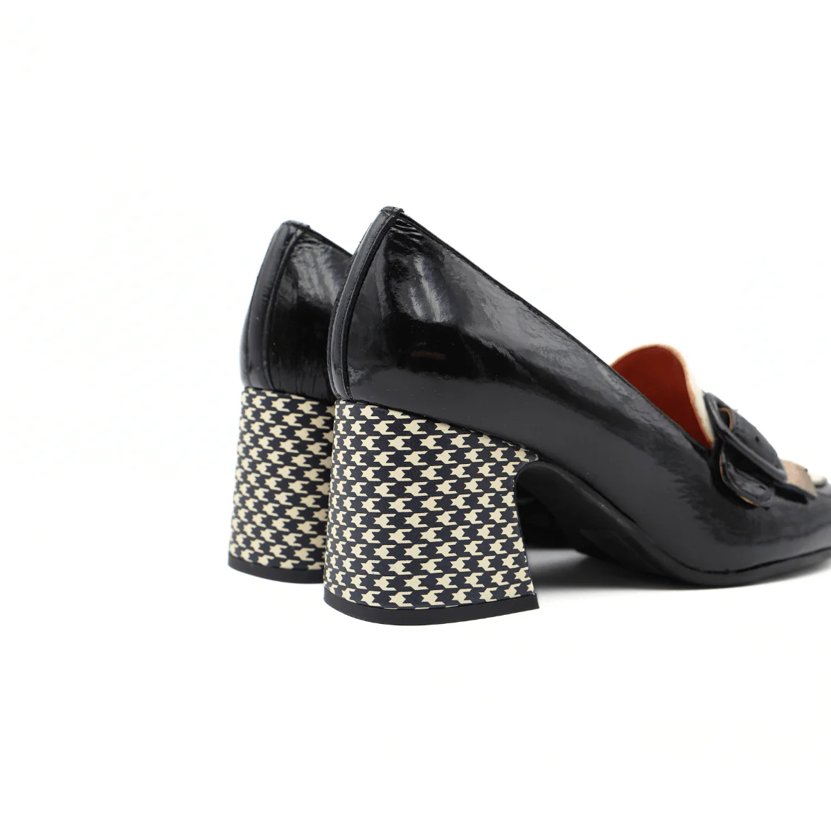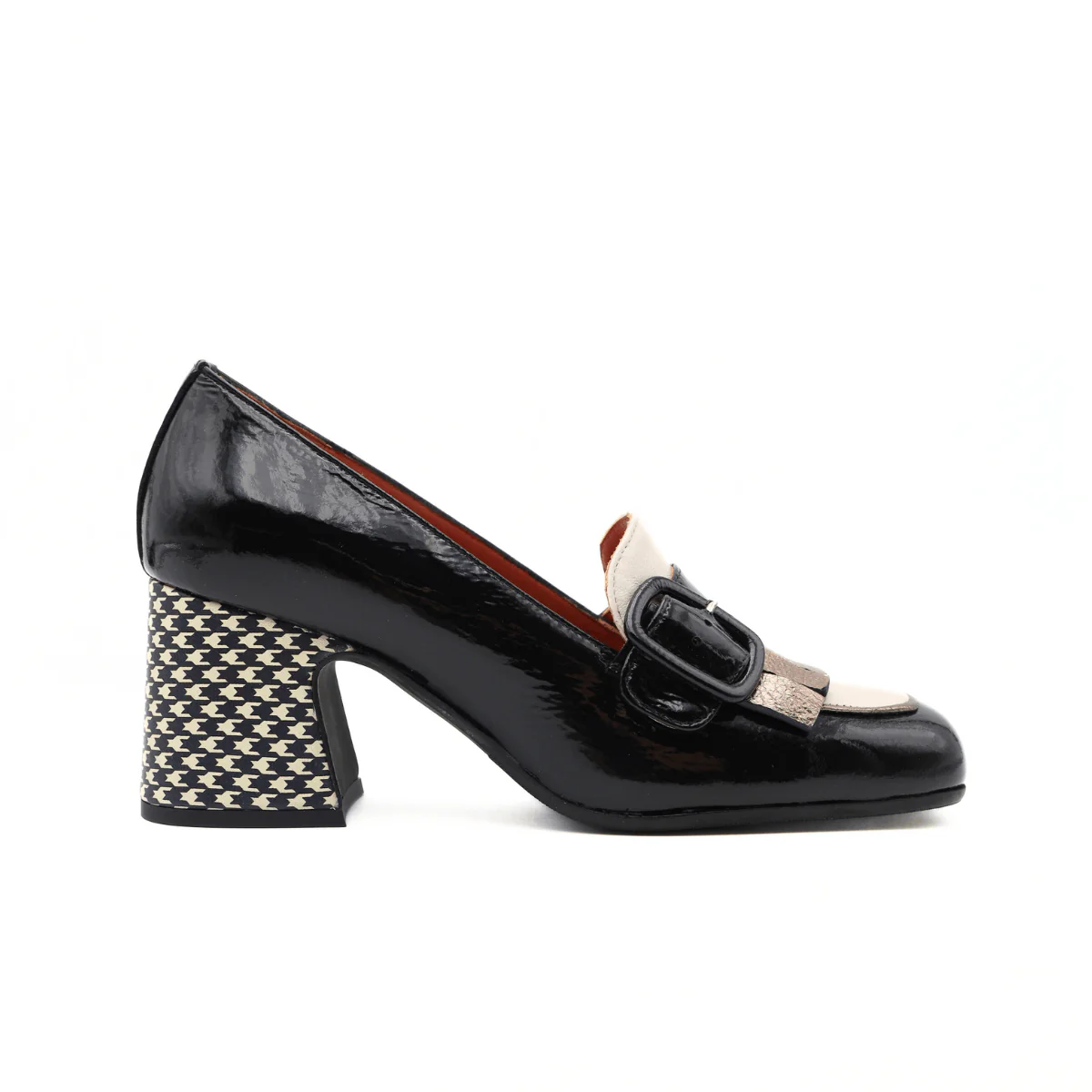 Décolleté da donna di LES: VENUES, realizzata in naplack nera con tacco con stampa con forme geometriche. Decoro con fibbia e frange decorative. Interno e sottopiede foderati in pelle. Suola in gomma. Altezza tacco: 6.5 cm MADE IN ITALY