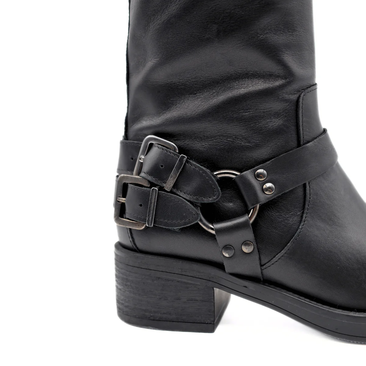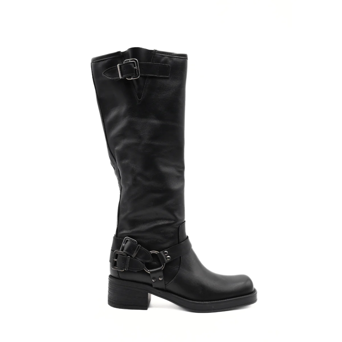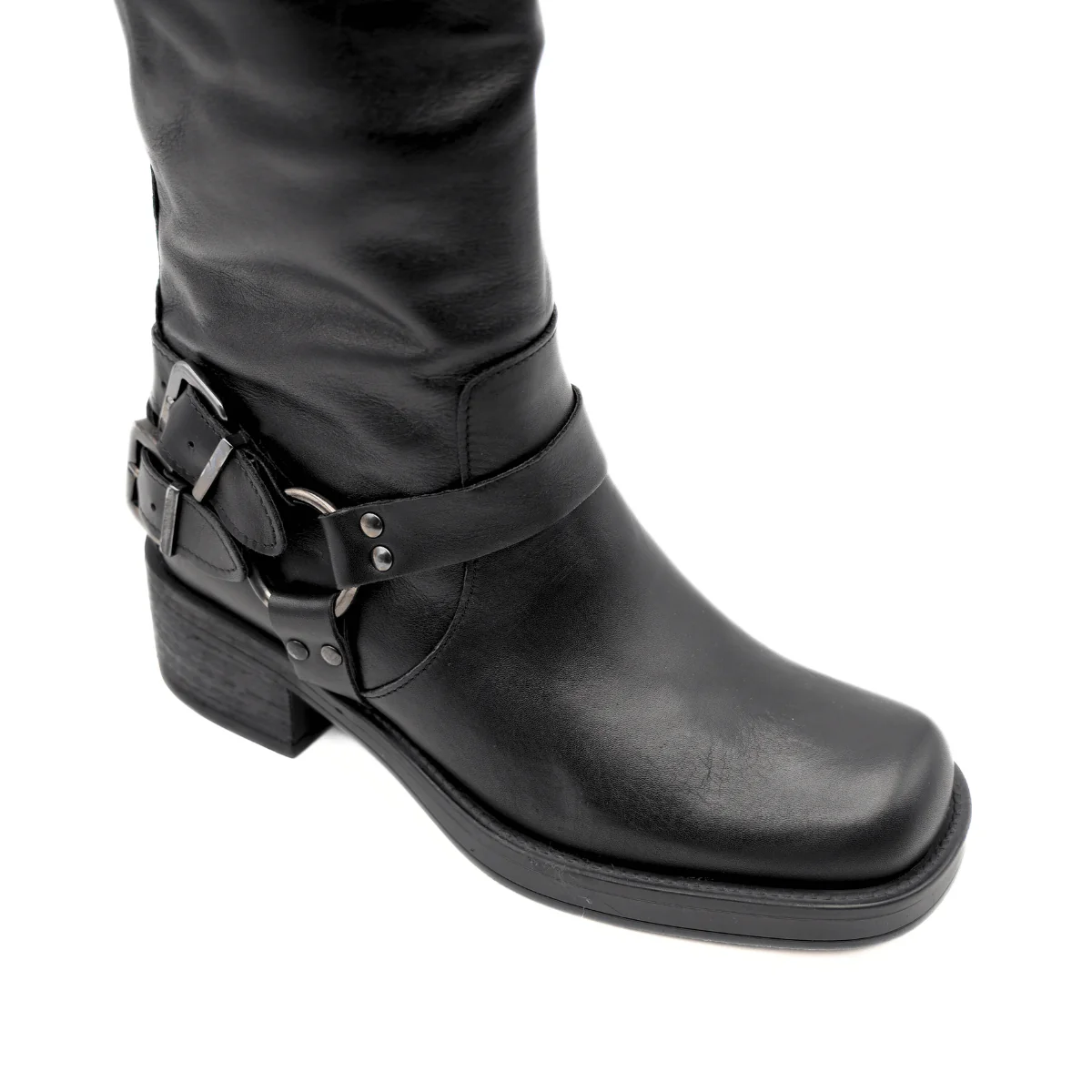 Stivale alto, anfibio, da donna di MAD MIND. Realizzato in pelle nera con fibbie sul gambale e sulla caviglia. Suola in gomma. Altezza gambale: 36cm Altezza tacco: 4cm MADE IN ITALY