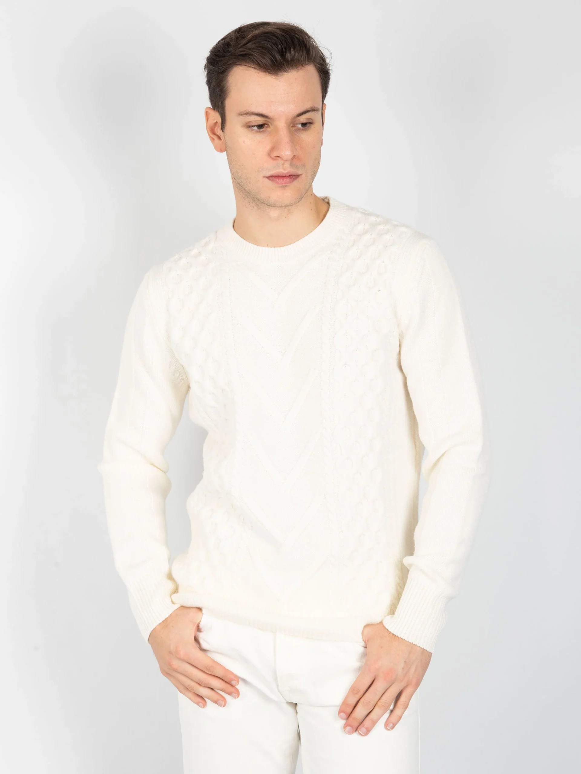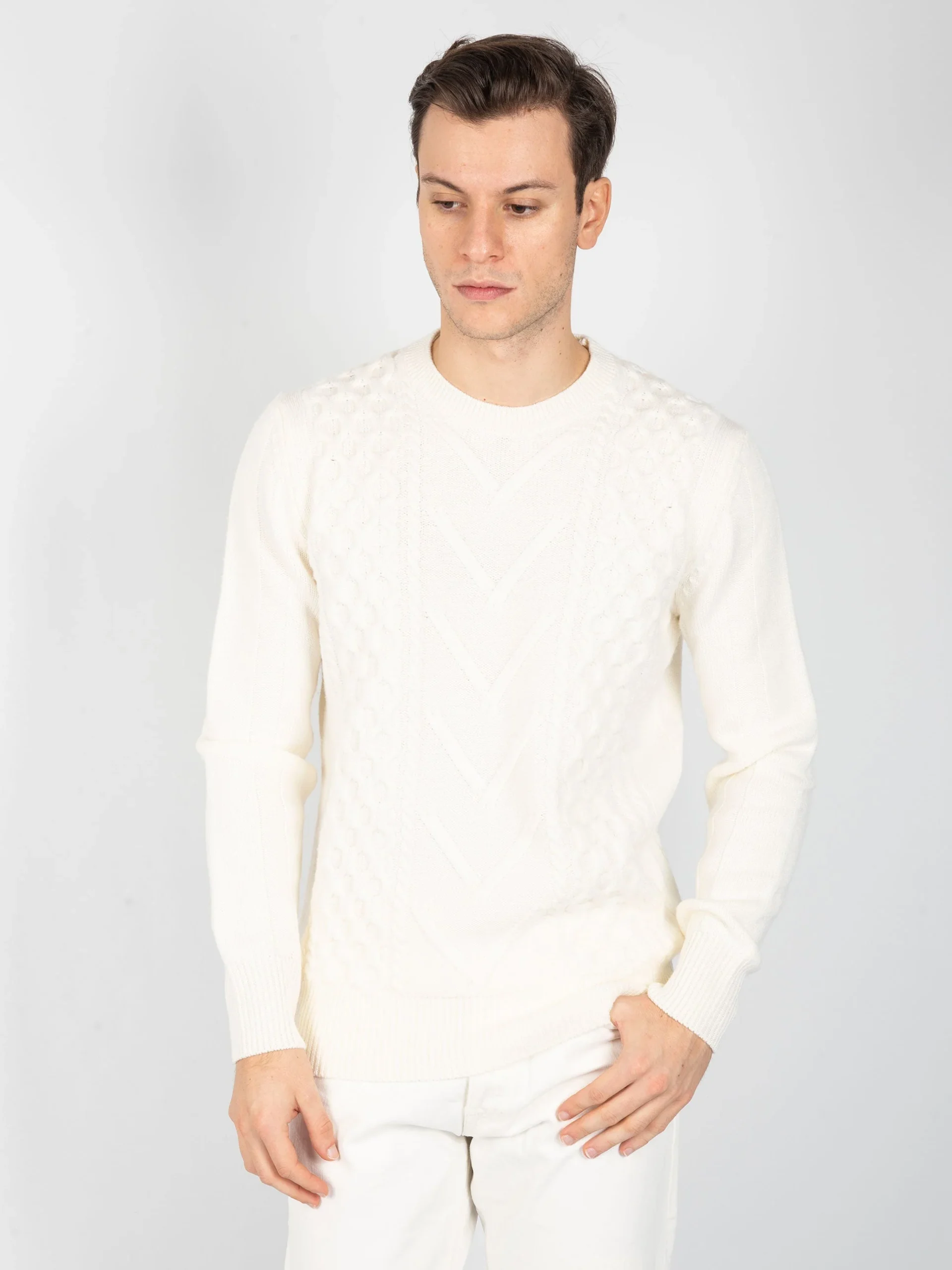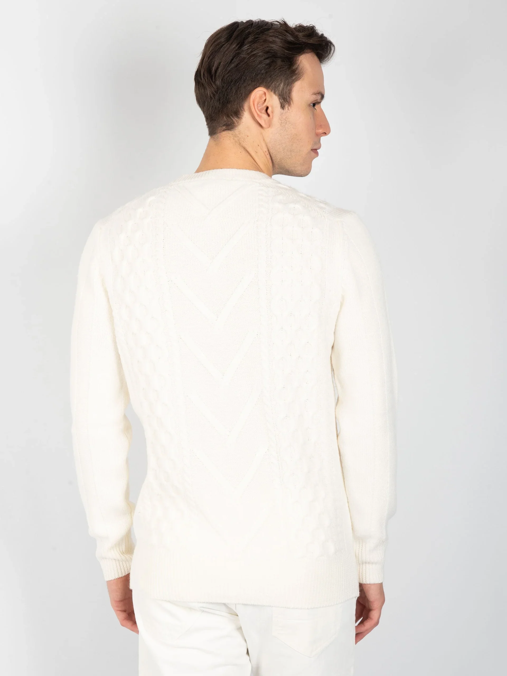 - Maglia girocollo in 100% lana merinos con lavorazione interna a trecce e rombi.