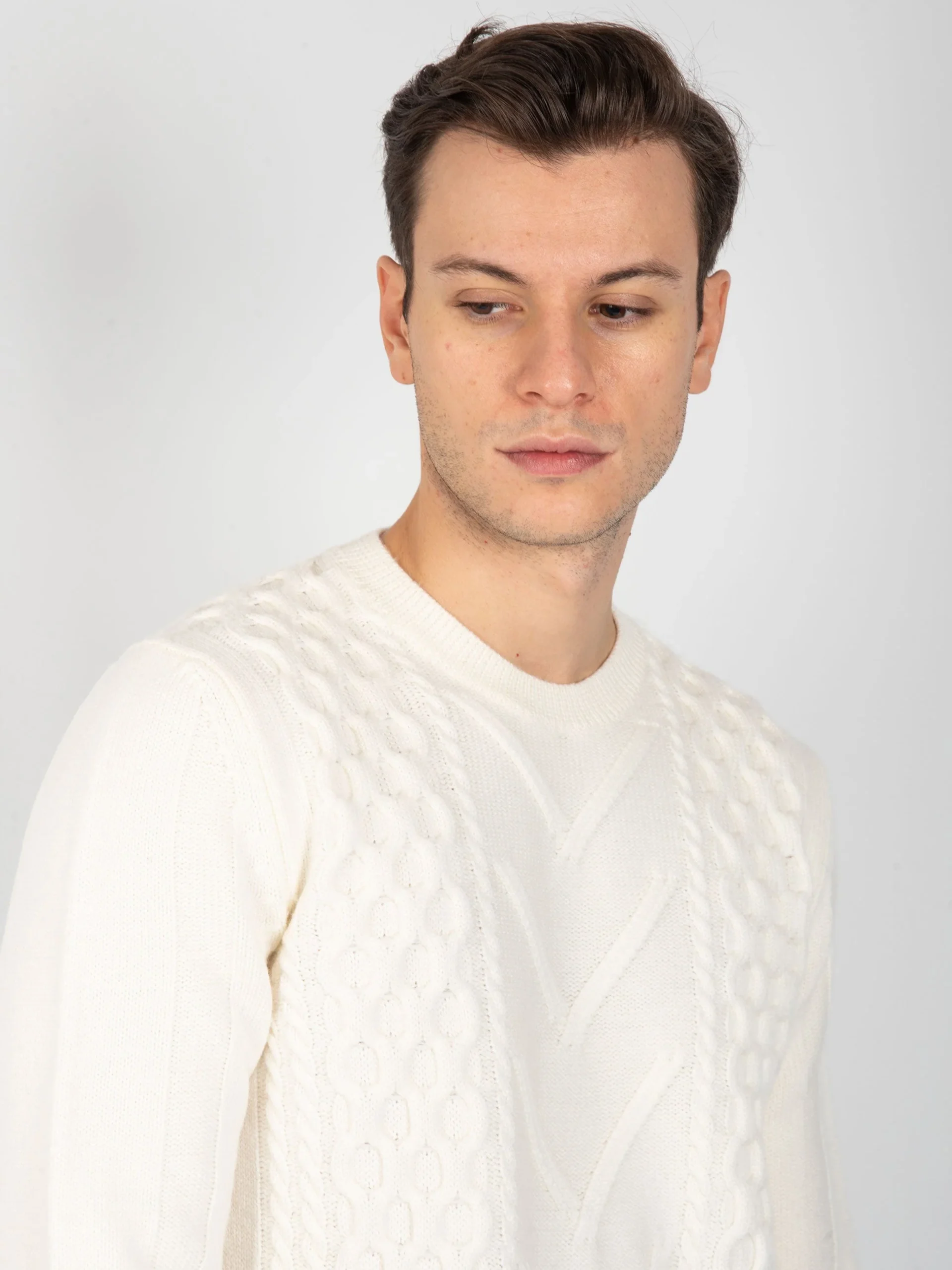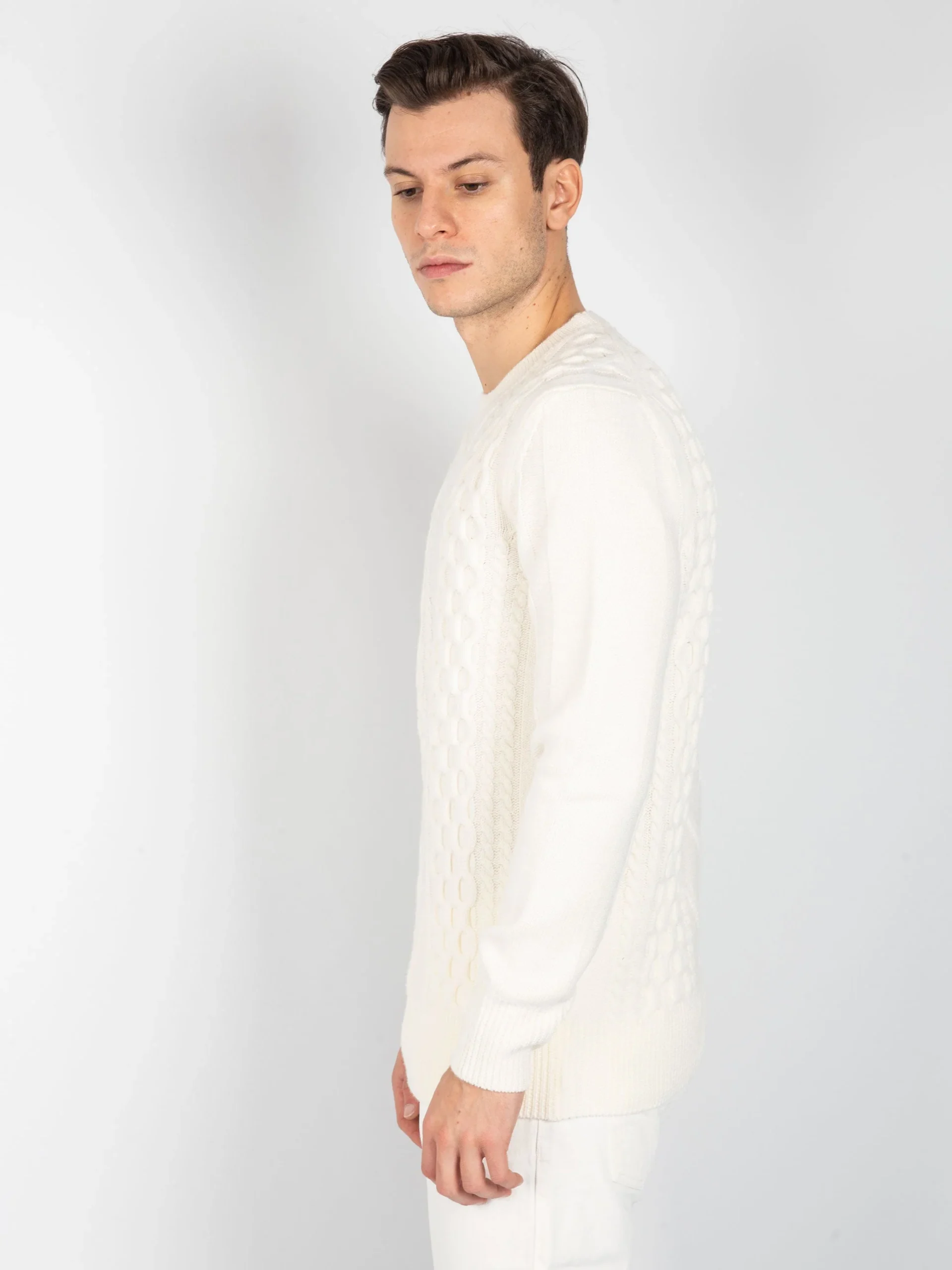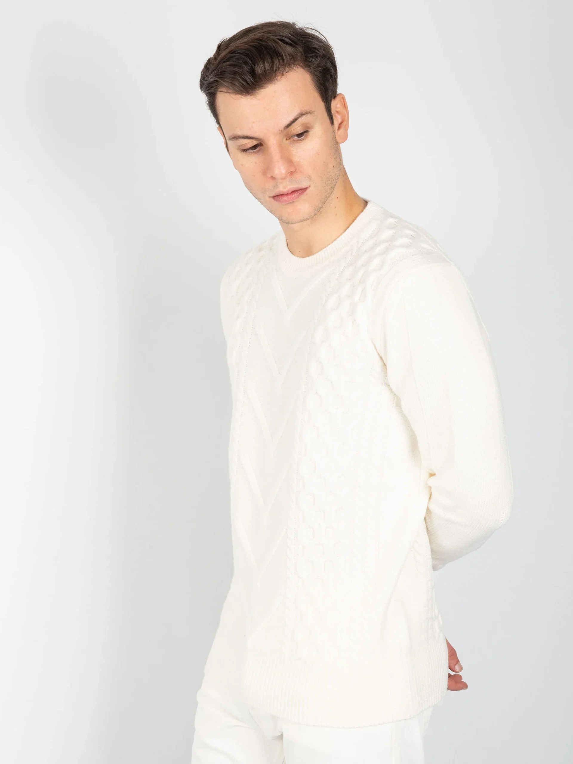 - Maglia girocollo in 100% lana merinos con lavorazione interna a trecce e rombi.