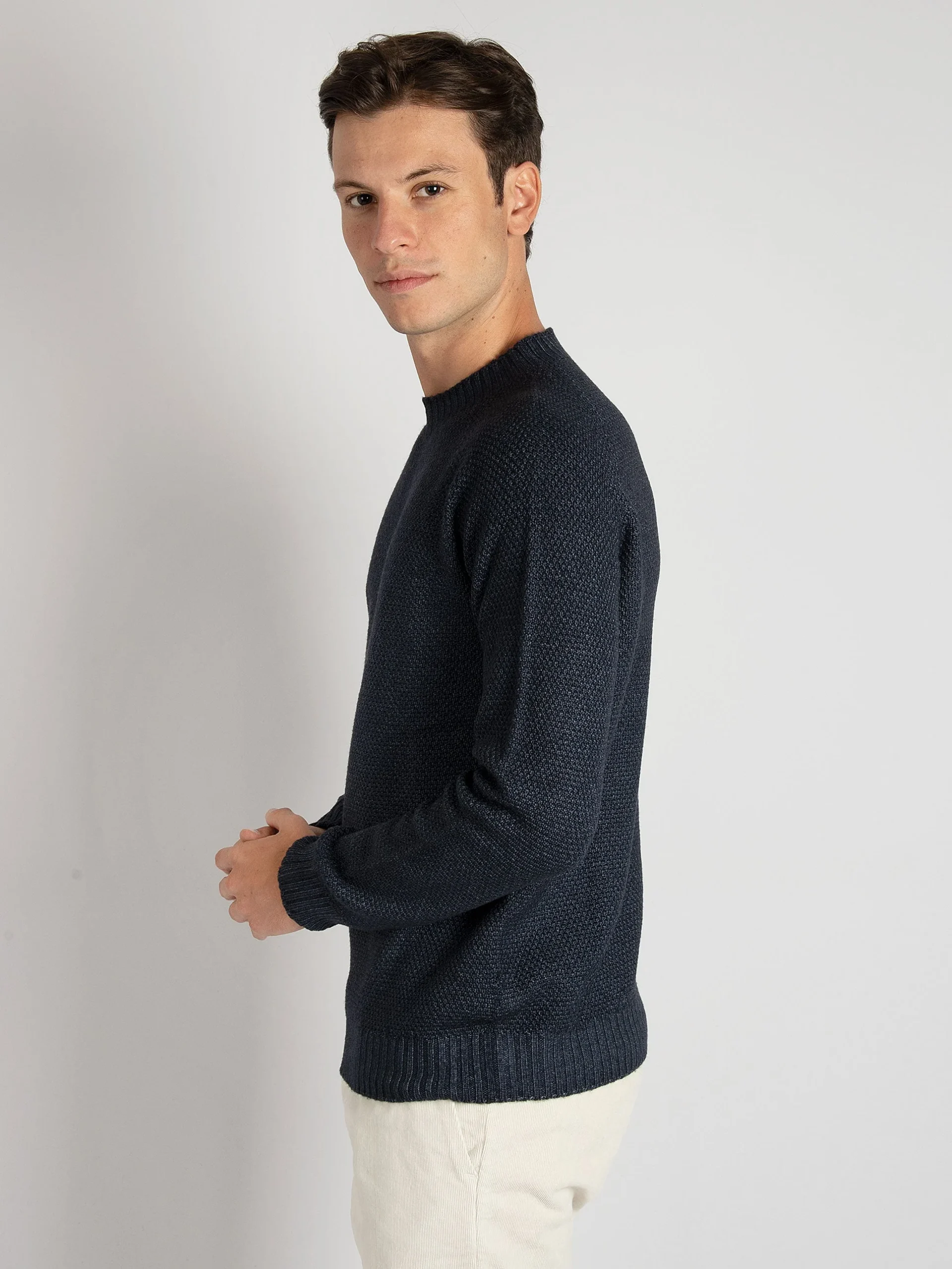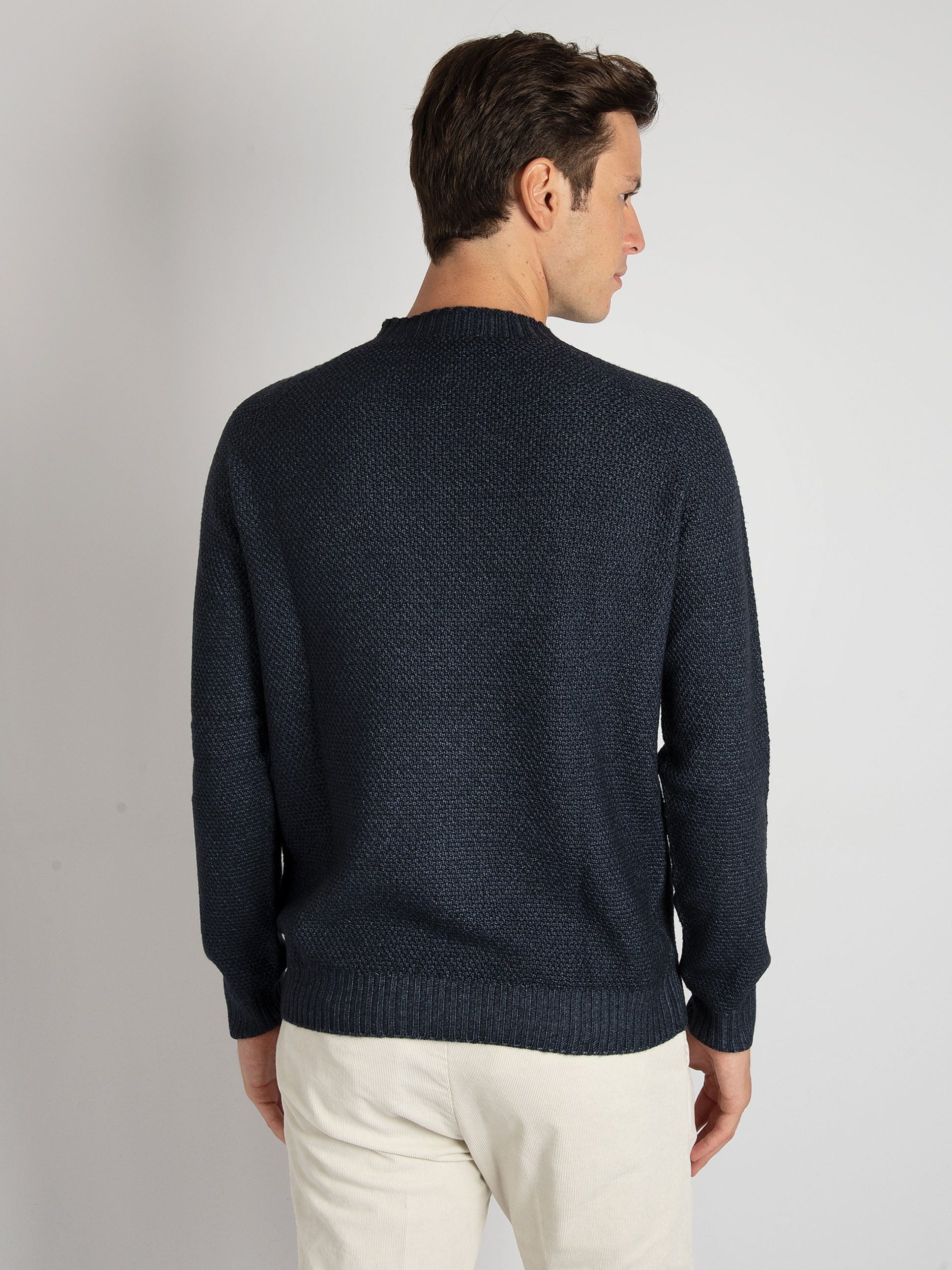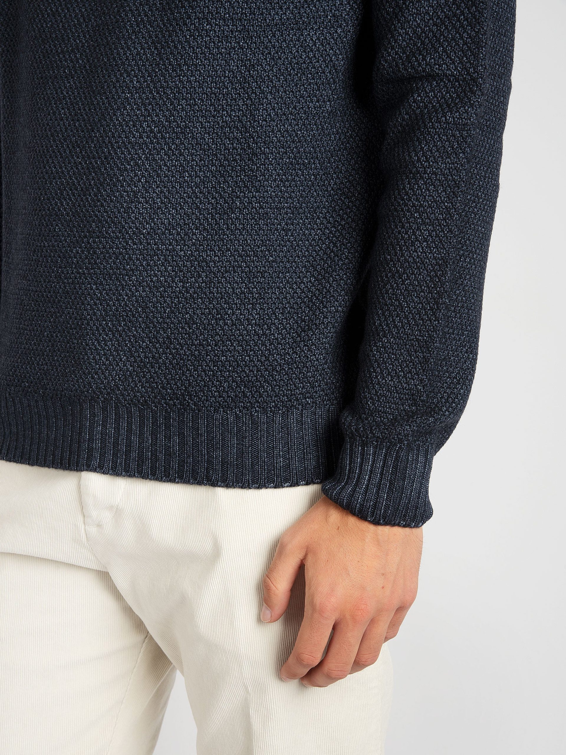 Mod: GIROCOLLO SPORT GRANARISO NAVY HS3651 90 Maglia in 100% lana merinos lavorata a grana riso allungato. Colore non uniforme dovuto ad una tintura molecolare brevettata. Cannolè sul fondo e polsini. 100% pensato e prodotto in Italia. Il modello è alto 184 cm e pesa 73 kg: indossa una taglia 50.
