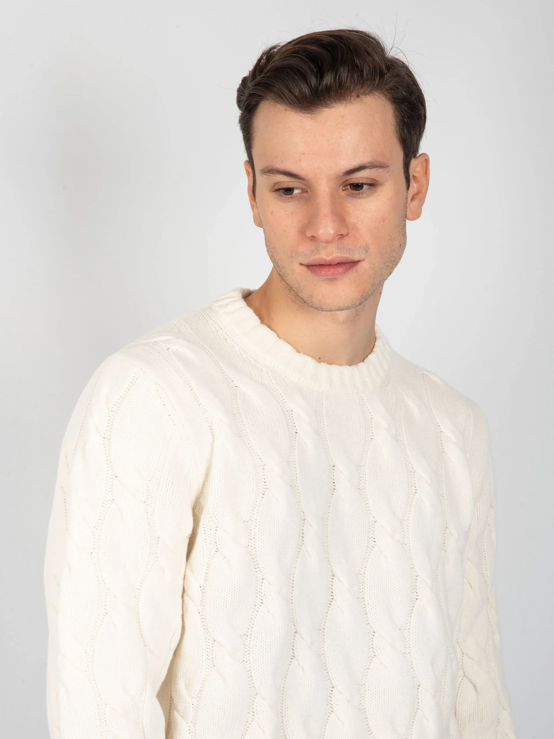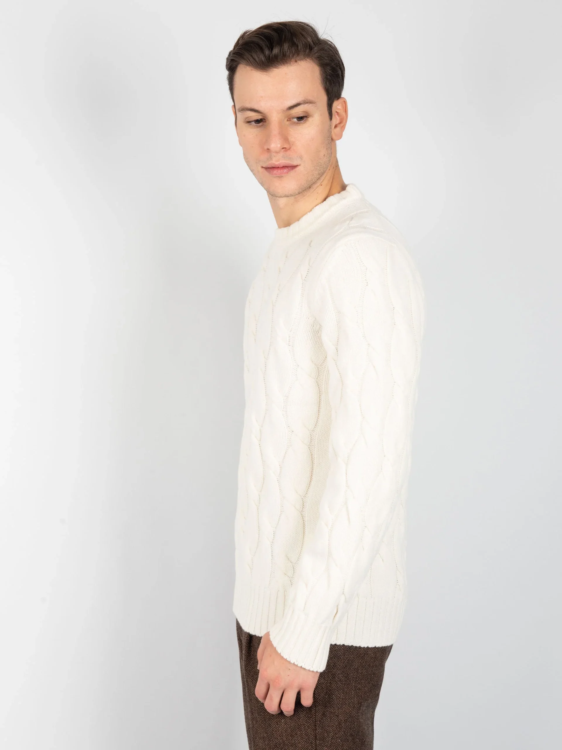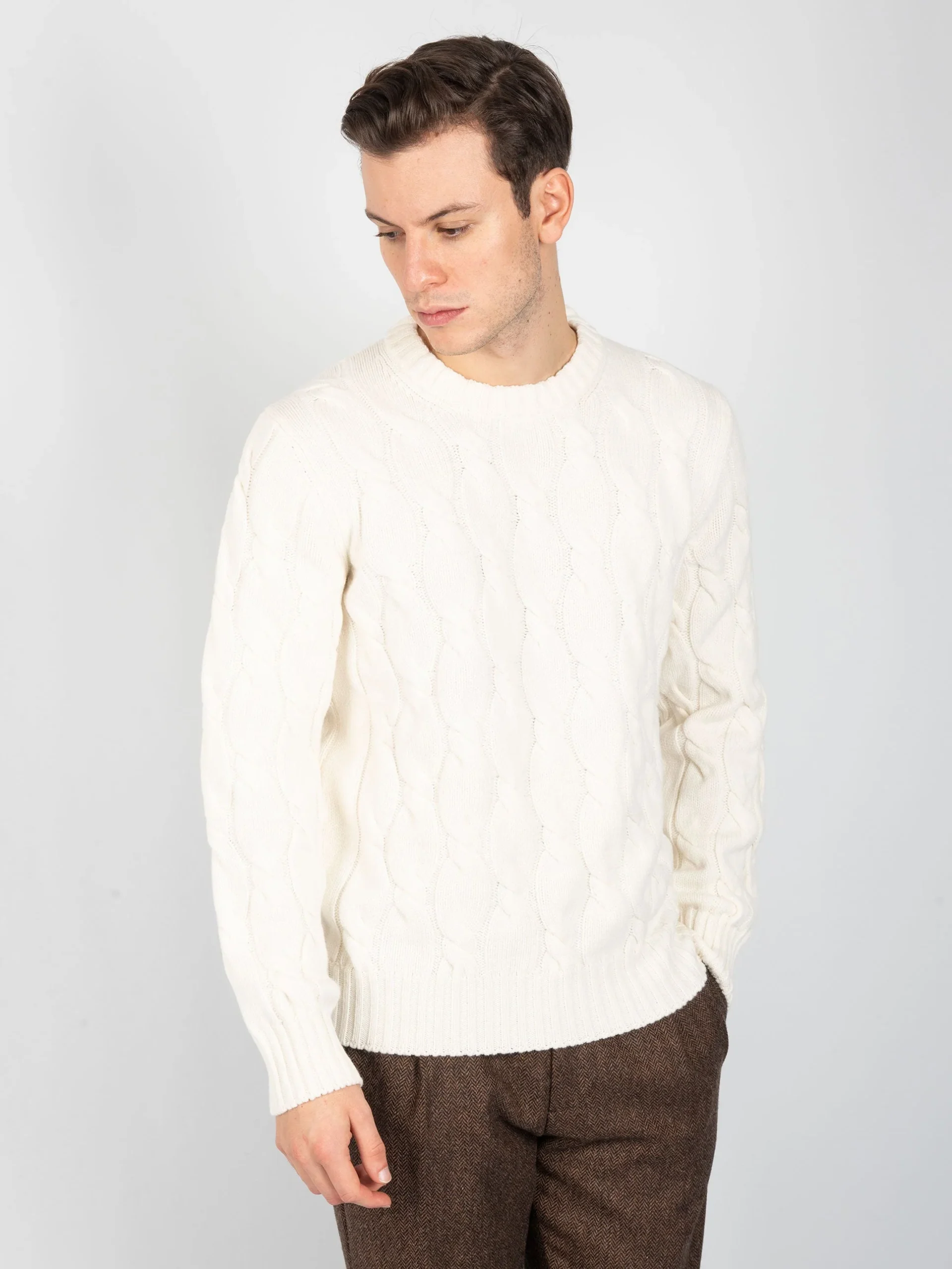 - Maglia girocollo in lana con lavorazione interna a trecce.