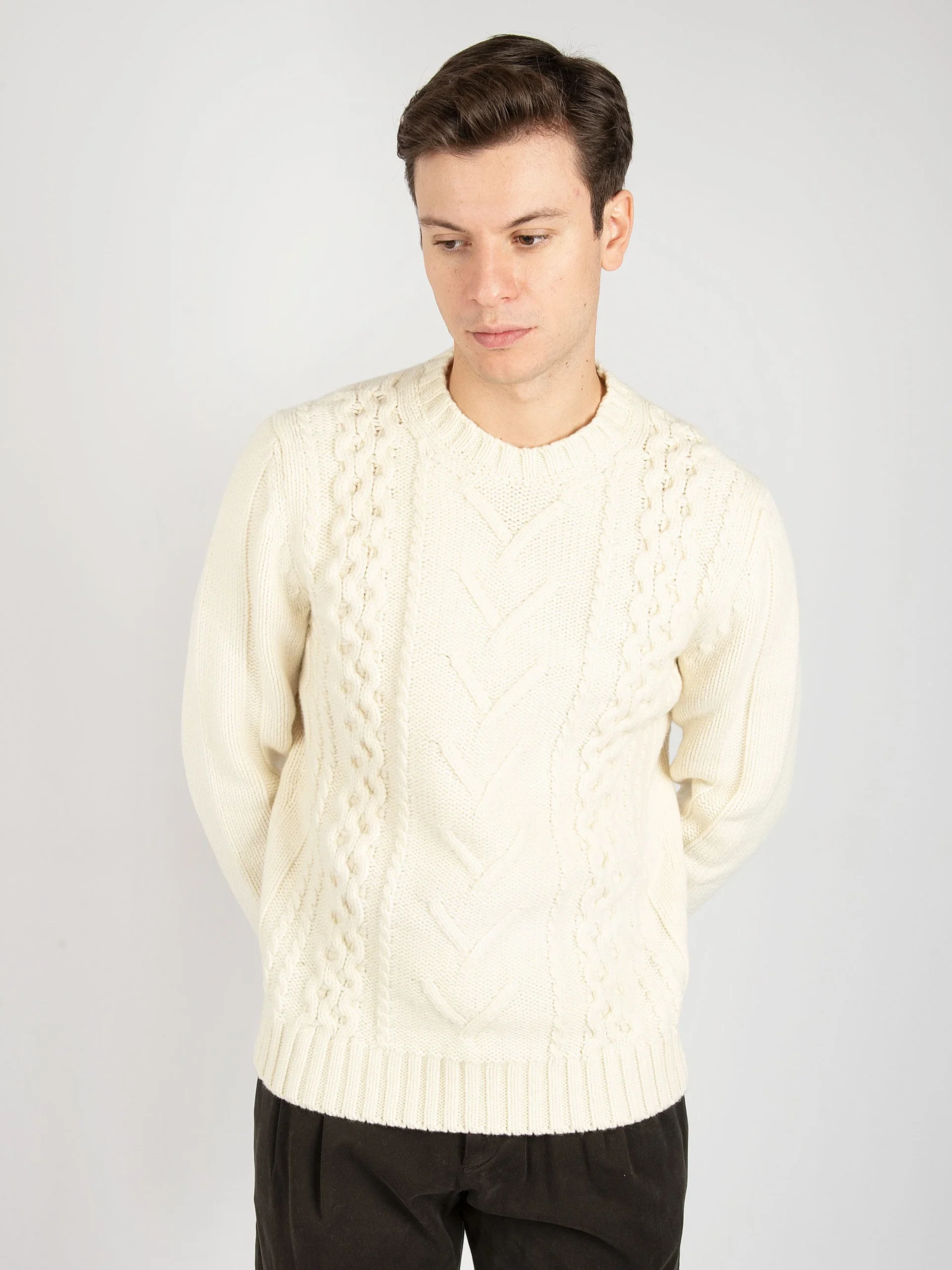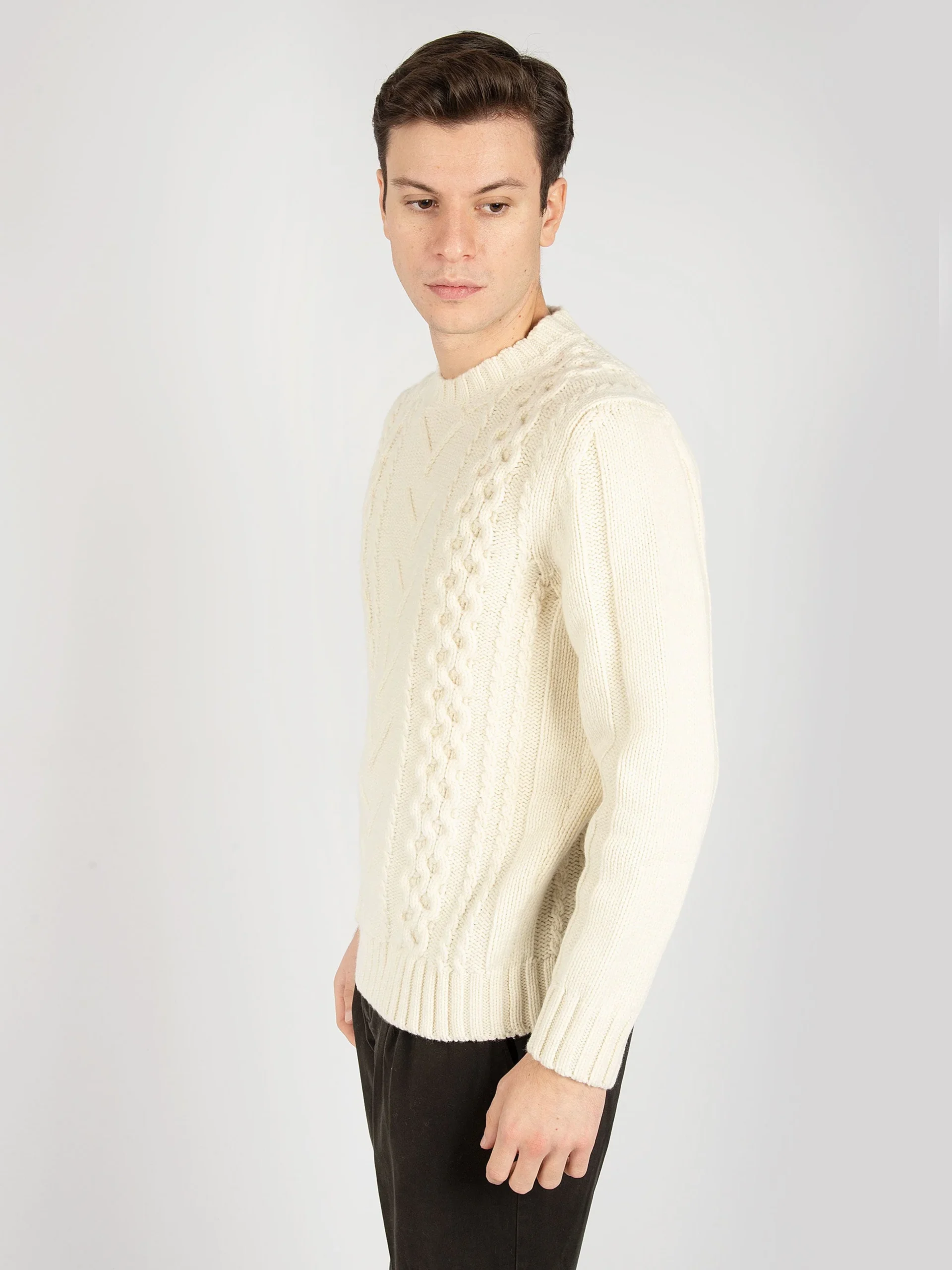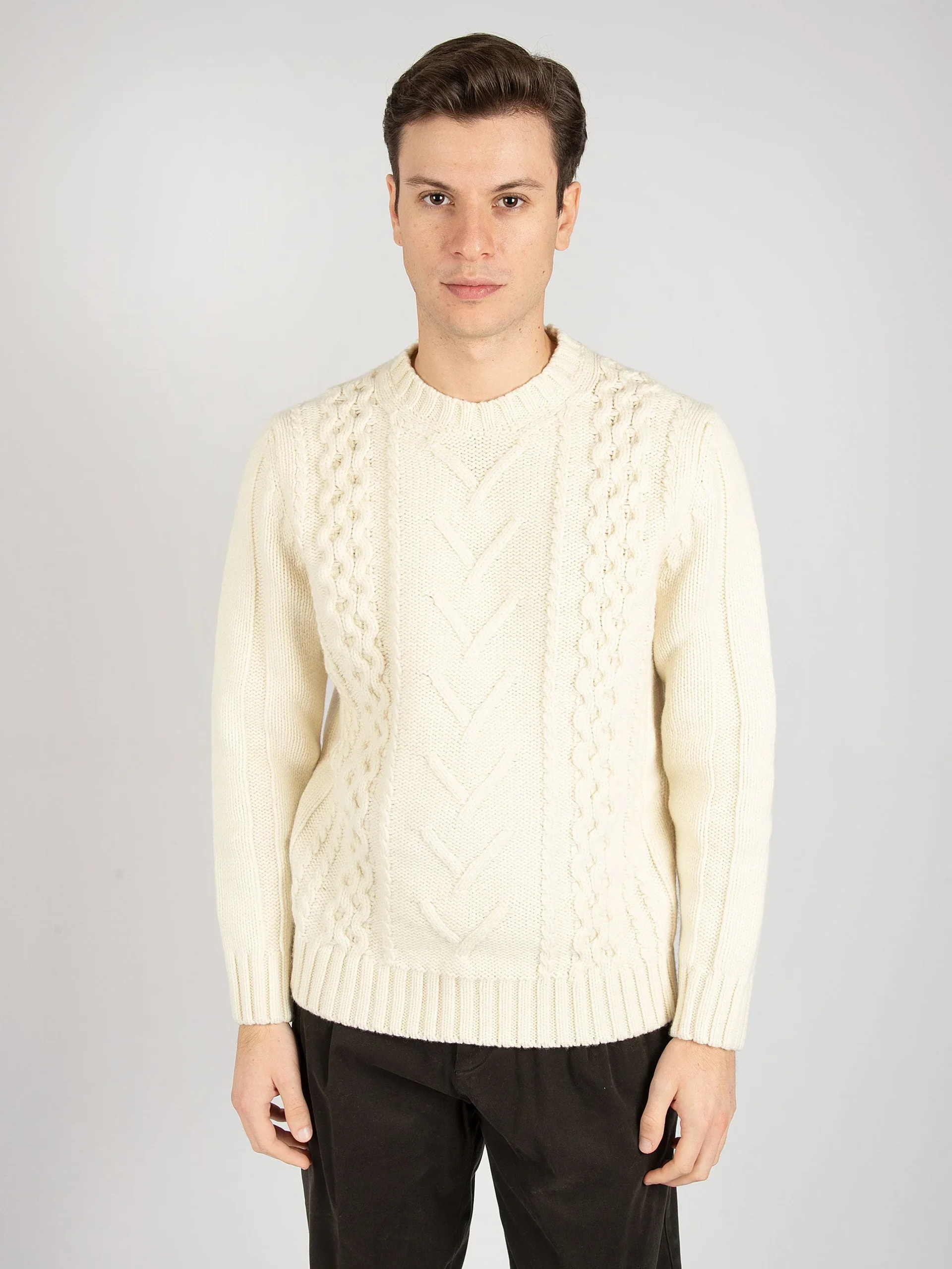 - Maglia girocollo in 100% lana merinos con lavorazione interna a trecce e rombi.