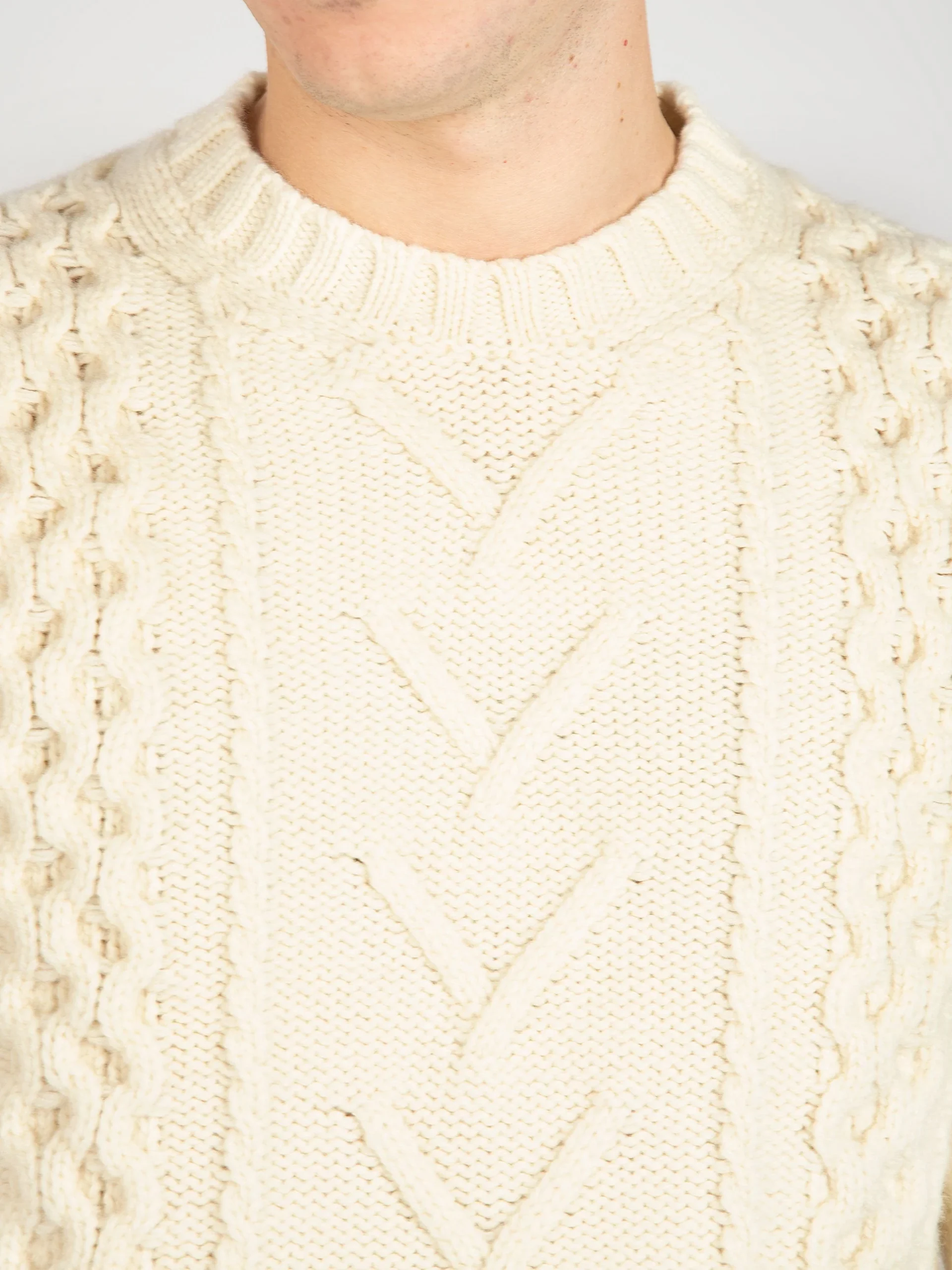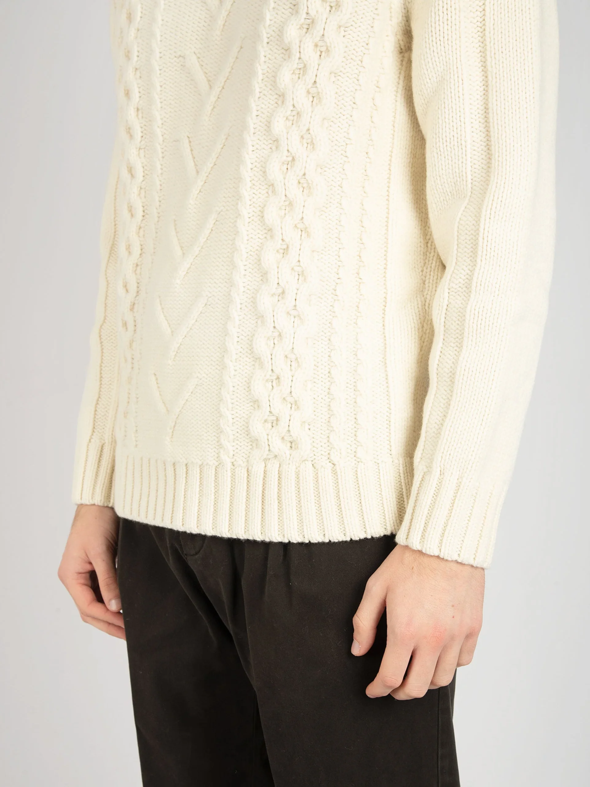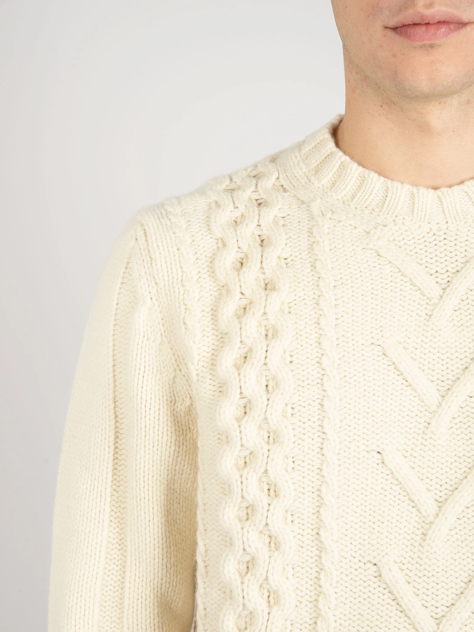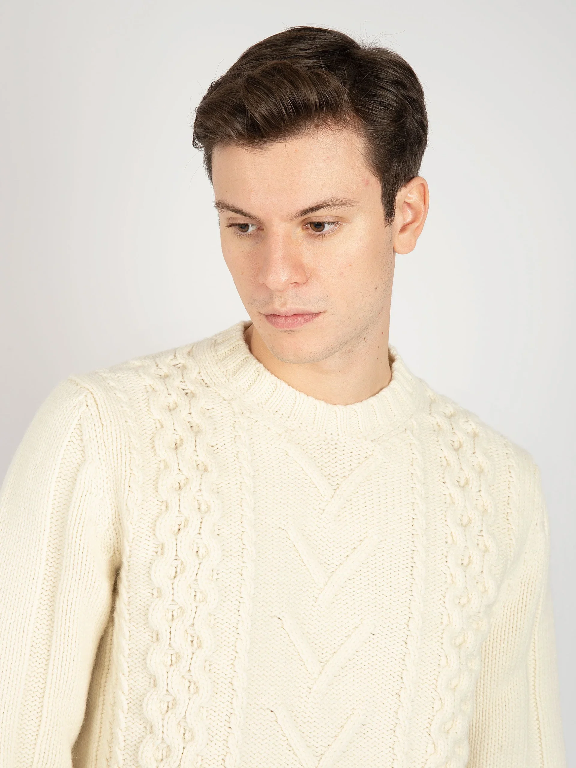 - Maglia girocollo in 100% lana merinos con lavorazione interna a trecce e rombi.