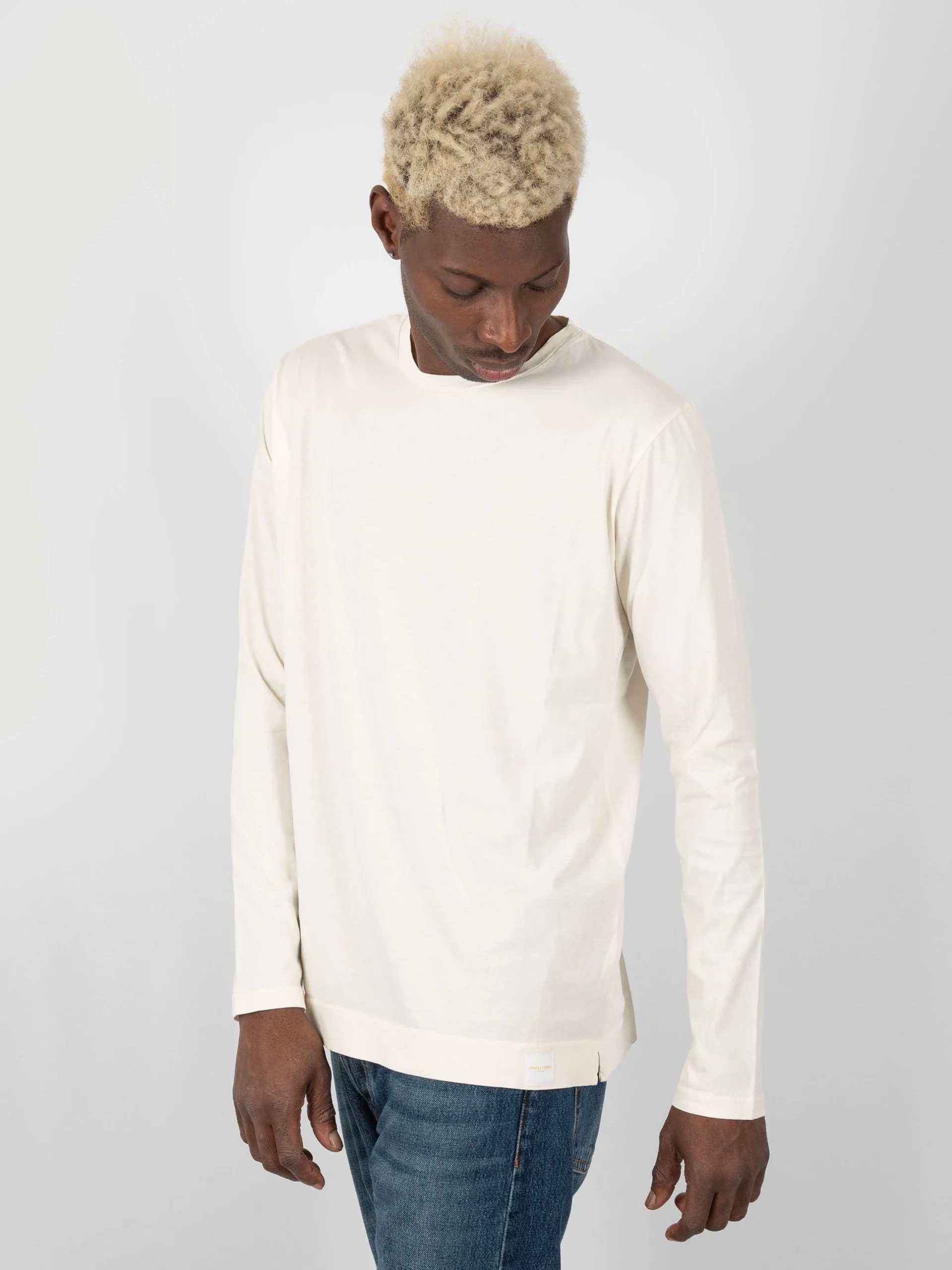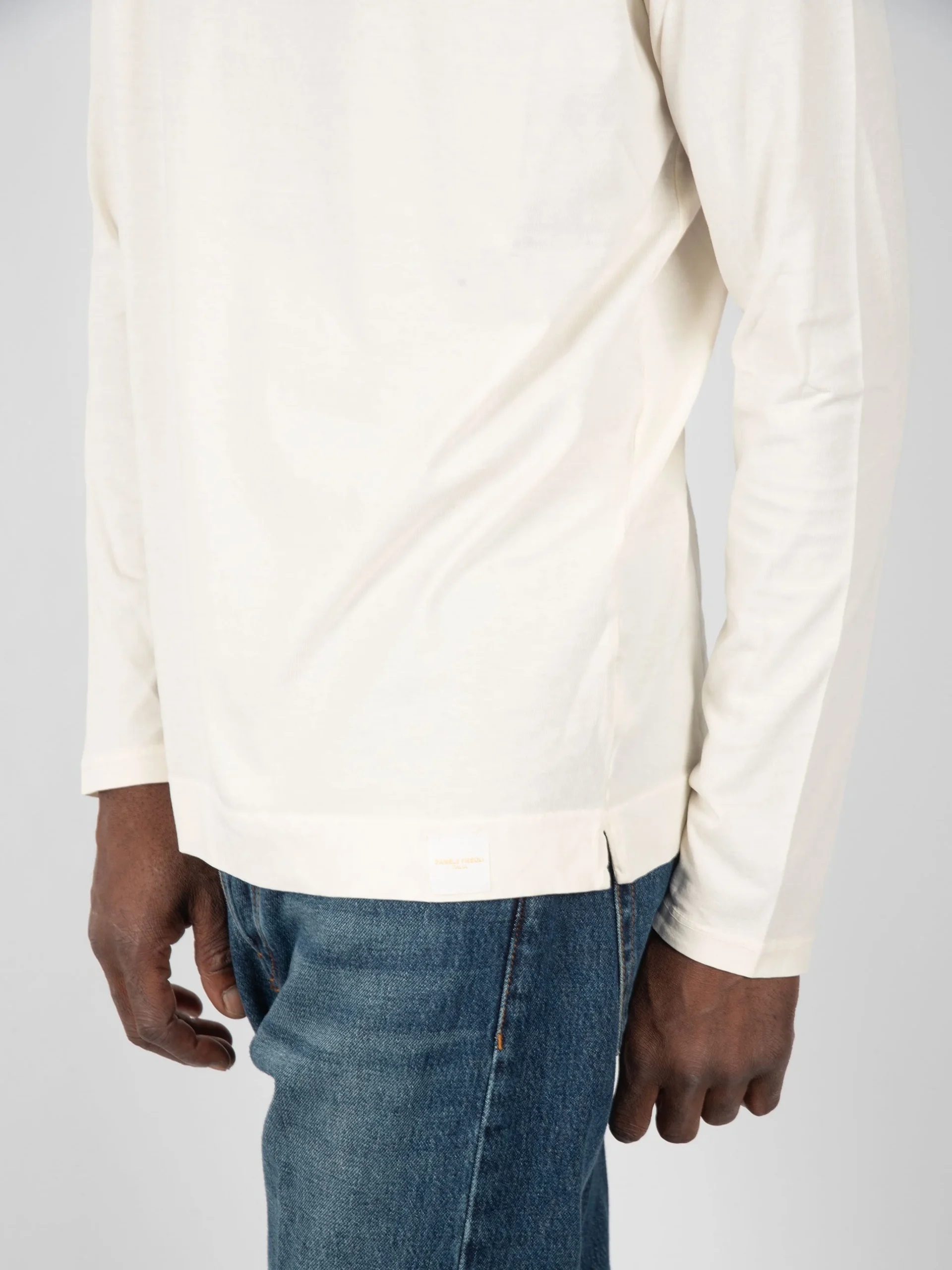 Mod: 2024/02 DF 0628 col: 0100 Maglia girocollo in cotone. Orlo macchina su fondo e polsi. Composizione tessuto: 100% cotone. 100% Made in Italy. Il modello è alto 187cm e pesa 70kg: indossa una taglia L