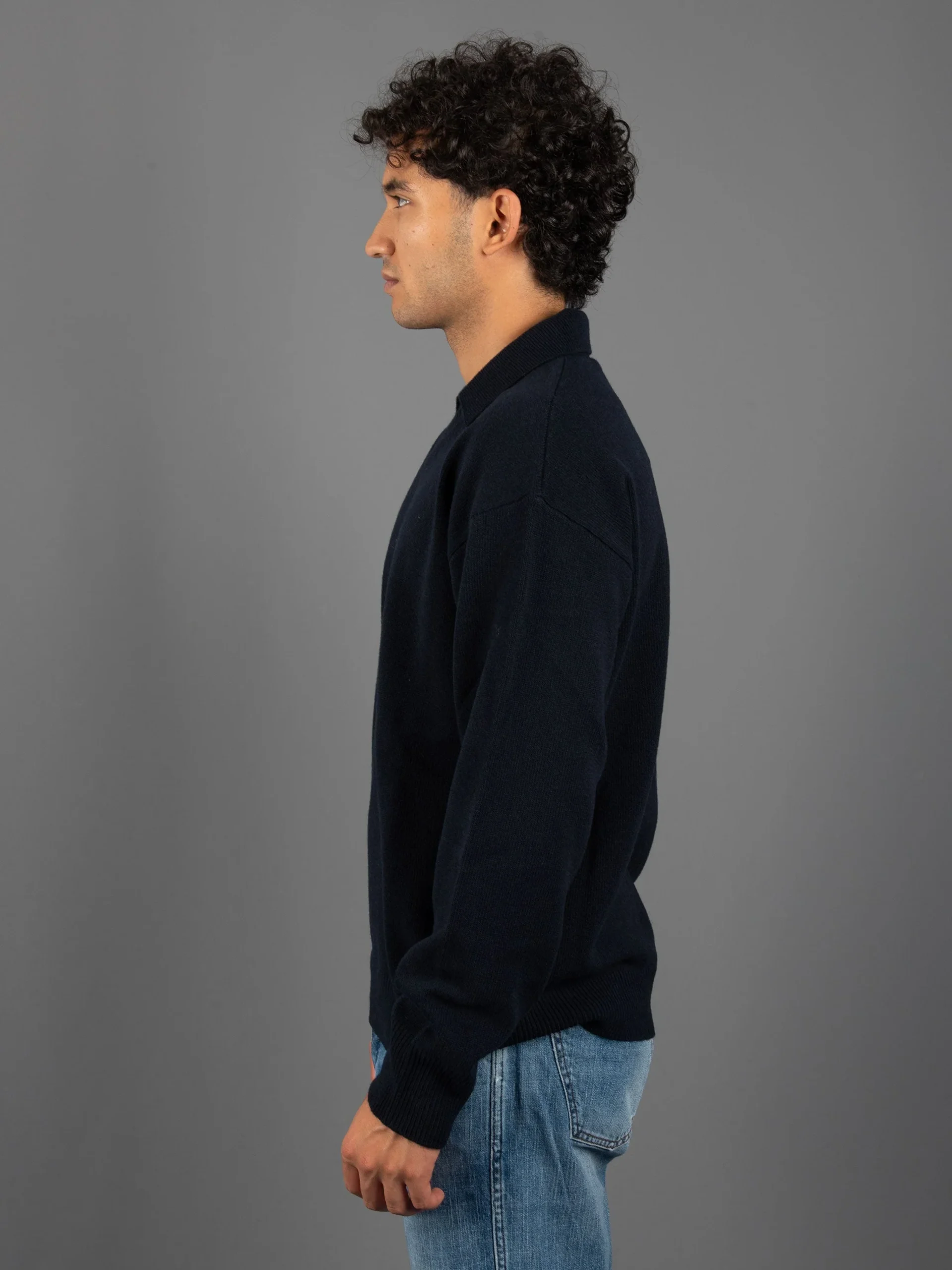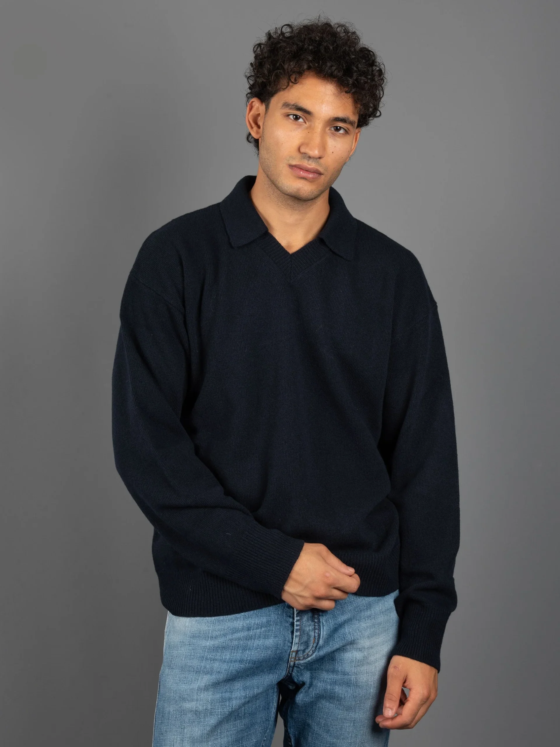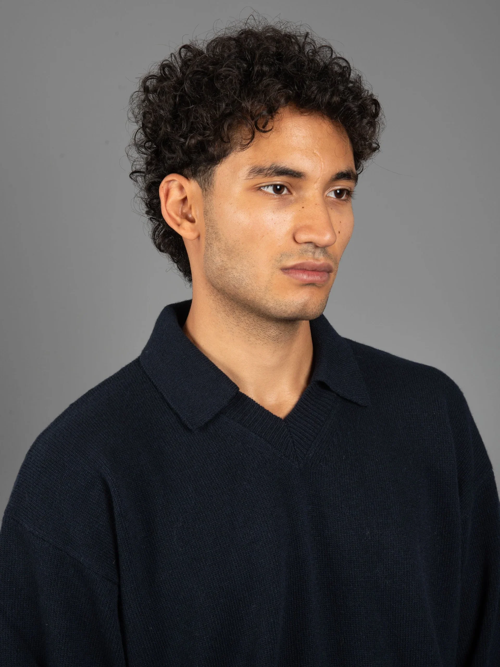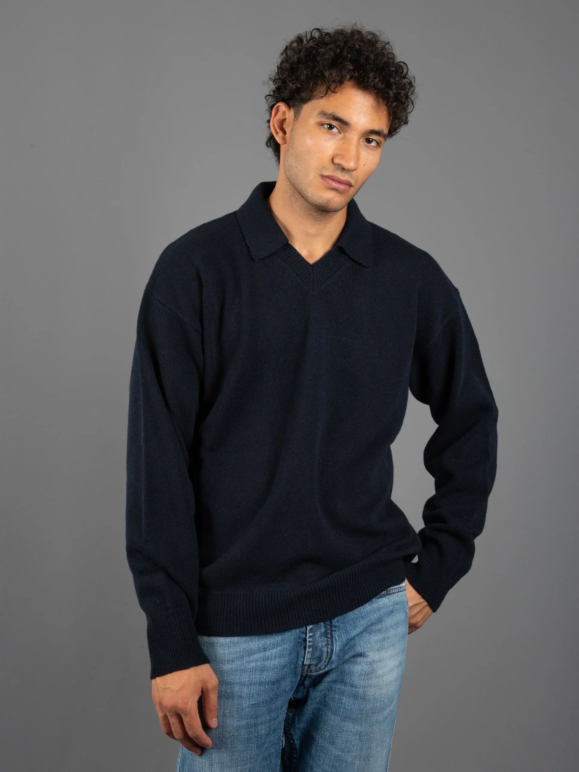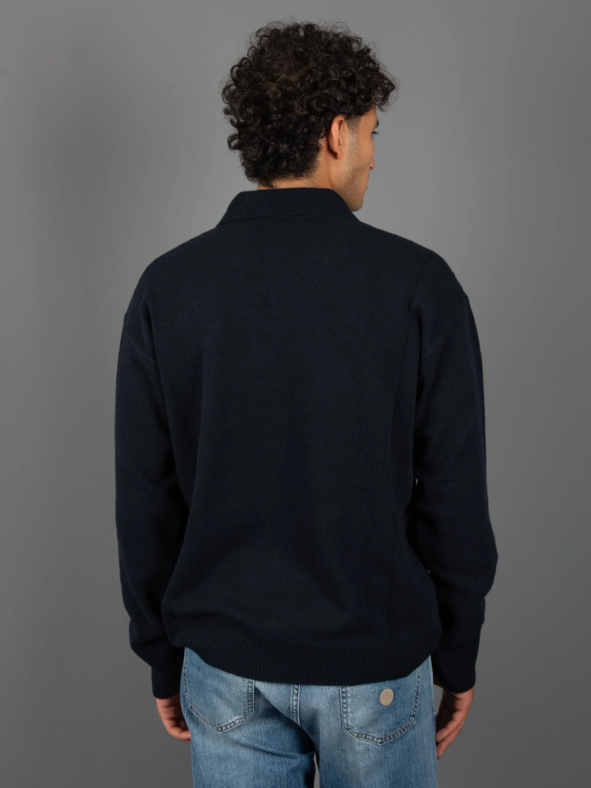 Mod: 253M37104 10 NAVY Maglia con collo ibrido a V e Polo. Rifinito con fondi e polsi a costine. Vestibilità comoda e spalla scesa. 100% made in Italy. Composizione 90% lana merino e 10% cachemire. Il modello è alto 185 cm e pesa 70 kg: indossa una taglia 50.