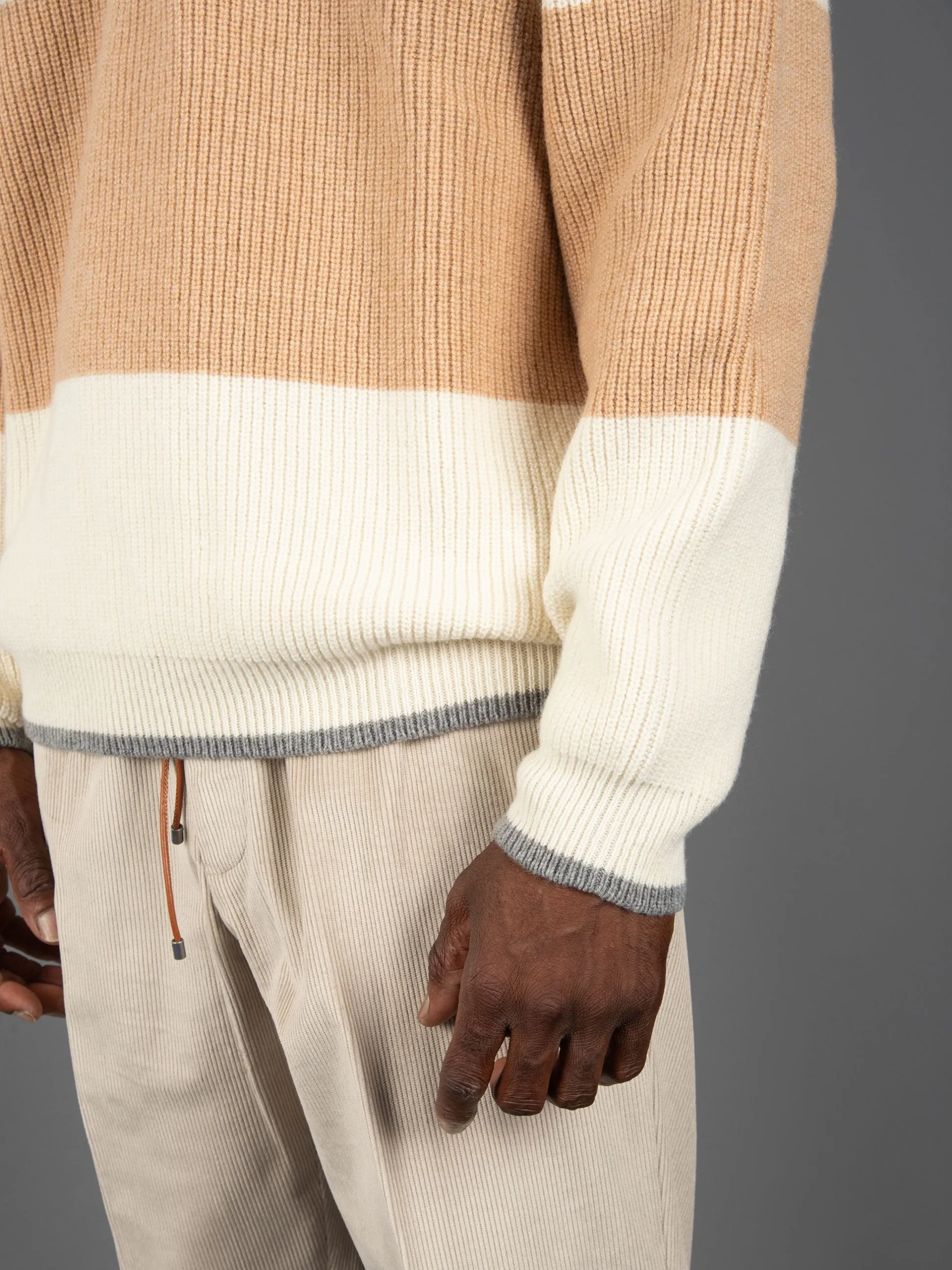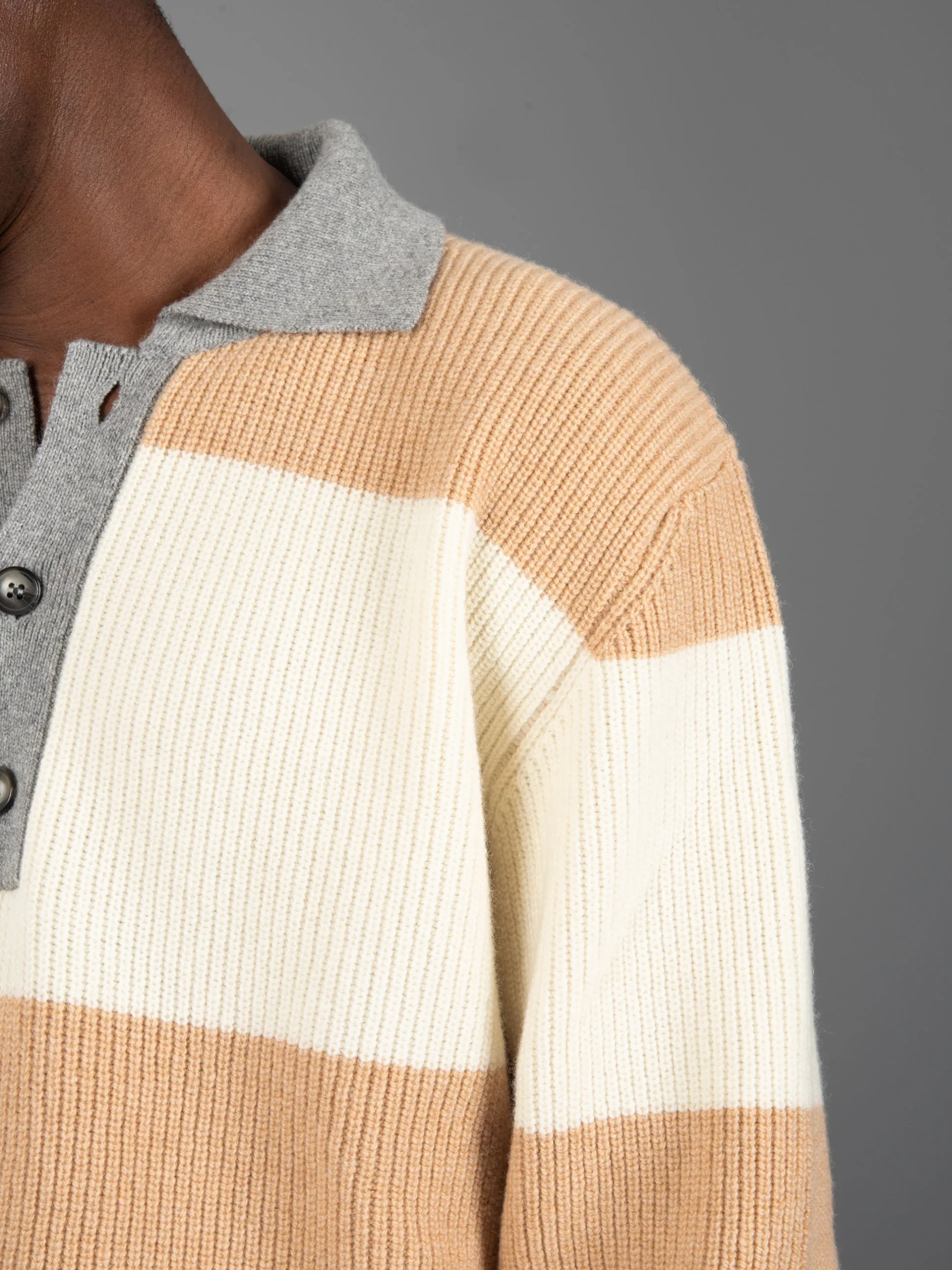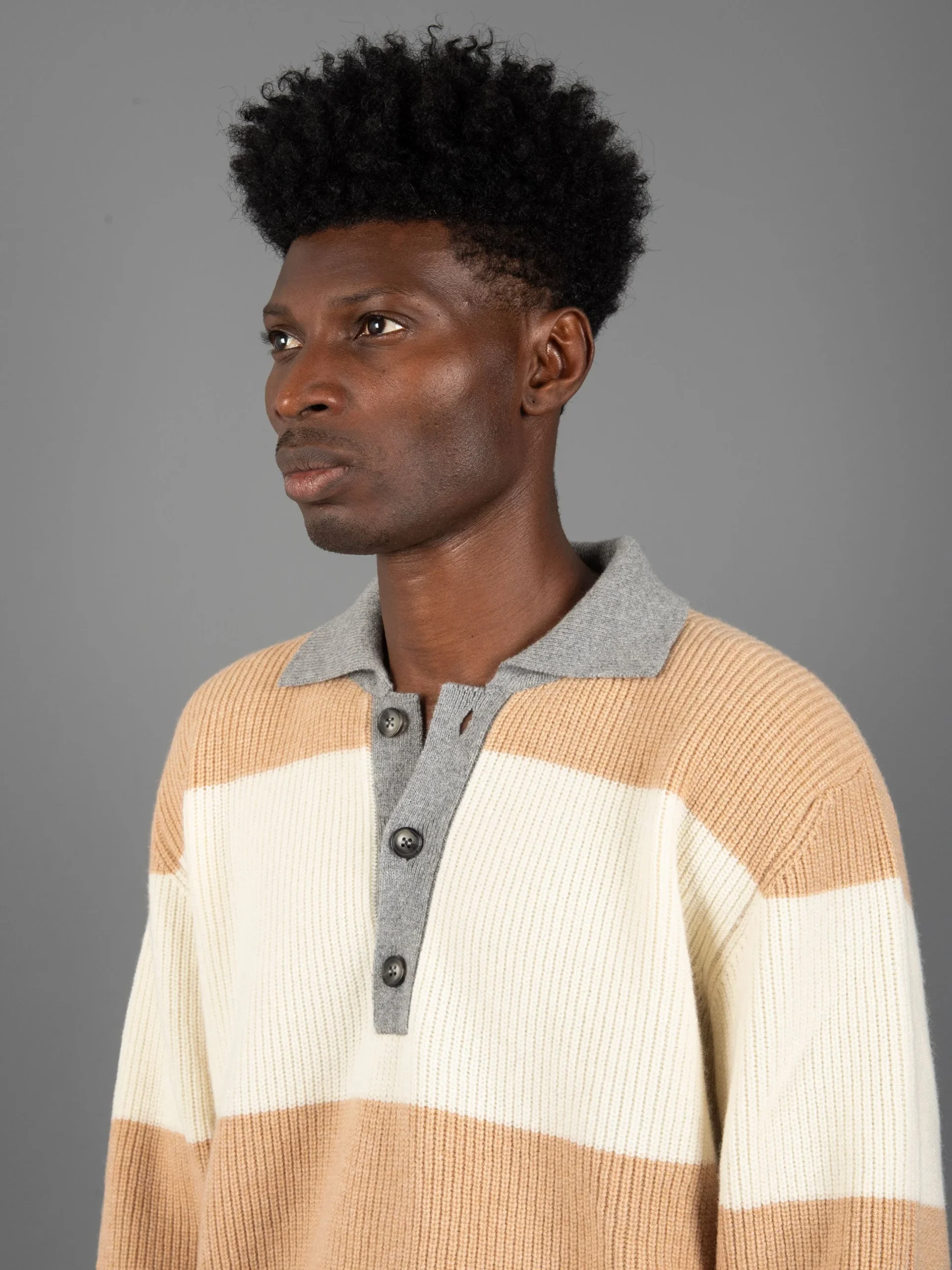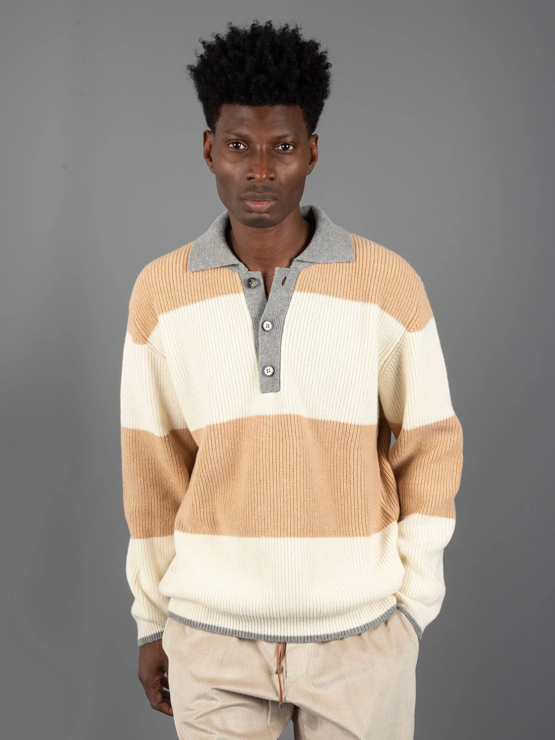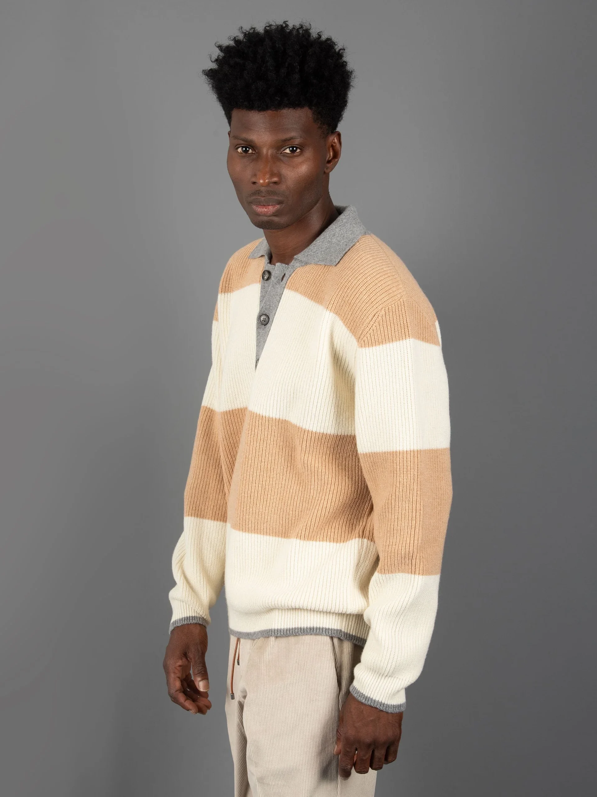 Mod: KNITWEAR B9F0001 FV 425 ALLUMINIO Maglia con collo polo in lana. Allacciatura collo a tre bottoni. Polsi, fondo e collo con rifiniture grigie. Vestibilità leggermente over e spalla calata. 100% made in Italy. Composizione: 90% Lana 10% Cachemire. Il modello è alto 187 cm e pesa 70 kg: indossa una taglia L.