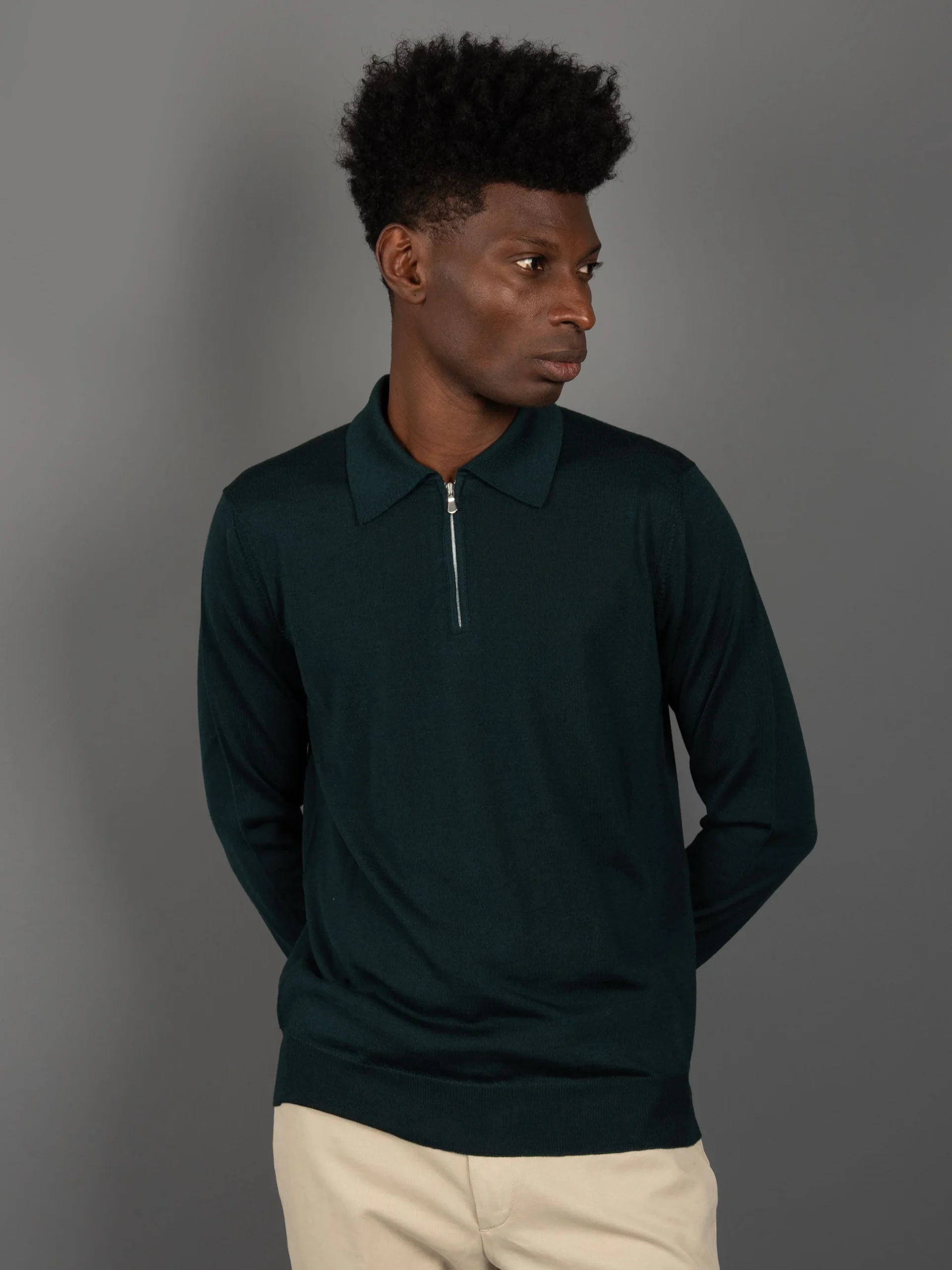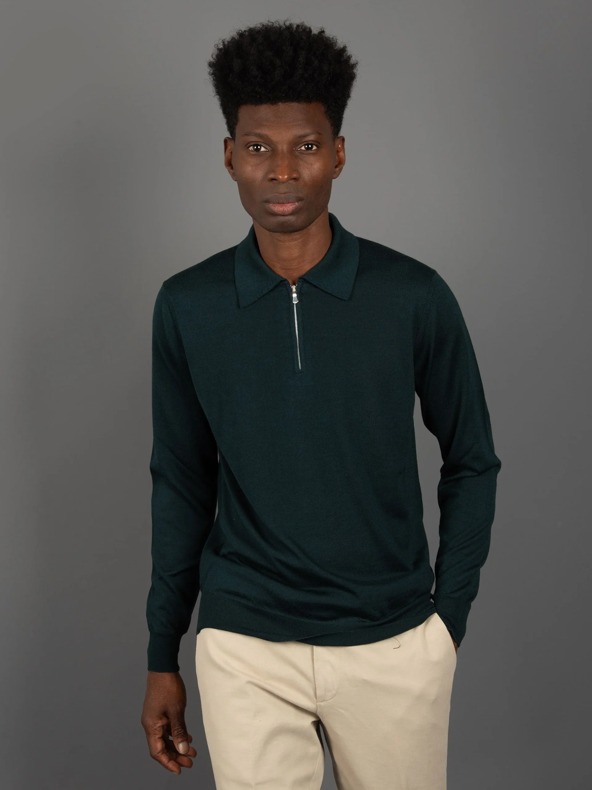 Mod: M5625-5304 450 Polo in lana e seta. Collo con zip e cannolè su fondo e maniche. Composizione: 70% lana merinos extra fine e 30% seta. Vestibiltà regolare. Ideale da portare anche sotto un’abito. 100% Made in Italy. Il modello è alto 187cm e pesa 70kg: indossa una taglia 50.
