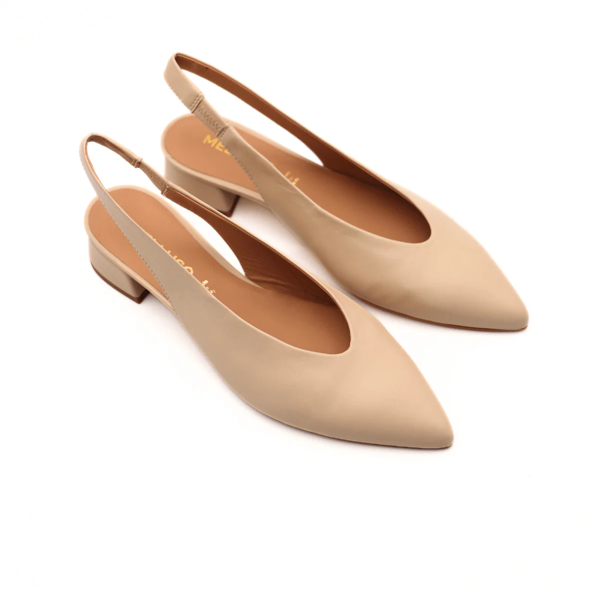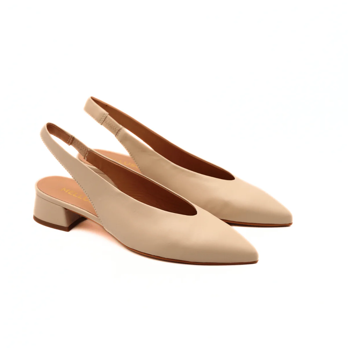 Slingback di MELLUSO. Queste eleganti scarpe realizzate in pelle color nude sono dotate di un comodo interno e soletta in morbida pelle. Un design sofisticato con una suola in effetto cuoio.