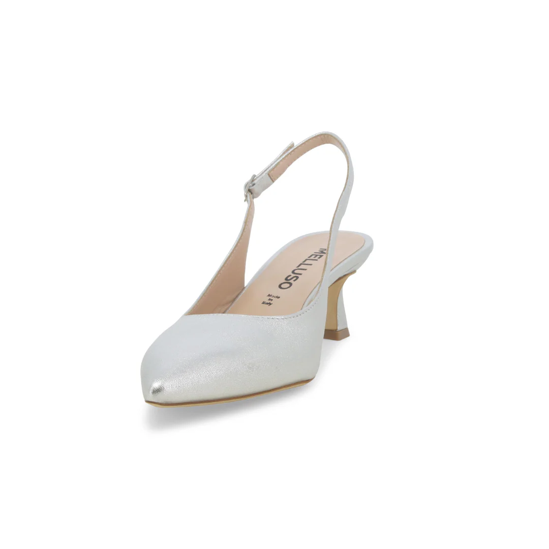 Slingback di MELLUSO. Scarpa elegante realizzata in pelle laminata argento, chiusura con cinturino regolabile. Sottopiede anatomico morbido e suola in cuoio.