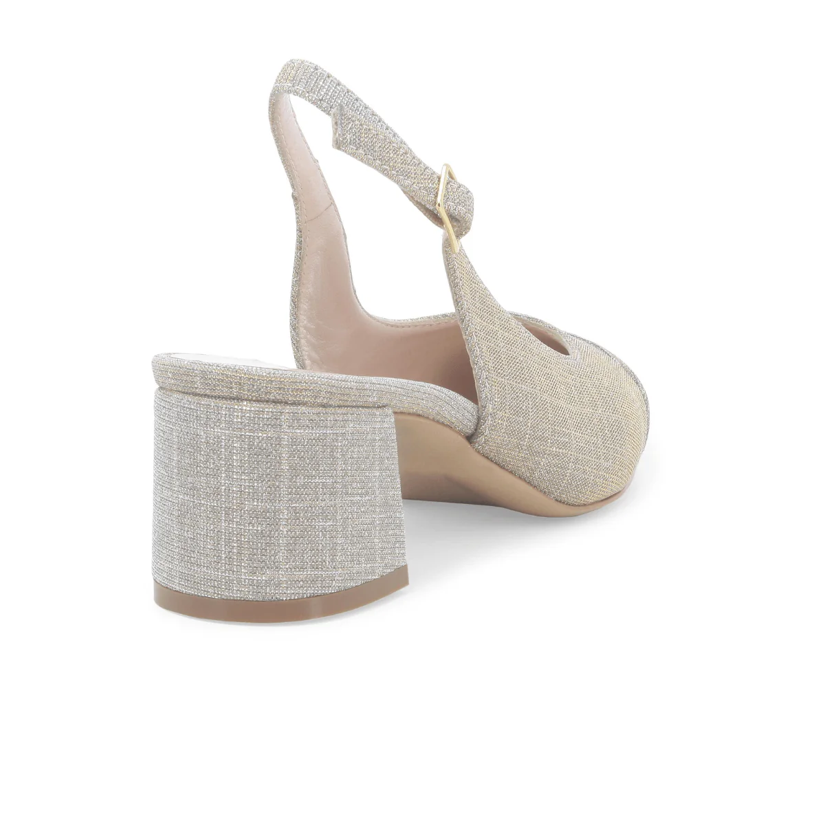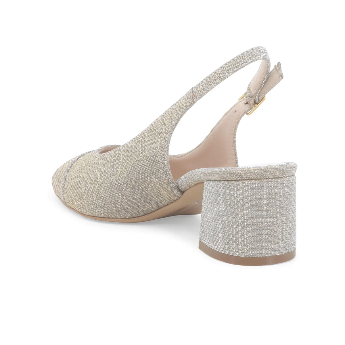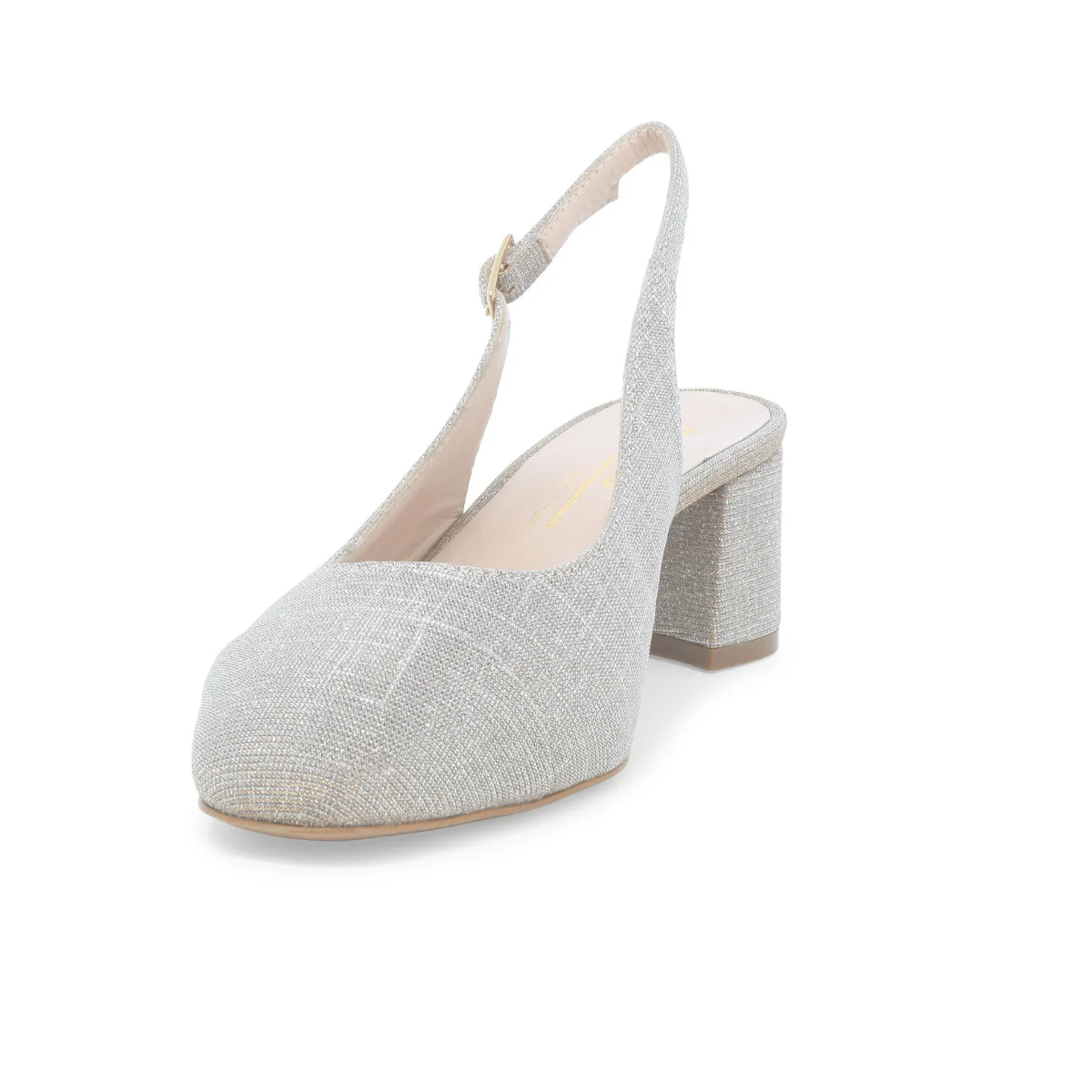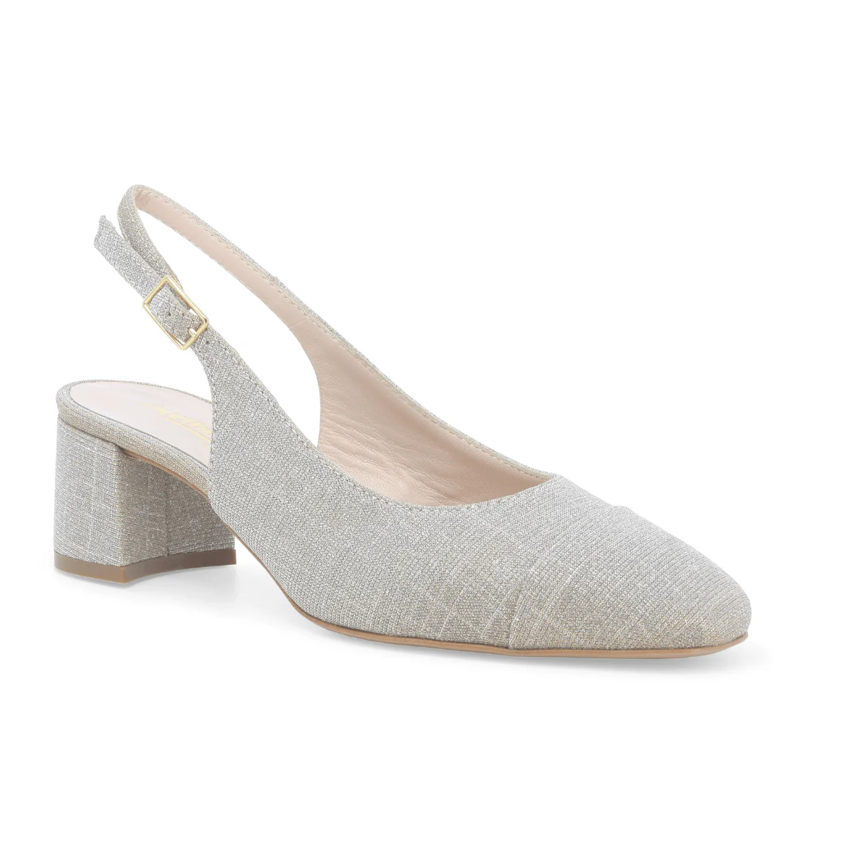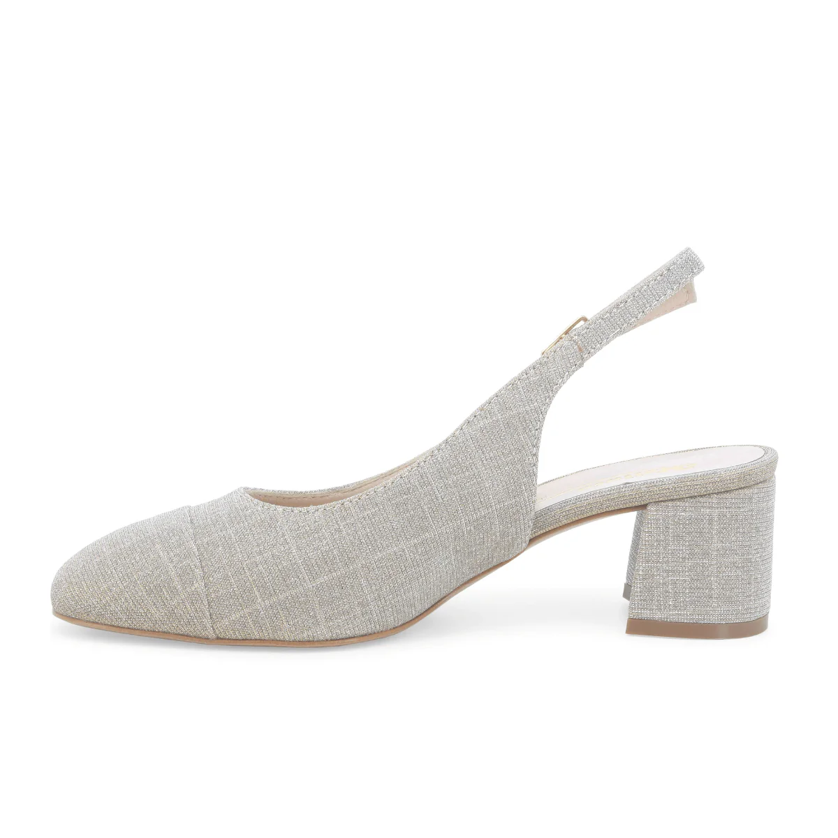 Slingback di MELLUSO. Scarpa elegante con realizzata in tessuto galassia platino, chiusura con cinturino regolabile. Sottopiede anatomico morbido e suola in effetto cuoio.