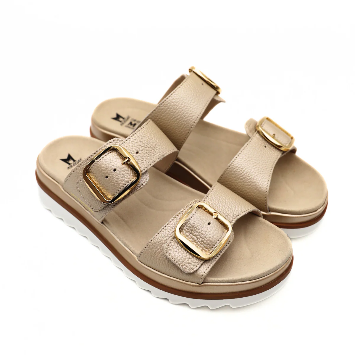 Ciabatta beige e oro di MEPHISTO, modello DERIA. Questo modello platform presenta dei cinturini regolabili con fibbie oro ed è realizzato in pelle liscia e granulata.