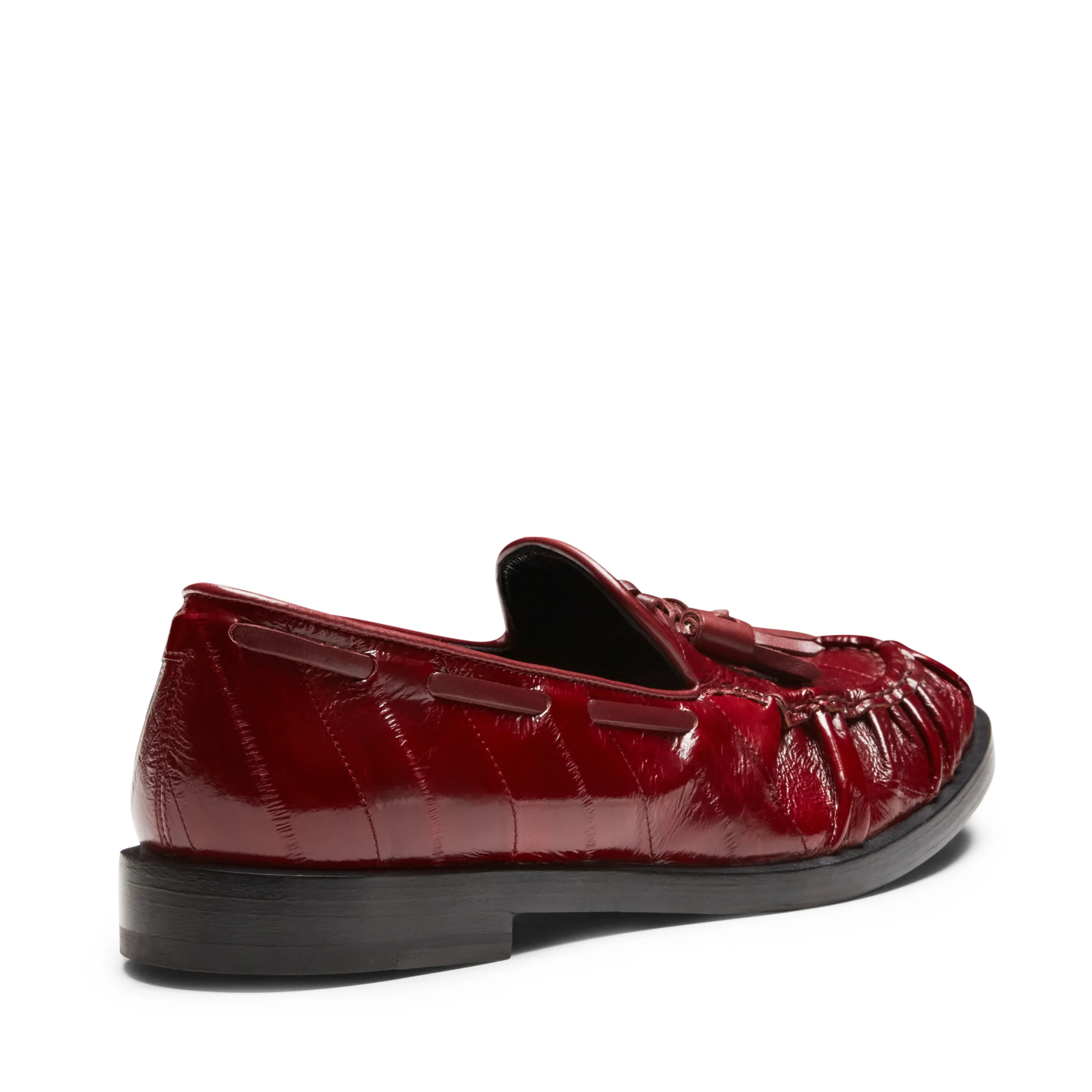 Per la stagione invernale l’iconico mocassino Brera si veste con pregiata pelle di anguilla in brillante color lampone. Questa interpretazione dona maggior carattere alla calzatura, grazie all’esclusiva lavorazione artigianale che prevede pieghe realizzare a mano a partire dal giro mocassino. Suola in cuoio con mezzo tacco in gomma.