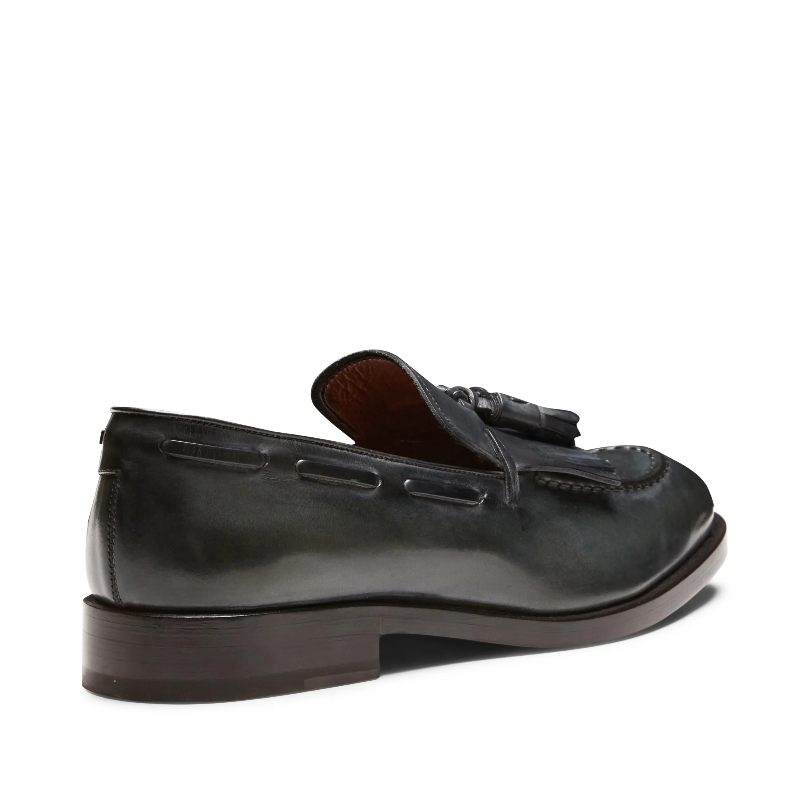 L’iconico mocassino Brera si presenta in versione ricercata, le nappine e la frangia in pelle in tono combinano estetica contemporanea e artigianalità. La pelle color grigio grafite si caratterizza per un’esclusiva lavorazione artigianale che dona un effetto anticato e una maggiore lucentezza. Suola in cuoio con mezzo tacco in gomma.