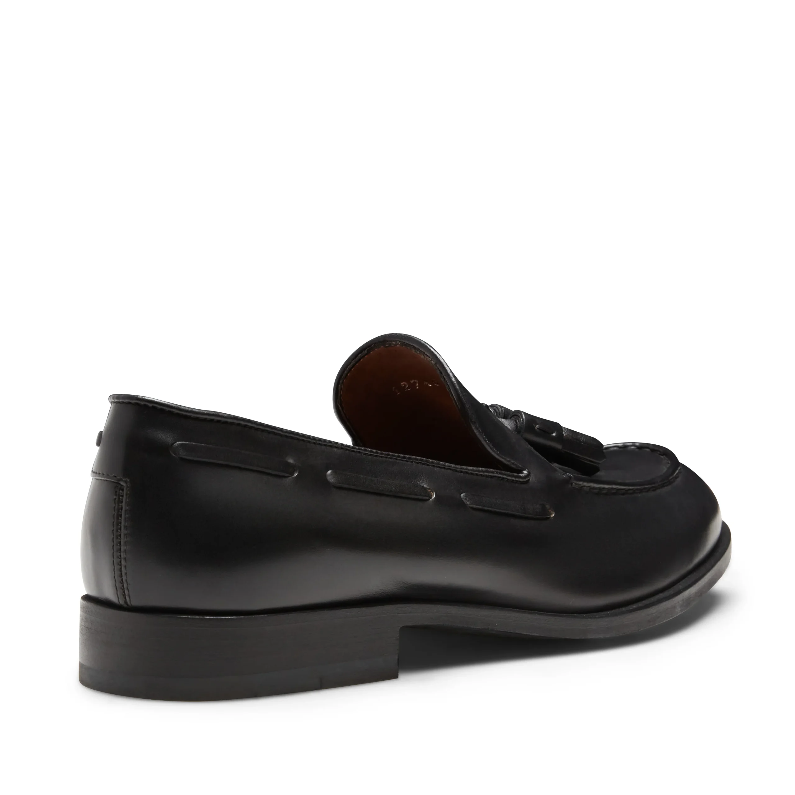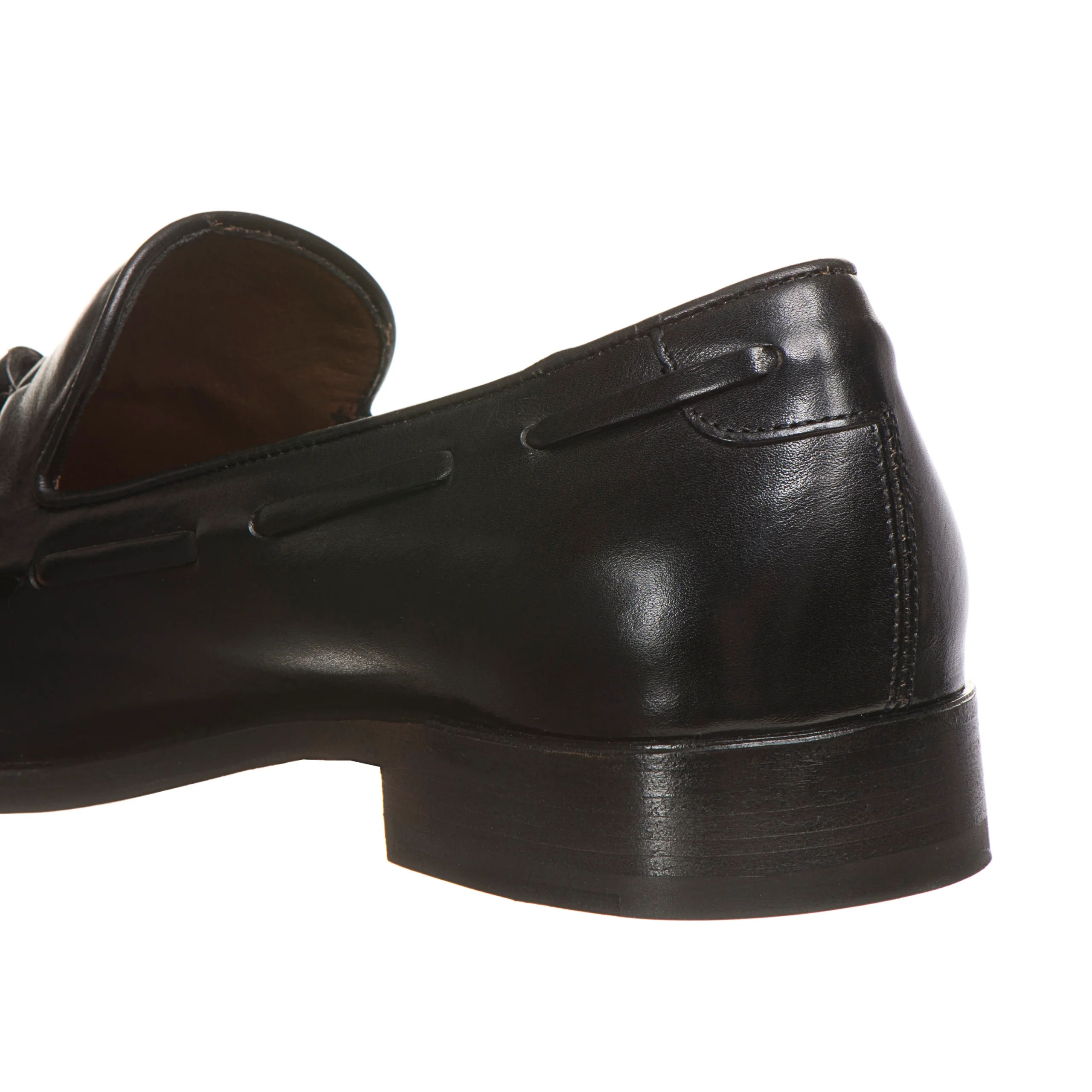 L’iconico mocassino Brera si veste d’estate nella versione realizzata in morbida pelle liscia di colore nero tamponata e rifinita a mano dai maestri artigiani. Le iconiche nappine sono in tinta al colore della tomaia.