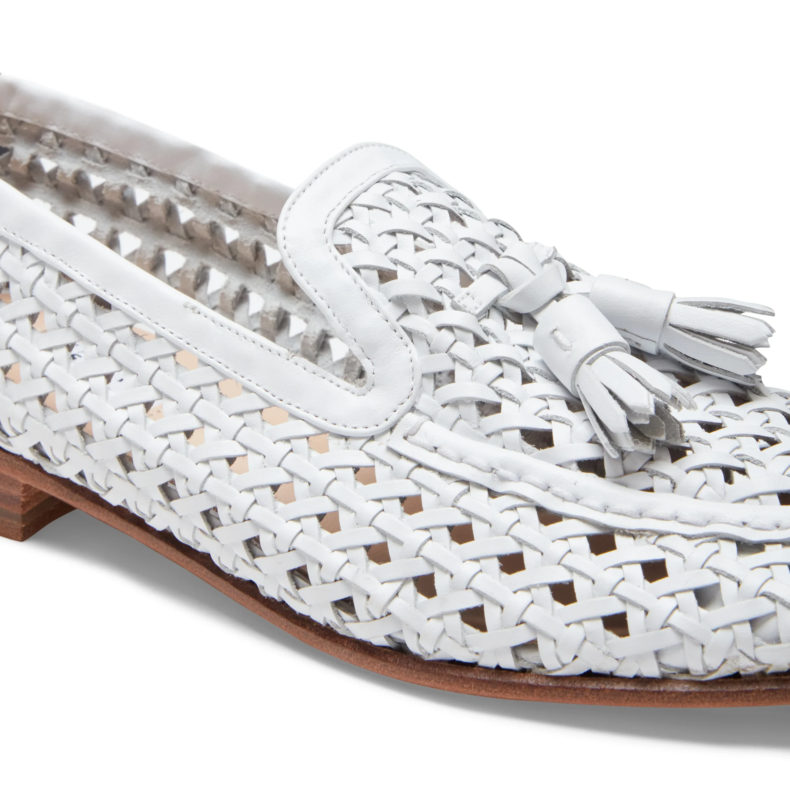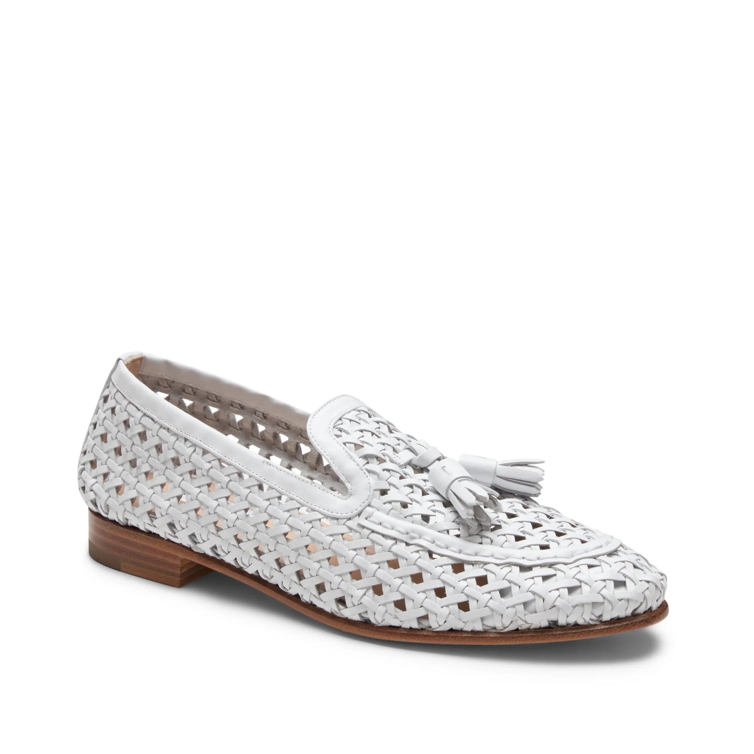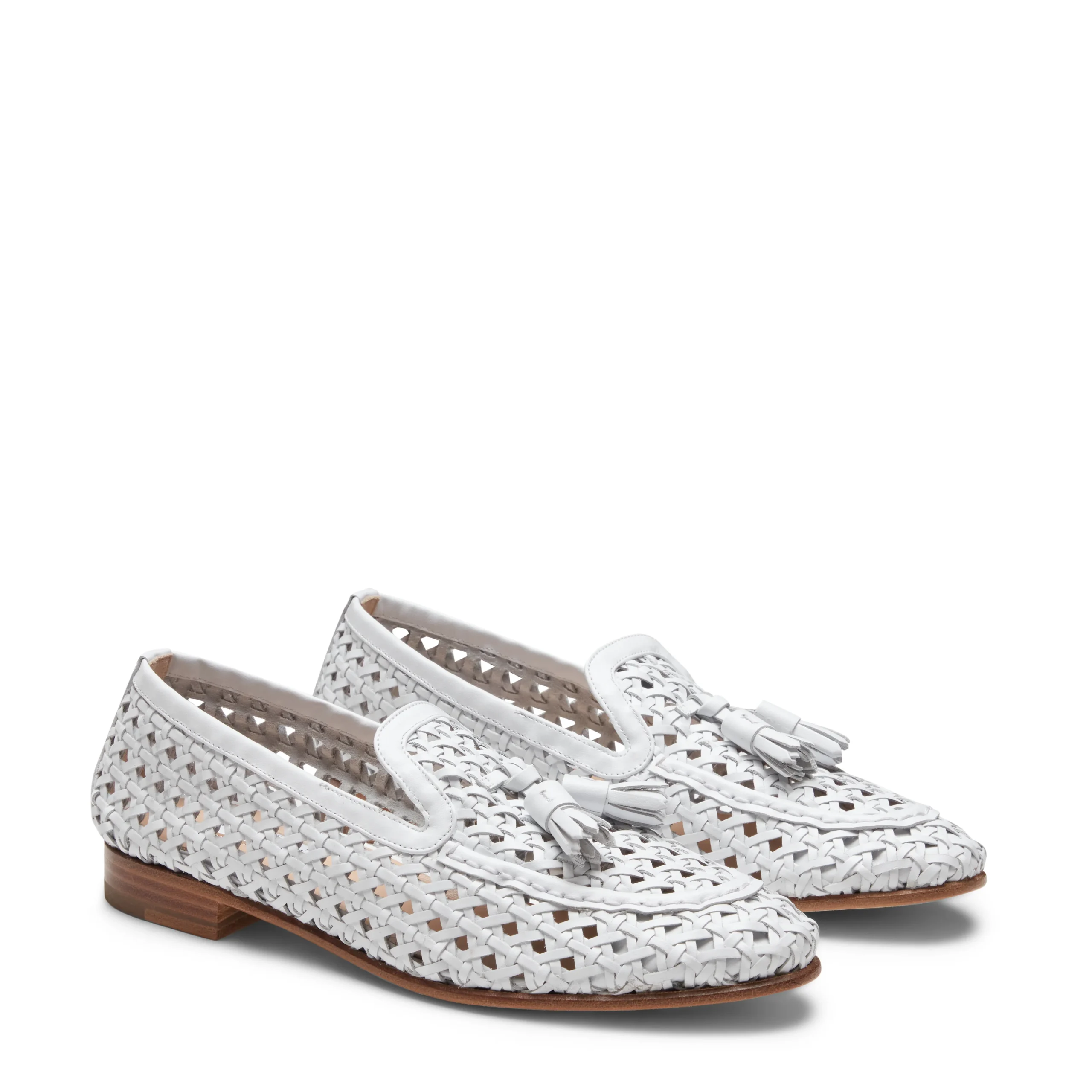 Raffinato mocassino Brera realizzato in morbida pelle intrecciata bianca con effetto semi lucido. La pregiata lavorazione artigianale dell’infilatura si caratterizza per i fori equamente distanziati nella tomaia. Calzatura leggera ed estiva. Suola in cuoio.Art. 66903