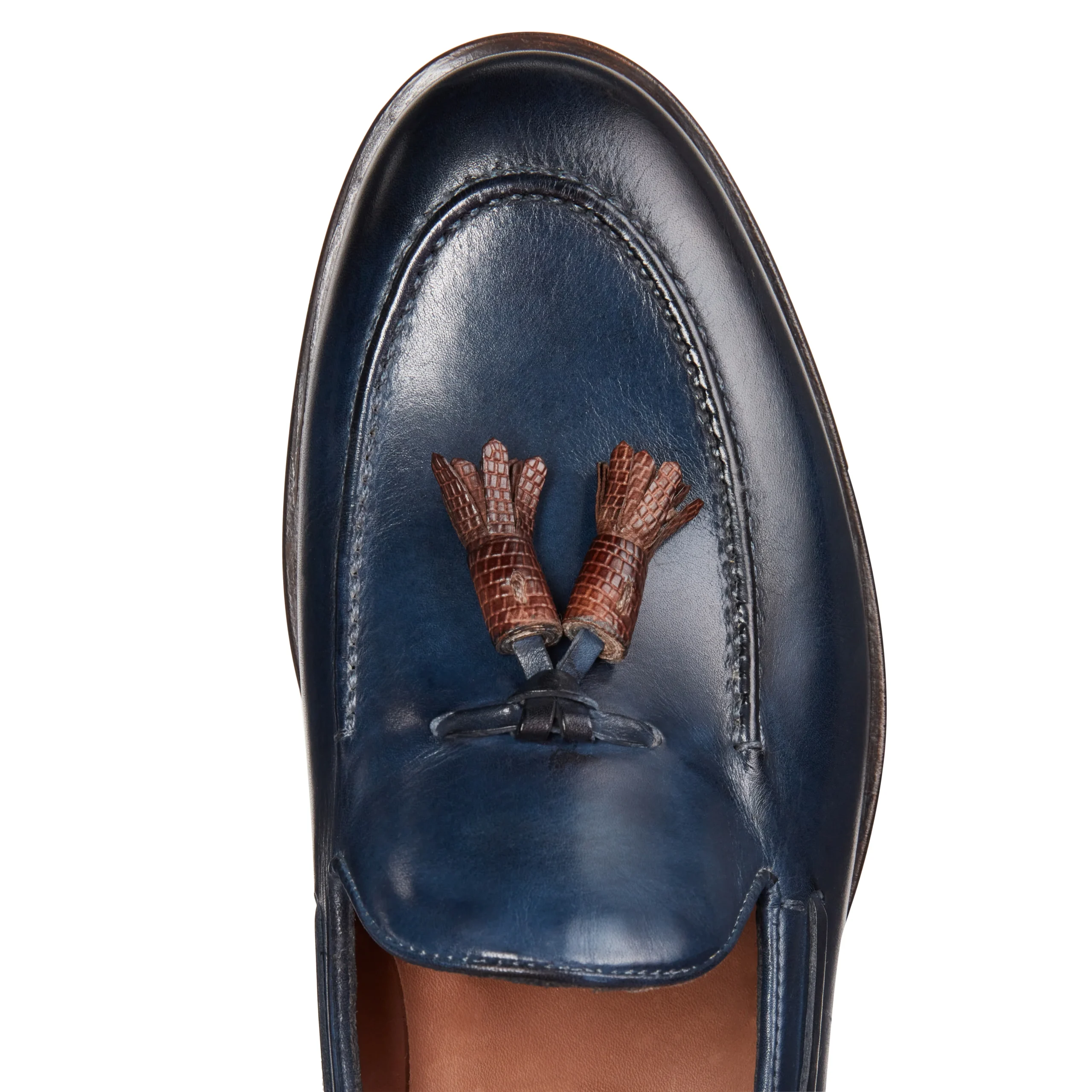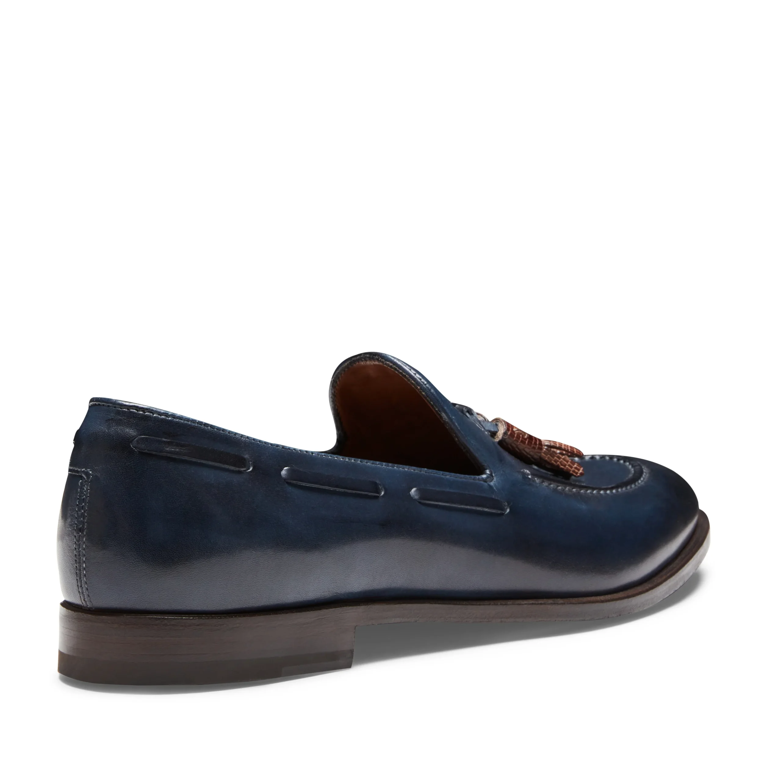 Iconico mocassino Brera realizzato in morbida pelle tinta di color blu marine tramite tamponatura a mano. Il sapiente lavoro artigianale crea un particolare effetto con sfumature di colore più profonde. Le nappine, anch’esse tamponate a mano in color cognac, sono realizzate in pelle stampata effetto lucertola. Suola in cuoio dipinta a mano bicolore.