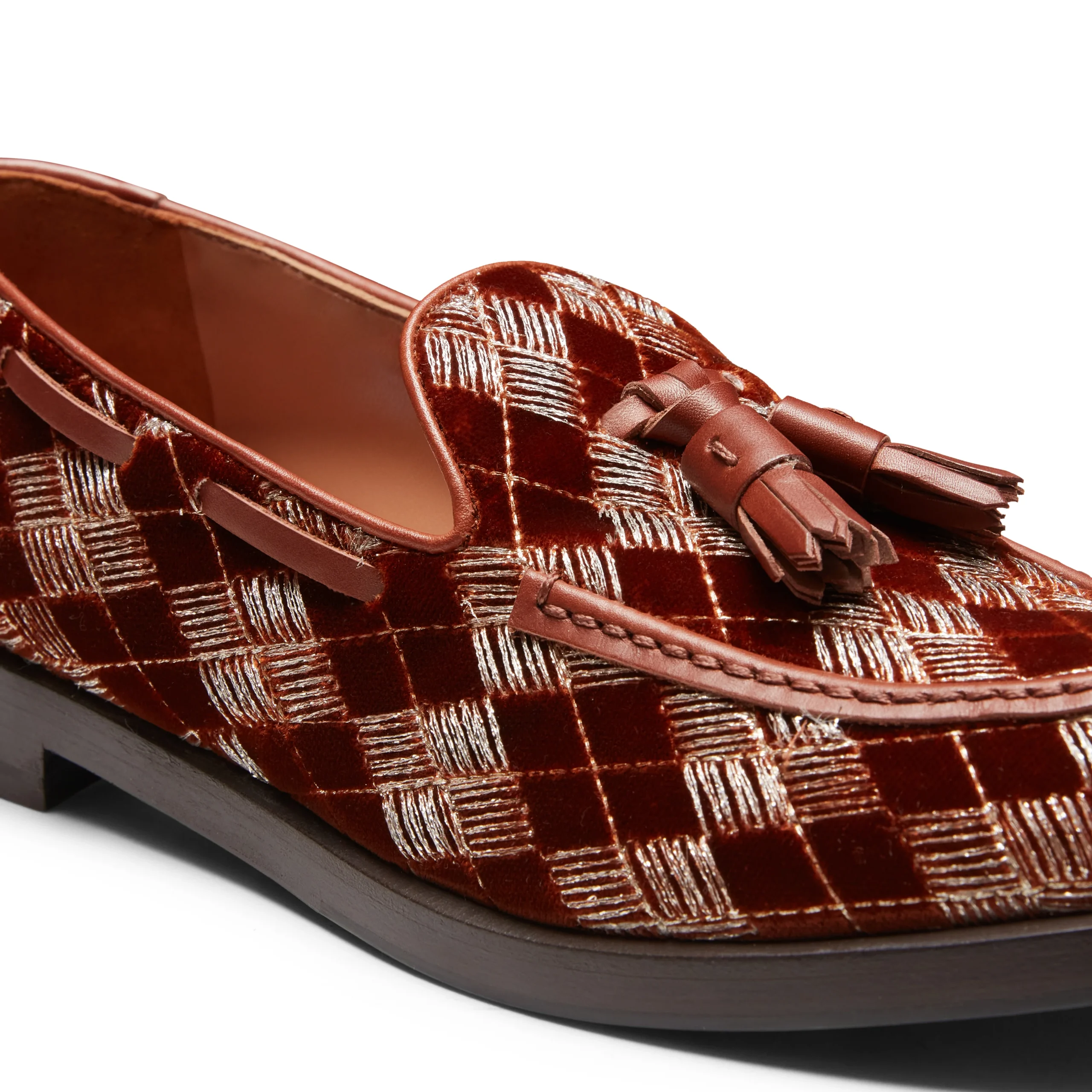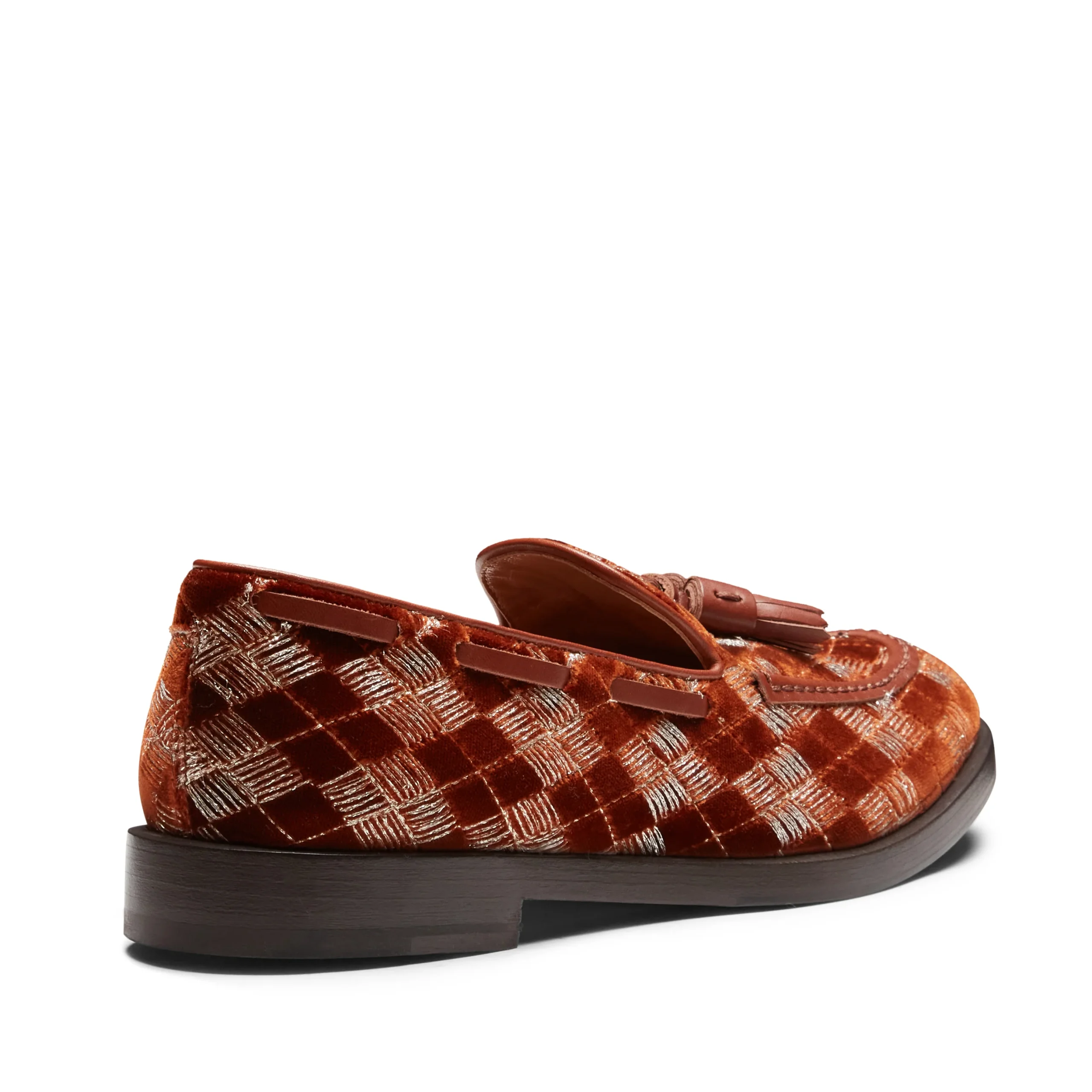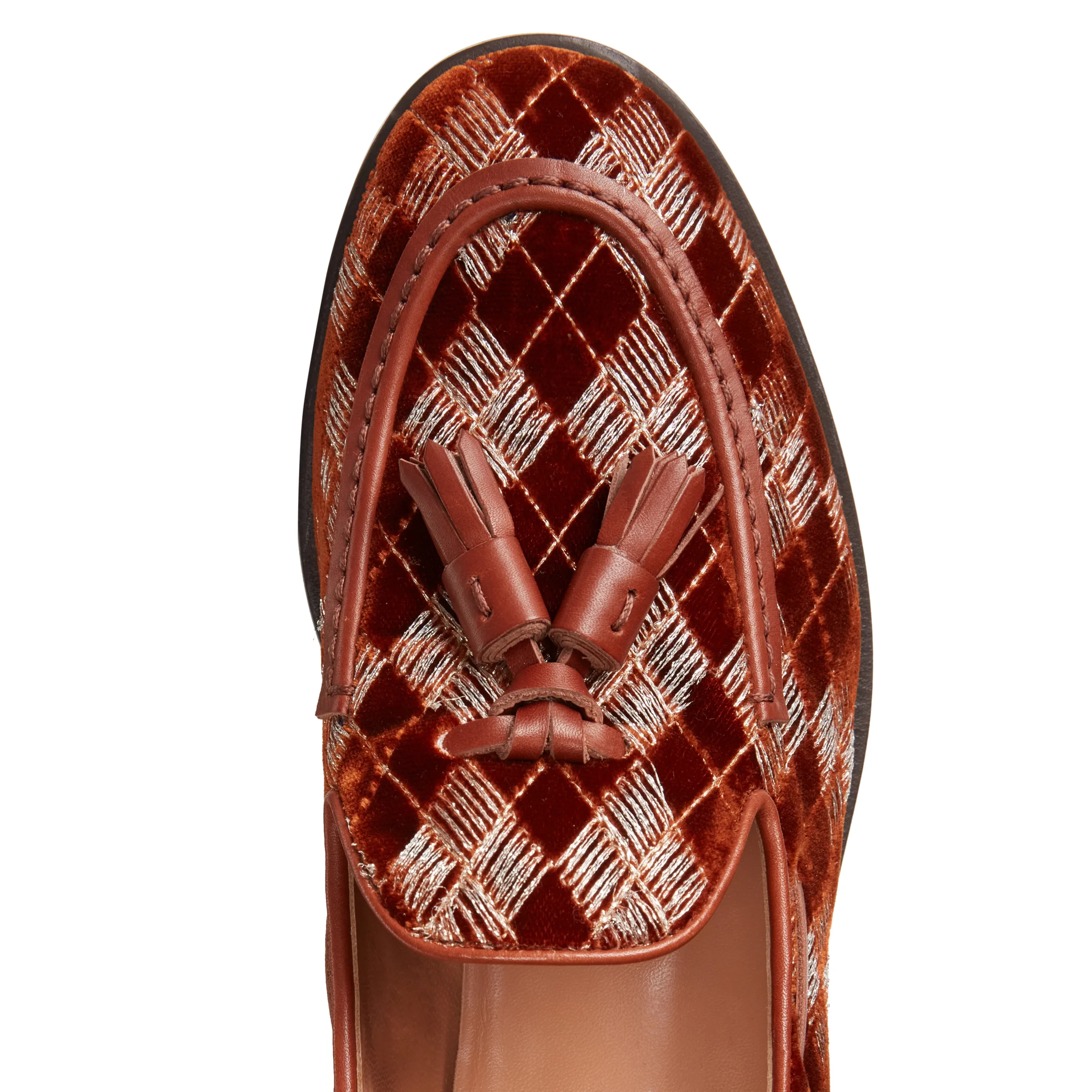 L’iconico mocassino Brera si veste di eleganza per la sera con un raffinato tessuto nero caratterizzato da ricami geometrici e inserti in fili di lurex argentato, che aggiungono un delicato tocco di luce. I profili e le nappine, in pelle in tono, completano il design, donando alla calzatura un aspetto sofisticato e contemporaneo. Suola in cuoio nera in tono alla fodera.