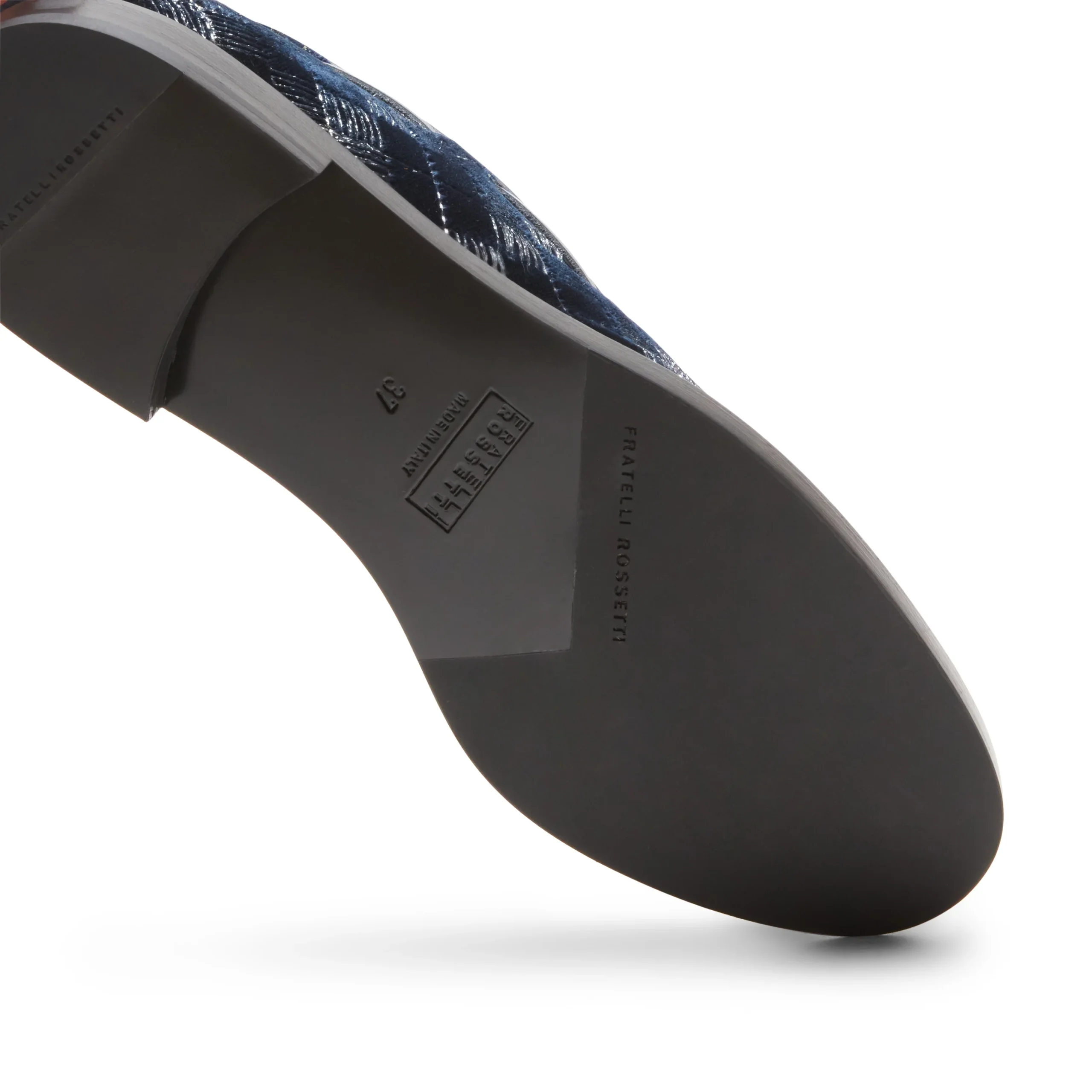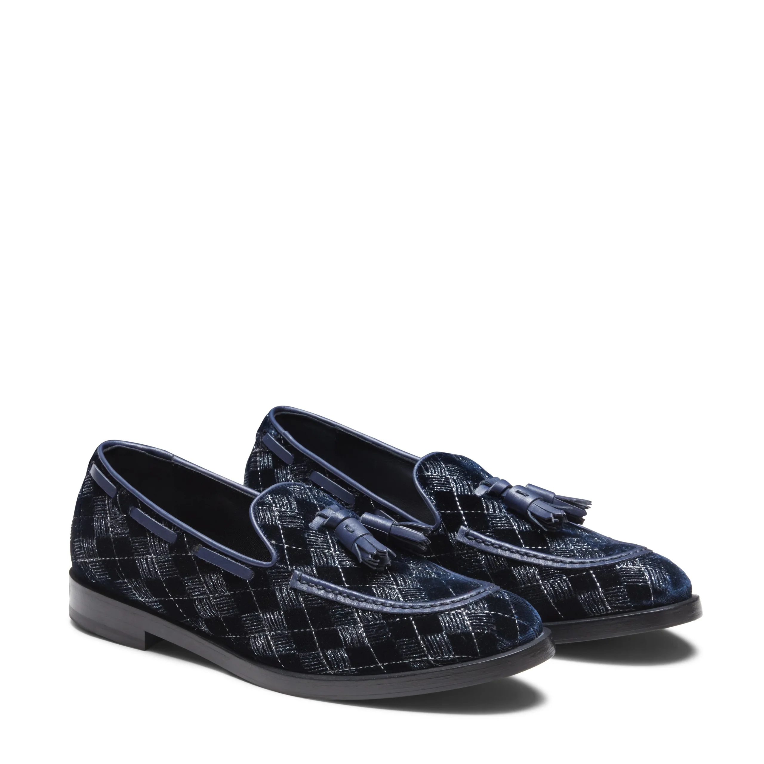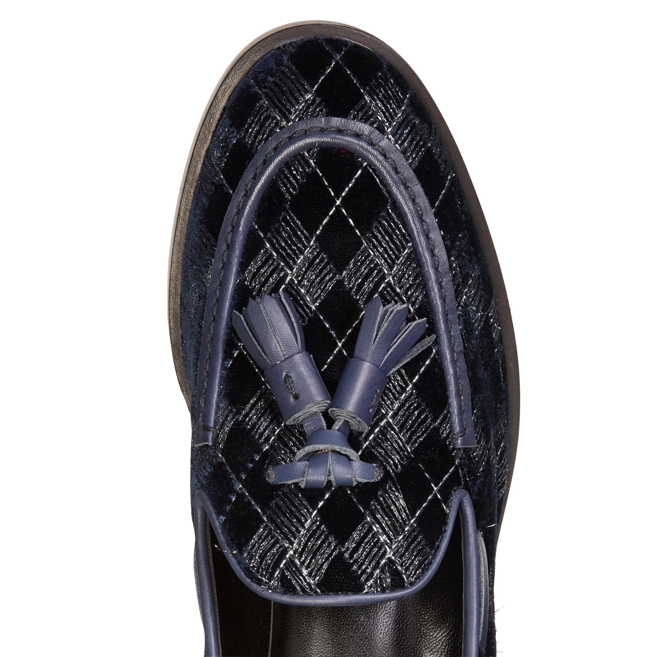 L’iconico mocassino Brera si veste di eleganza per la sera con un raffinato tessuto nero caratterizzato da ricami geometrici e inserti in fili di lurex argentato, che aggiungono un delicato tocco di luce. I profili e le nappine, in pelle in tono, completano il design, donando alla calzatura un aspetto sofisticato e contemporaneo. Suola in cuoio nera in tono alla fodera.
