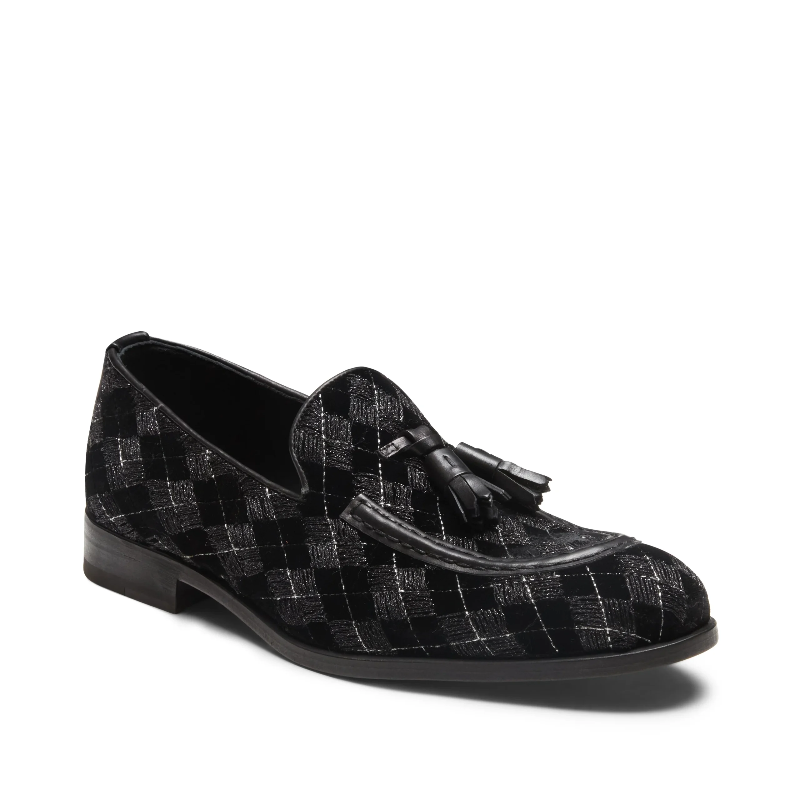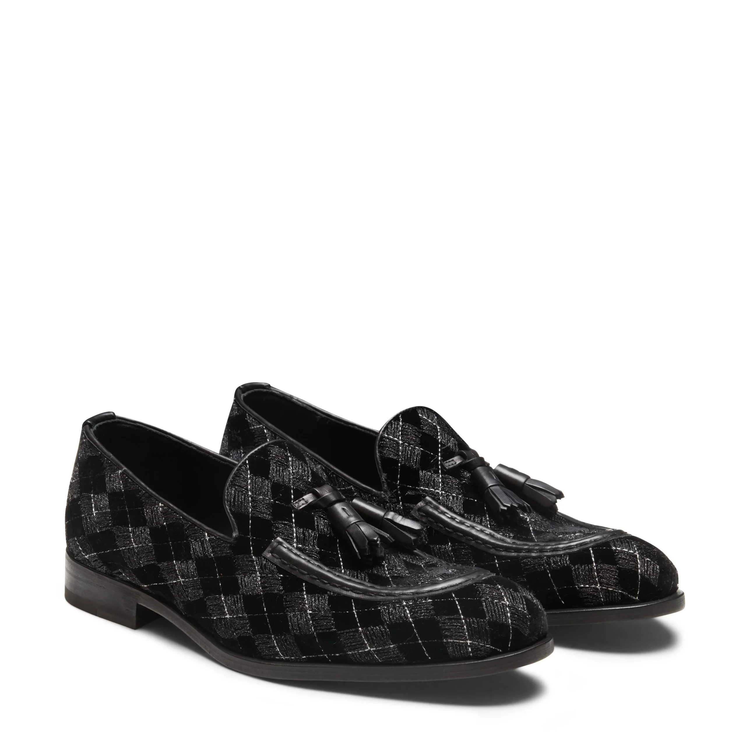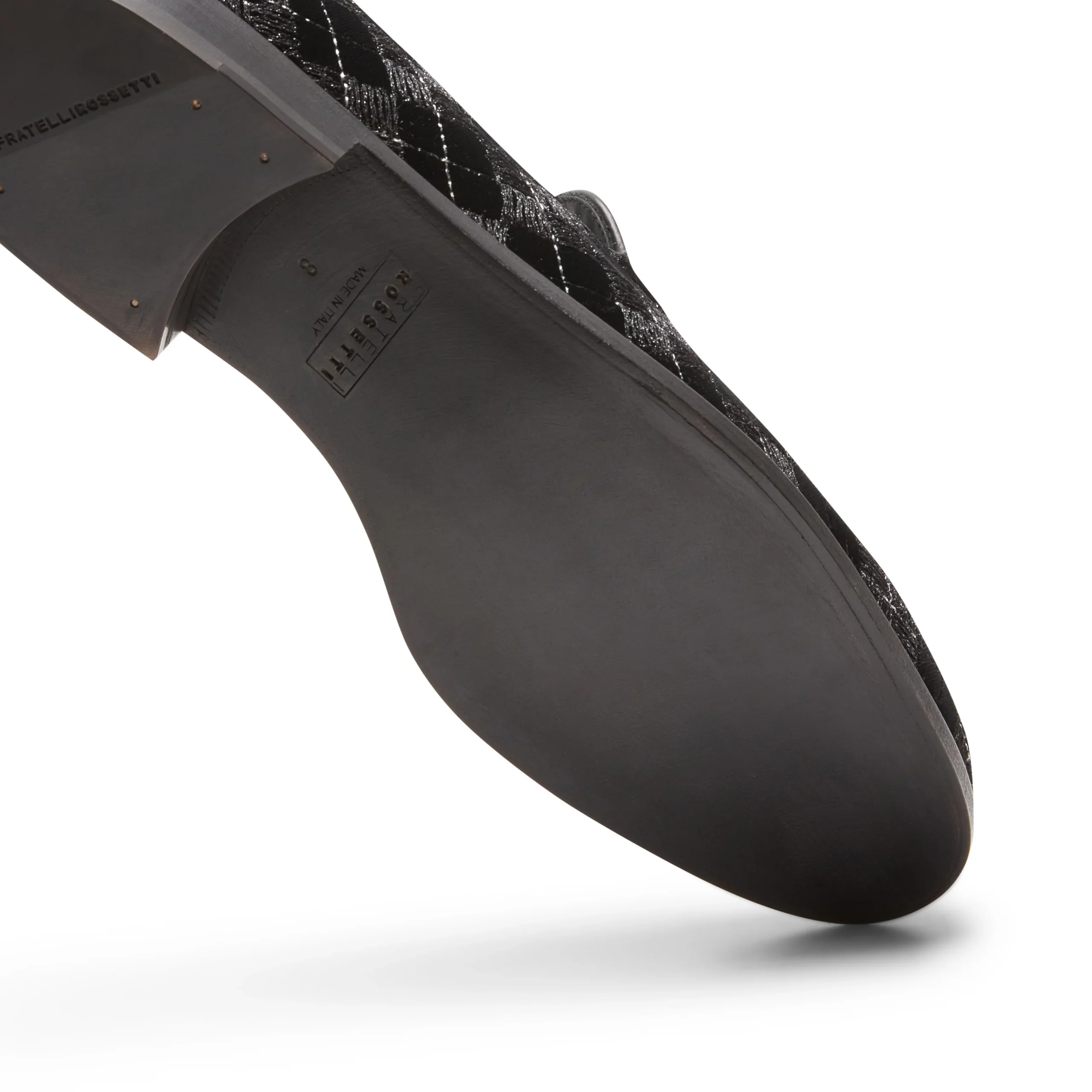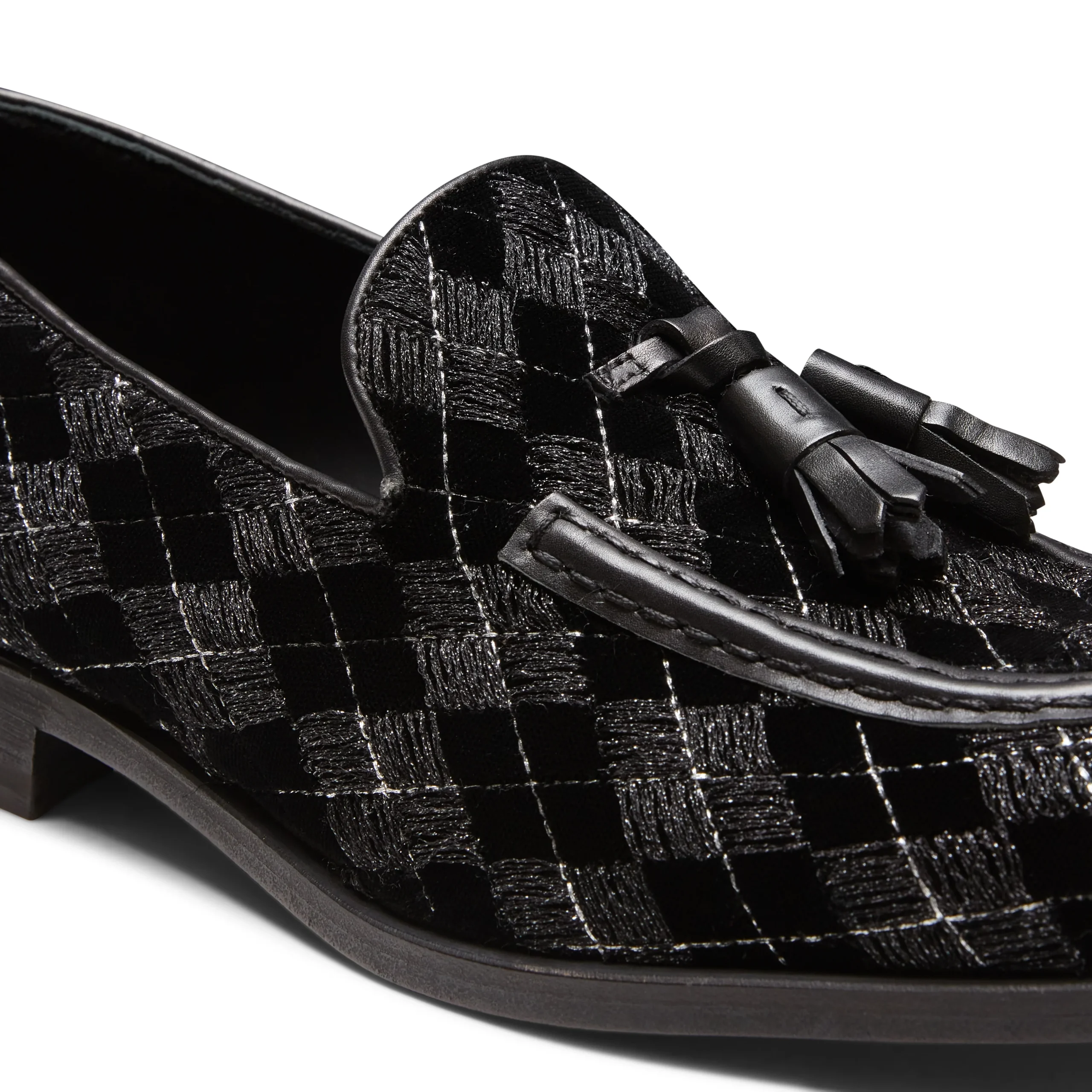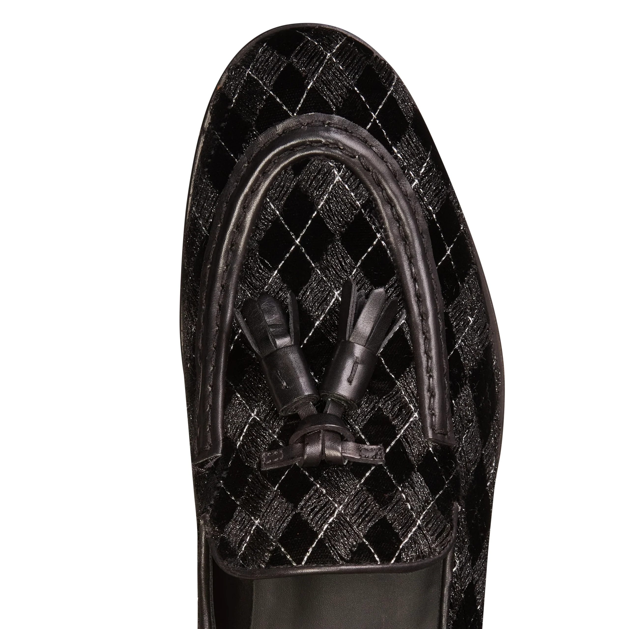 L’iconico mocassino Brera si veste di eleganza per la sera con un raffinato tessuto nero caratterizzato da ricami geometrici e inserti in fili di lurex argentato, che aggiungono un delicato tocco di luce. I profili e le nappine, in pelle in tono, completano il design, donando alla calzatura un aspetto sofisticato e contemporaneo. Suola in cuoio nera in tono alla fodera.
