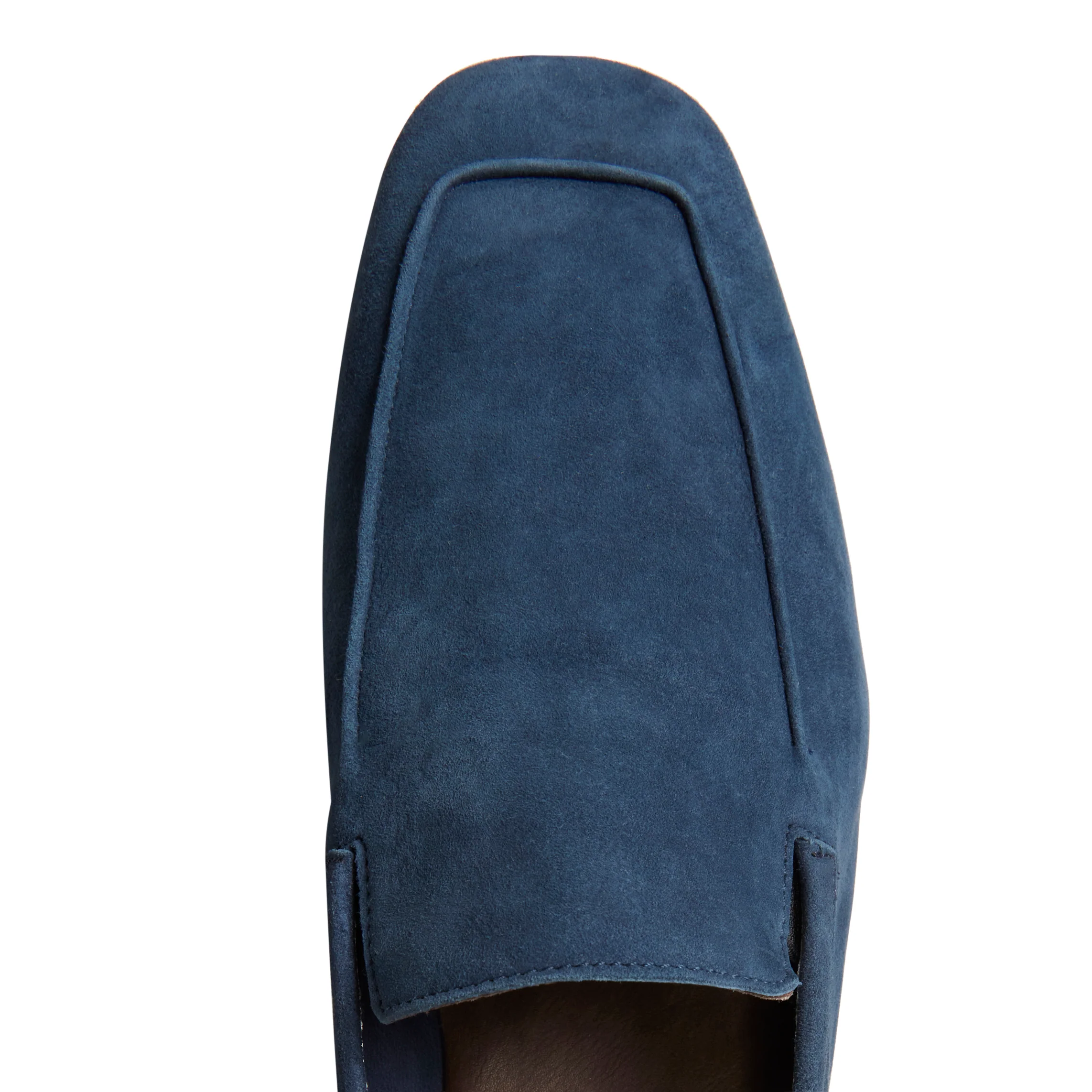 Mocassino liscio dalla forma quadrata, destrutturato e sfoderato della linea Estate. Calzatura realizzata in morbida pelle scamosciata color blu navy, leggera e flessibile. Profilo logato all’interno.