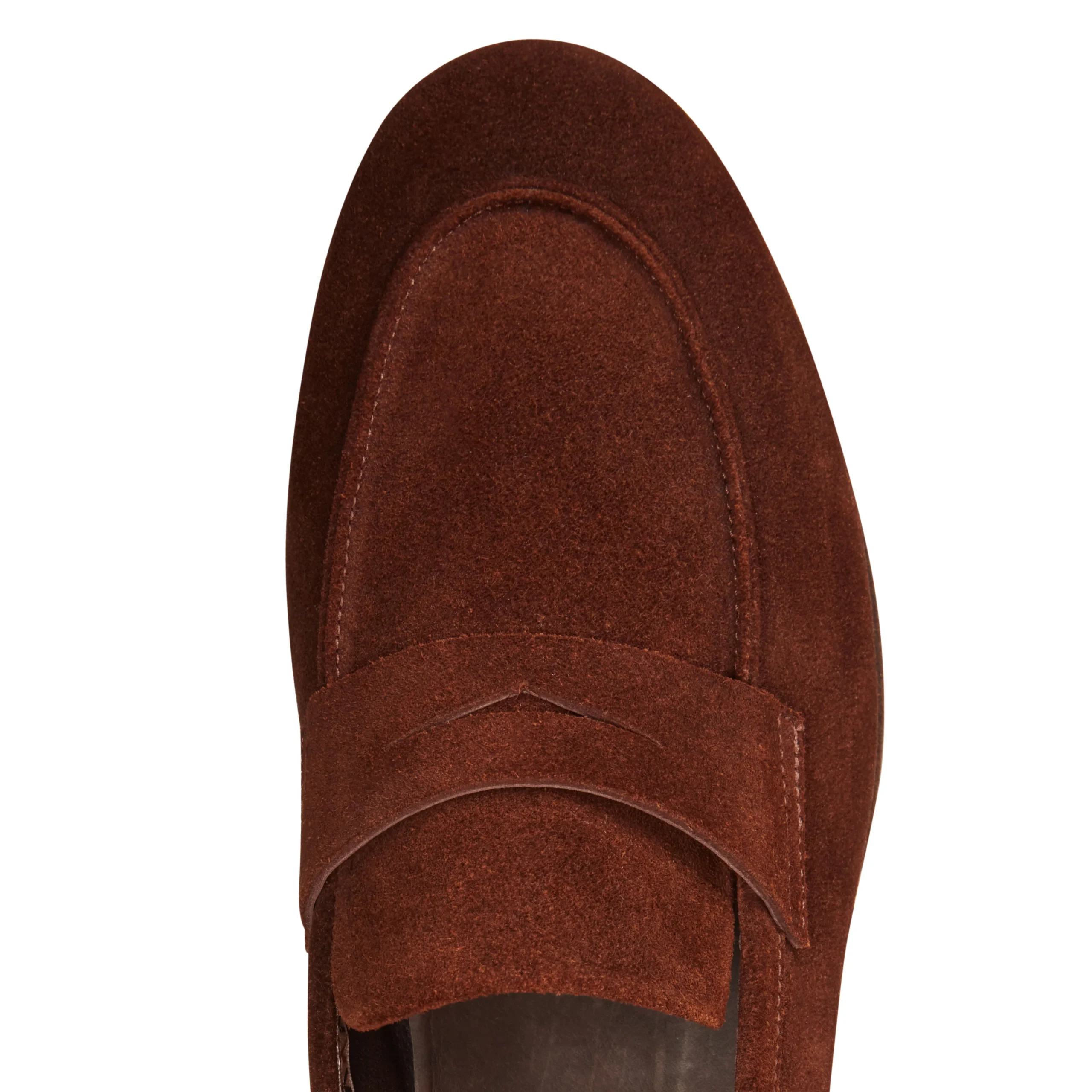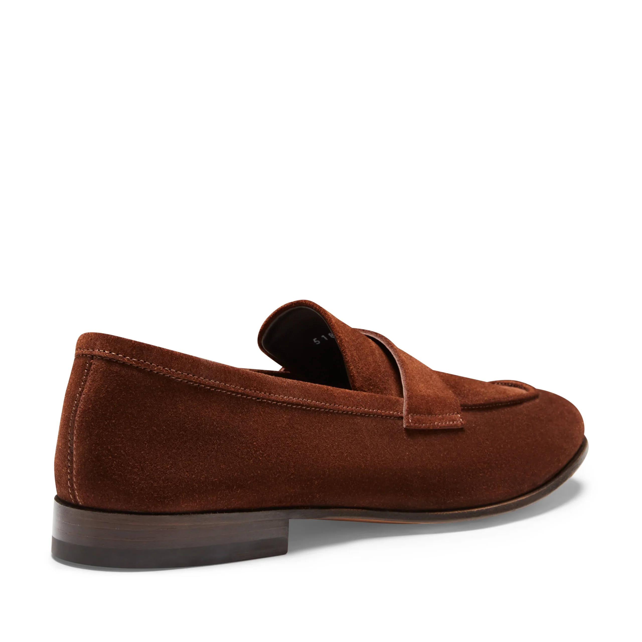 Mocassino con fascetta dalla forma tonda, destrutturato e sfoderato della linea Estate. Calzatura realizzata in morbida pelle scamosciata color castagna, leggera e flessibile. Profilo logato all’interno.